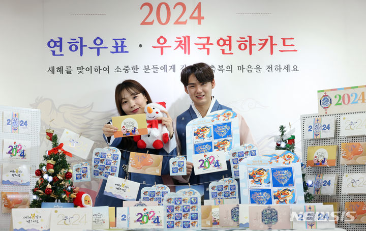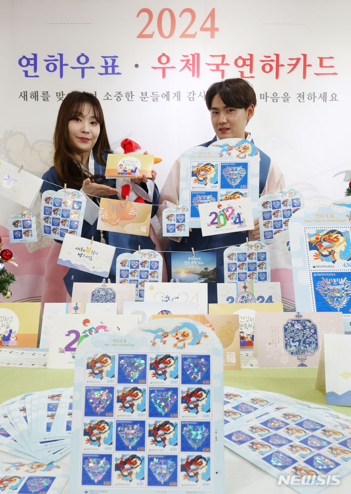 ソウル市中区のソウル中央郵便局切手博物館で30日、韓服(韓国の伝統衣装)を着たコンパニオンたちが2024年の年賀切手・年賀カードをPRした。郵政事業本部は、2024年(甲辰)を迎えるに当たり、竜をテーマにした年賀切手2種類、年賀カード・葉書10種類を12月1日に発行する。