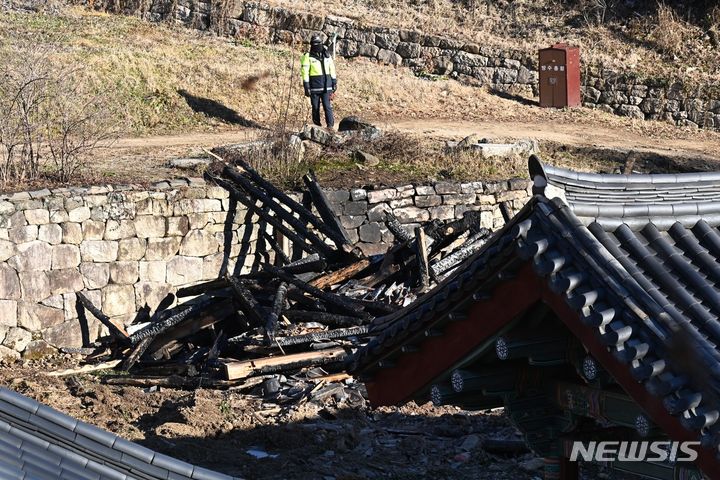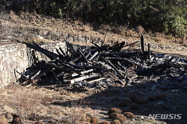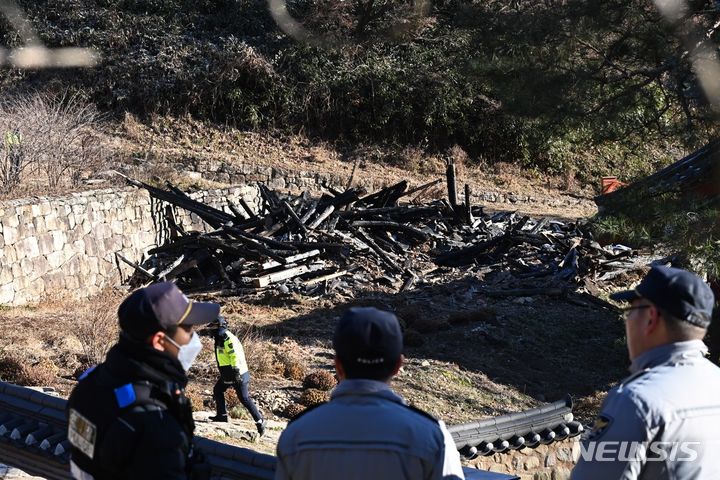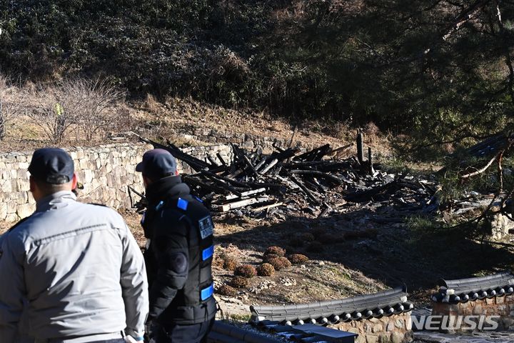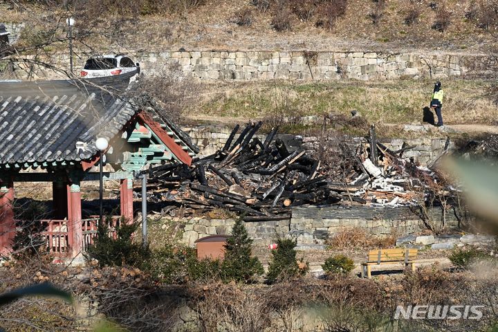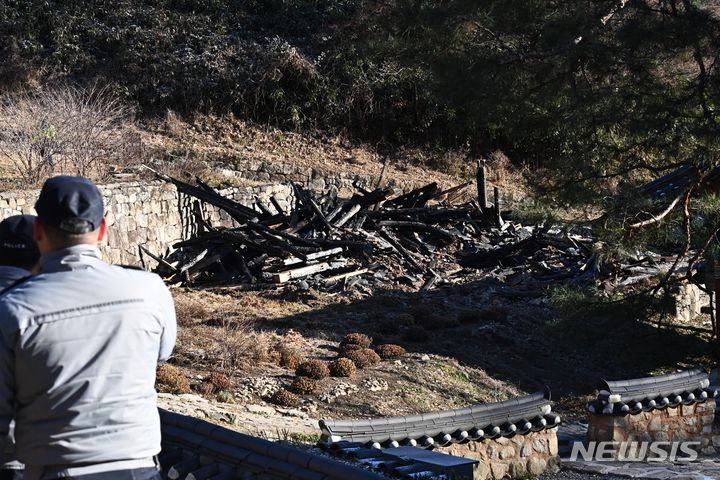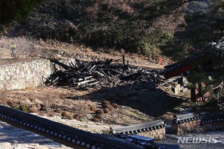 京畿道安城市竹山面七長里にある七長寺の寮舎(僧侶の宿舎)が29日午後に発生した火災により全焼した。写真は30日、火災現場の様子。