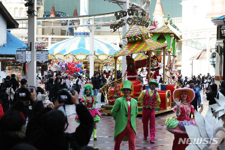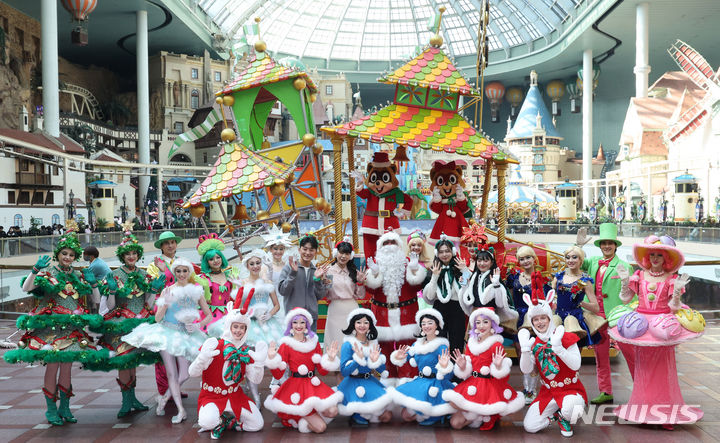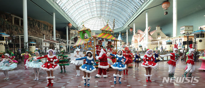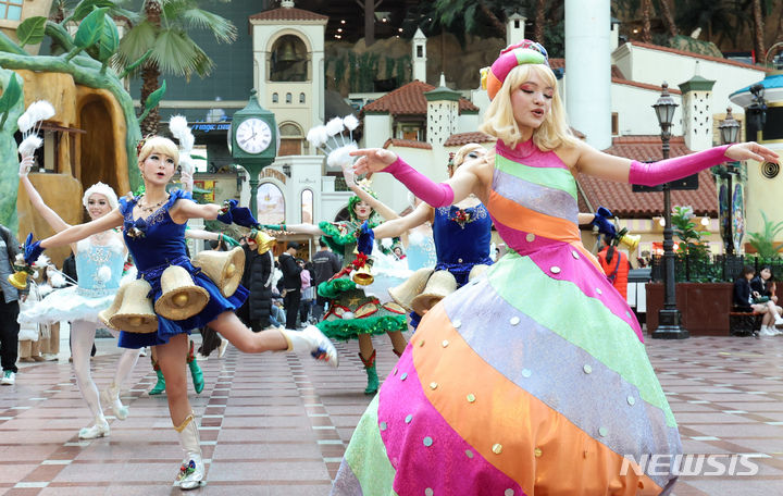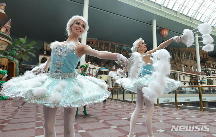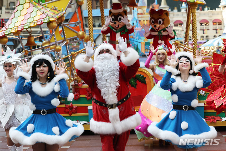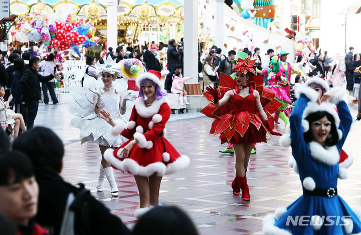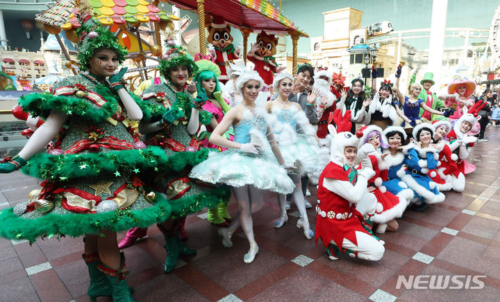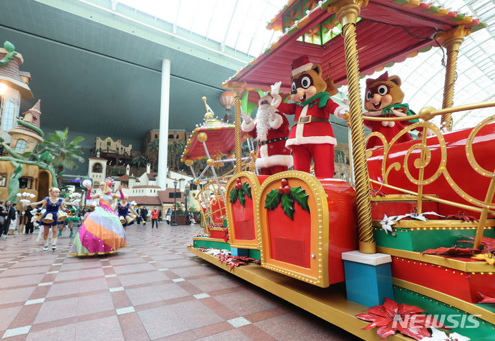 30日午前、ソウル市松坡区のロッテワールド・アドベンチャーで開かれた「ミラクル・ウィンター」クリスマスパレードで公演を繰り広げるキャストの様子。