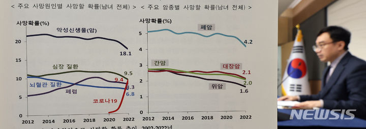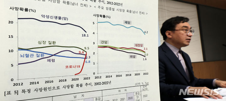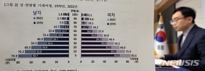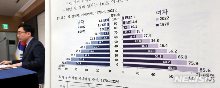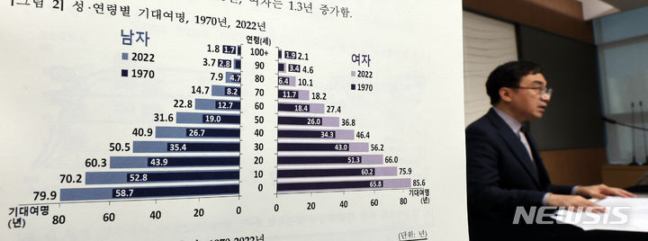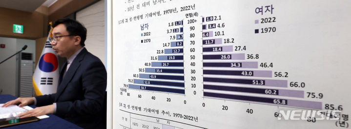 統計庁のイム・ヨンイル人口動向課長が1日、世宗市の政府庁舎で2022年生命表作成結果を発表した。韓国人の期待寿命は経済協力開発機構(OECD)平均に比べ、男性は1.9年(79.9年)、女性は2.4年(85.6年)高いことが分かった。