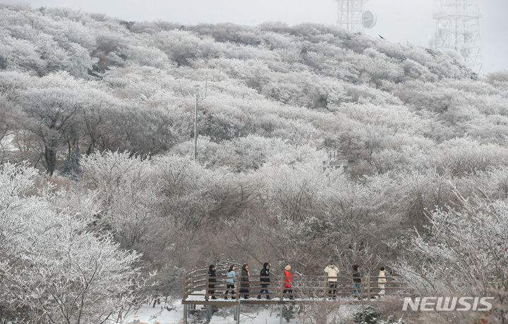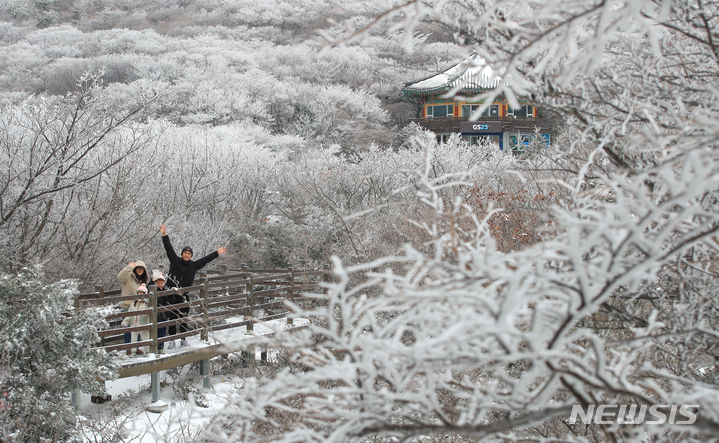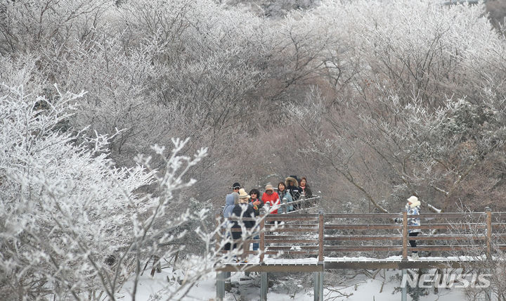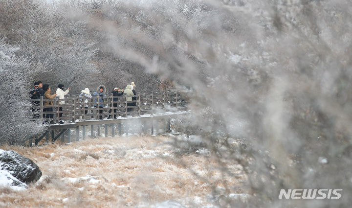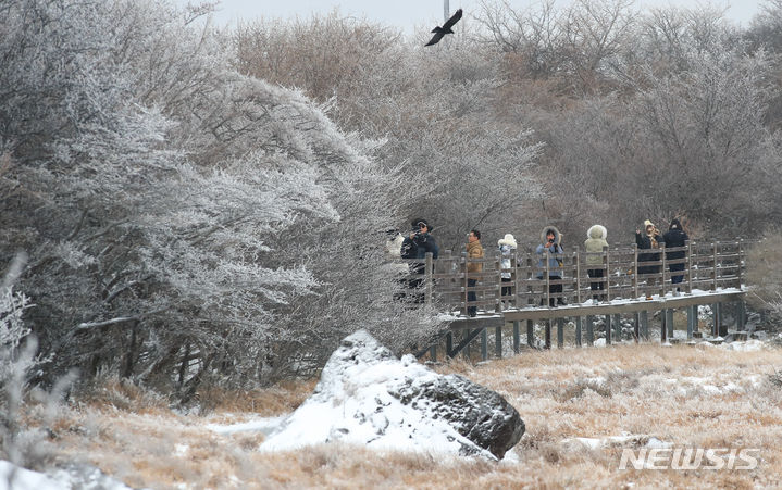 済州の山間地域にかなりの雪が降った1日午前、済州・漢拏山1100高地の湿地では、観光に訪れた人々が「雪の花」を鑑賞しつつ楽しいひとときを過ごしていた。