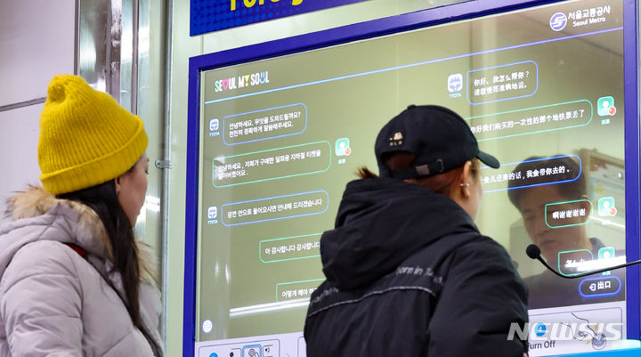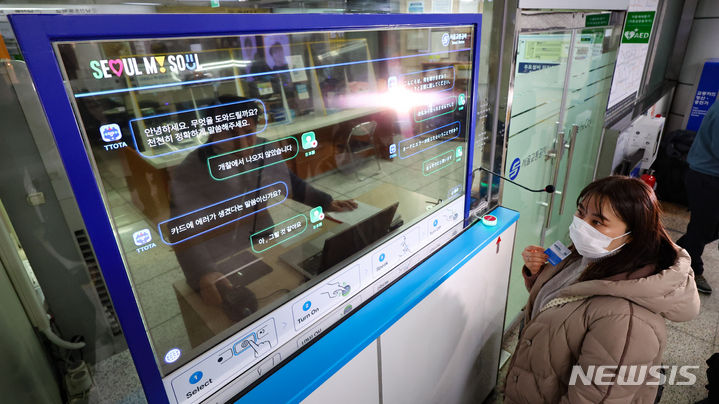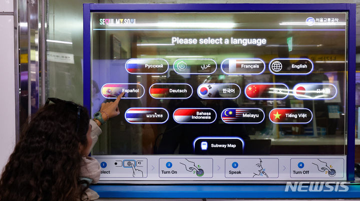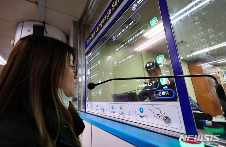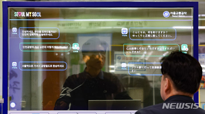 4日午後、ソウル地下鉄4号線明洞駅で「外国語同時対話システム」を利用している外国人観光客の様子。この日から明洞駅で試験運用に入った外国語同時対話システムは、透明OLEDディスプレイを通して外国人と職員が自国語で同時にコミュニケーションできるもので、13か国語に対応している。