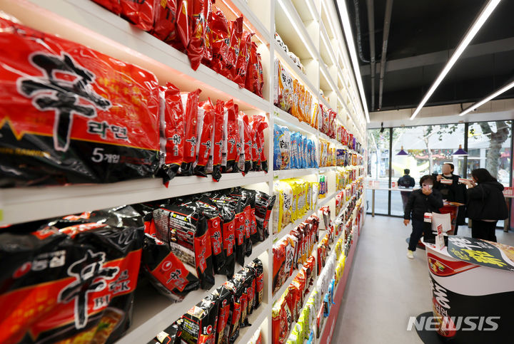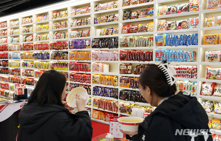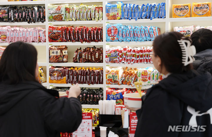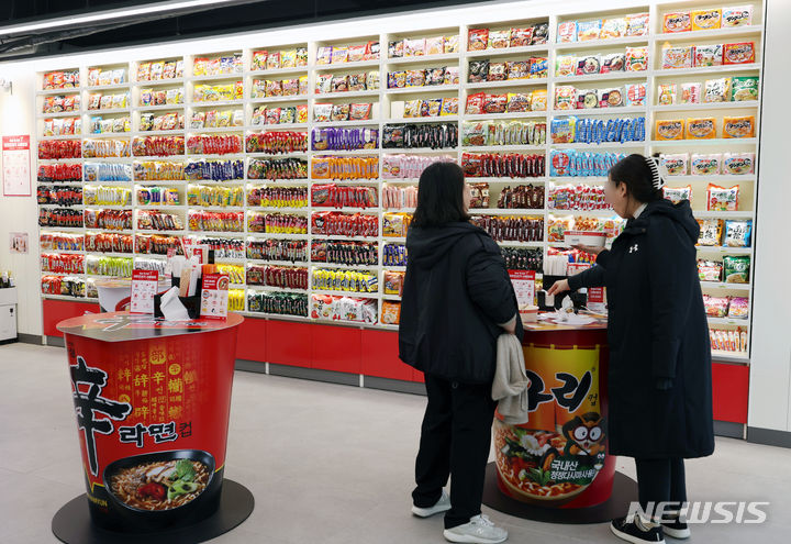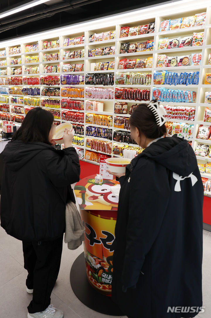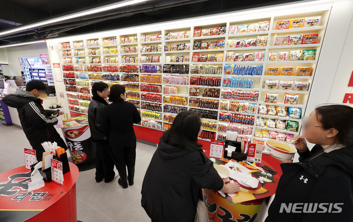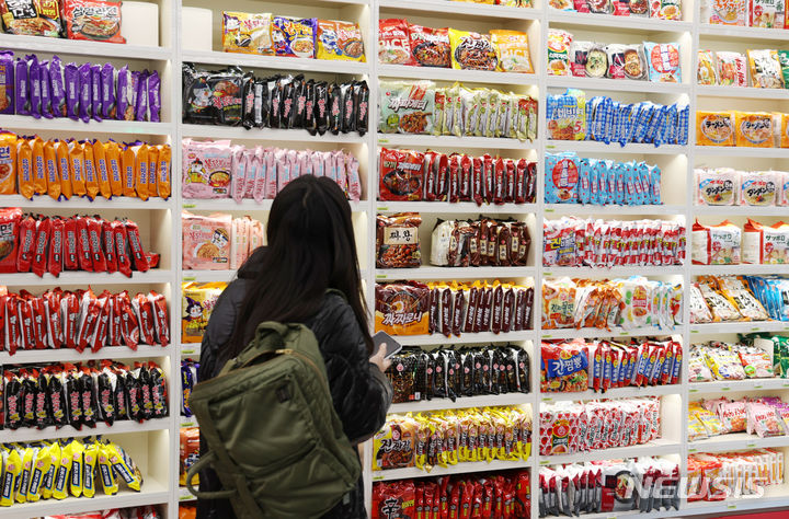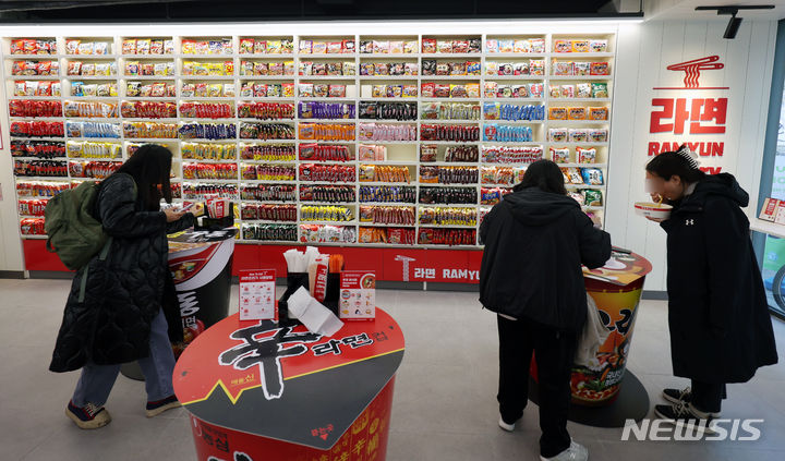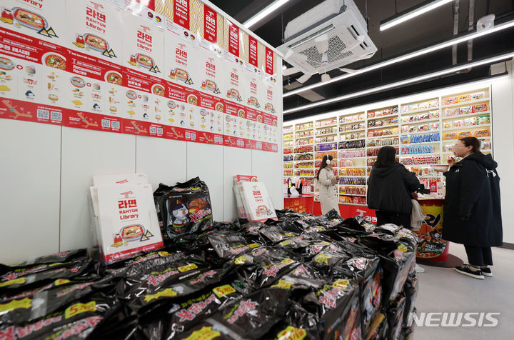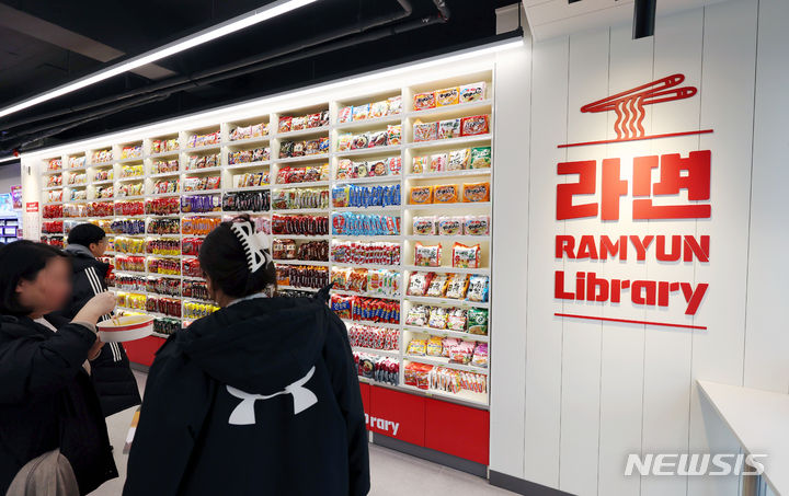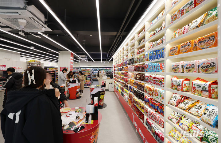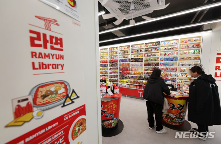 韓国のコンビニ大手CUが、ラーメンをテーマにした、業界初の「Kラーメン特化コンビニ(CU弘大想像店)」をソウル市麻浦区弘大にオープンさせた。「ラーメン・ライブラリー」をコンセプトに、韓国内外で人気の袋ラーメンおよそ100種類を網羅した差別化コンビニのモデルだ。写真は5日、CU弘大想像店で従業員が商品のラーメンを整理している様子。