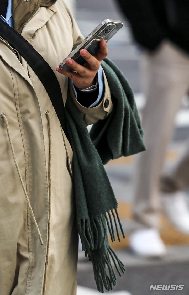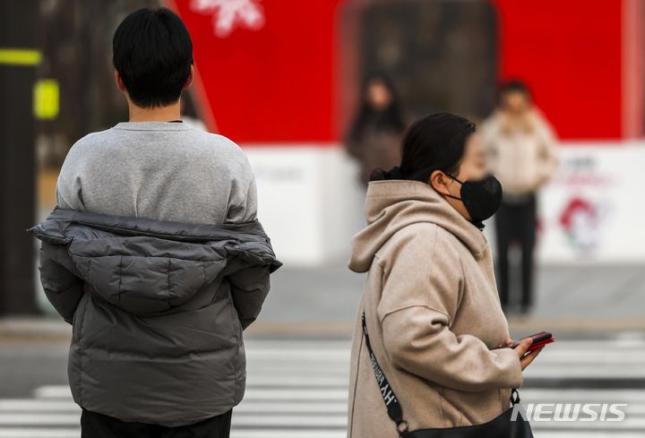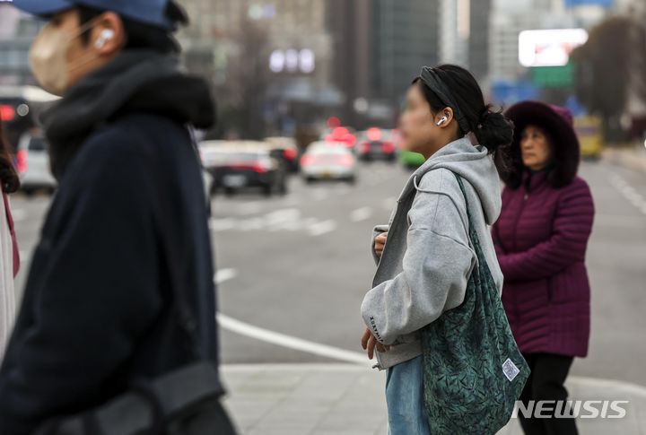 【NEWSIS】日中の最高気温が21℃まで上昇すると予想された8日、ソウル市鍾路区の光化門交差点では、上着を脱ぐ人の姿も見られた。