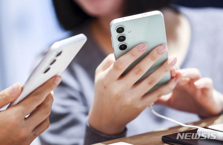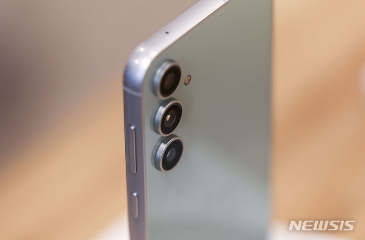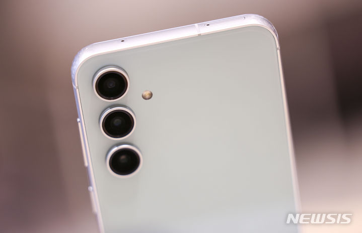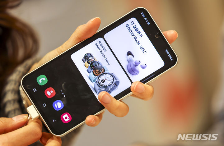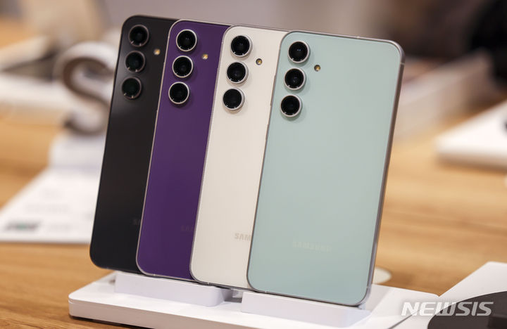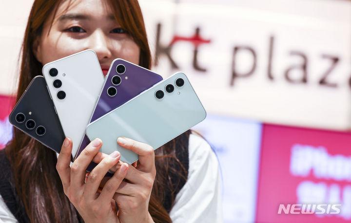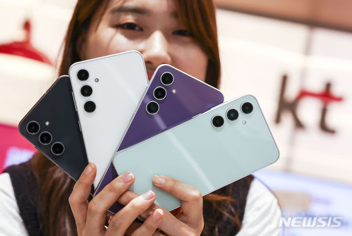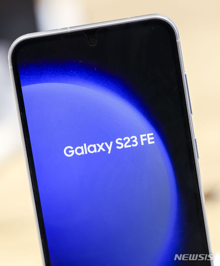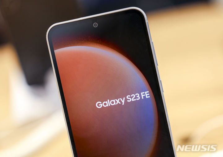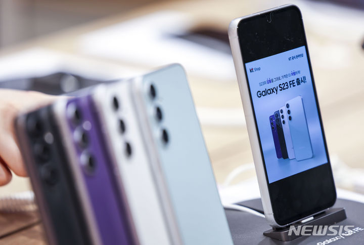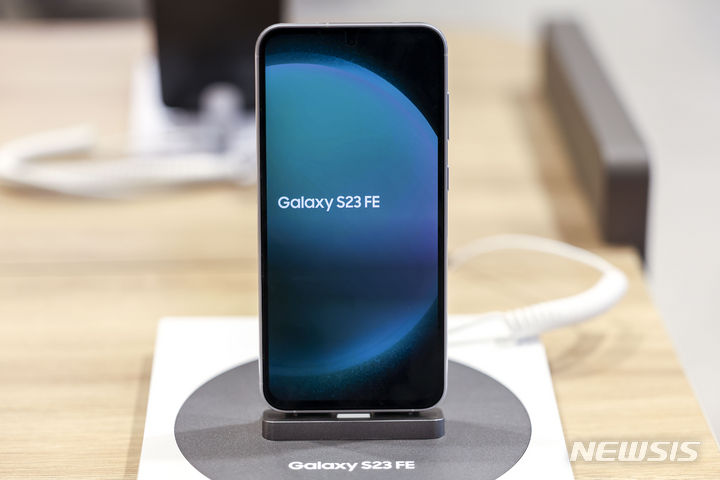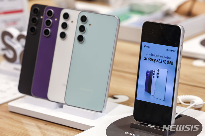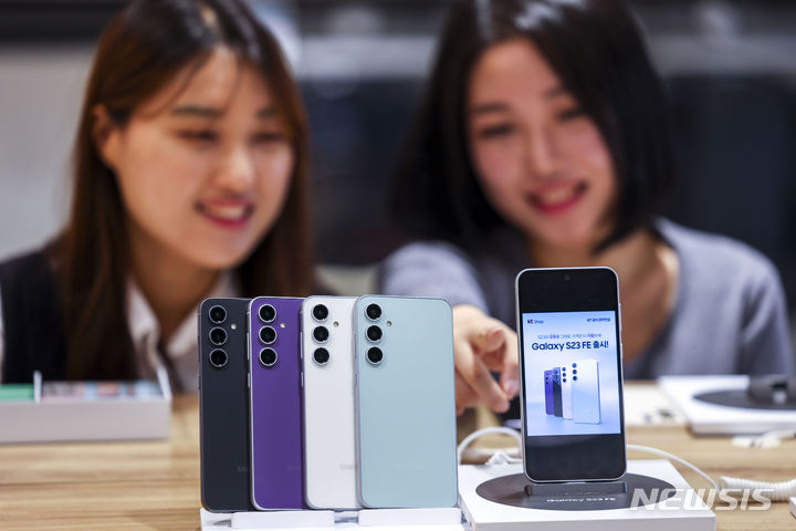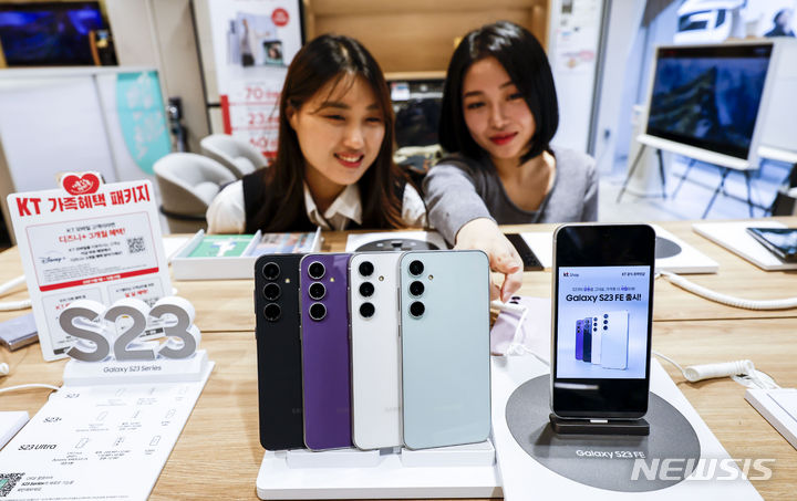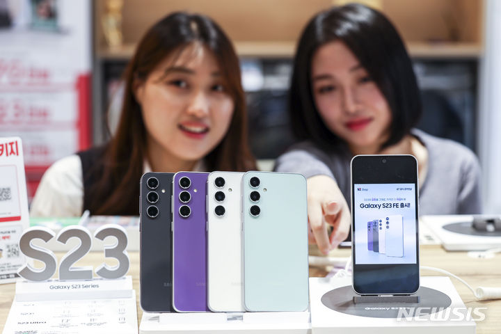 ソウル市鍾路区のKTプラザ光化門駅店で8日、サムスンのGalaxy S23 FE(Fun Edition)と共にポーズを取ってみせるコンパニオンの様子。サムスン電子は8日、準フラッグシップ級スマートフォン「Galaxy S23 FE」を韓国国内で発売する。カラーはミント、グラファイト、パープル、クリームの4色で、ストレージ容量は256ギガバイト、出庫価格は84万7000ウォン(現在のレートで約9万3200円)。8日から韓国各地のサムスンストアとサムスン・ドットコム、移動通信会社のオンラインおよびオフライン売場やオープンマーケットなどで購入できる。