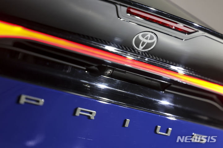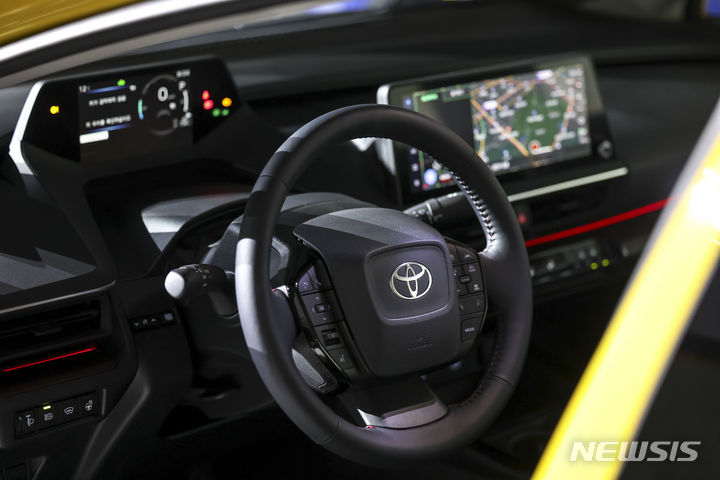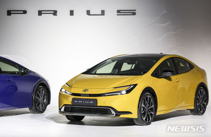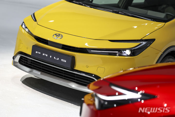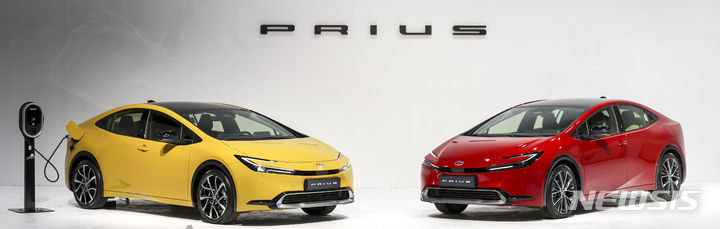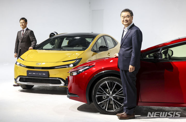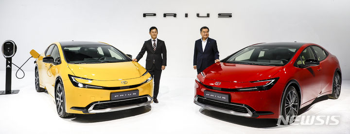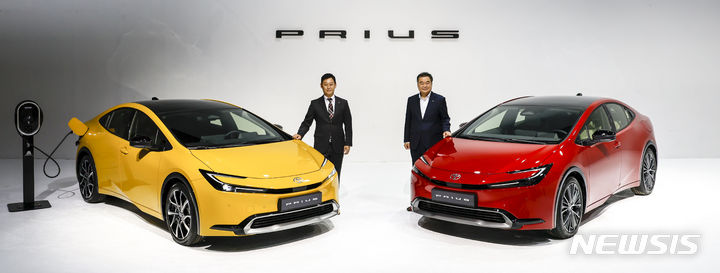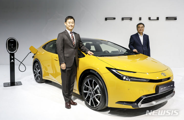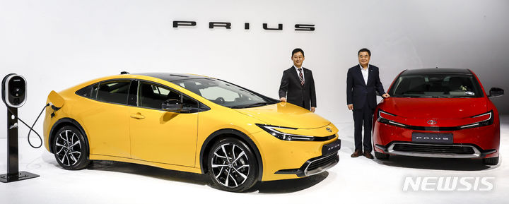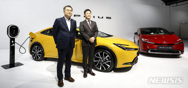 【NEWSIS】韓国トヨタ自動車では13日、ソウル市広津区のパイ・ファクトリー・スタジオで、「トヨタ5代目プリウス・メディア・カンファレンス」を開催した。写真は5代目プリウスの前でポーズする韓国トヨタ自動車の今山学代表取締役社長と、開発責任者の大矢賢樹トヨタ自動車TC製品企画主査。
