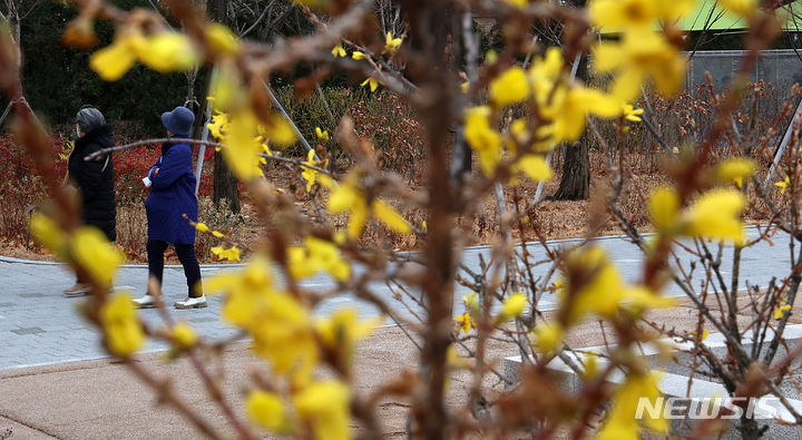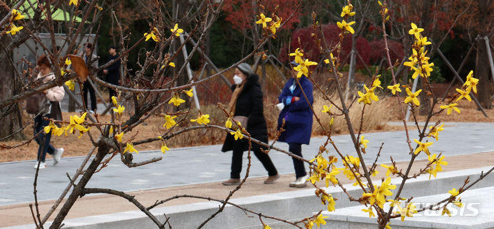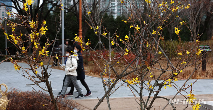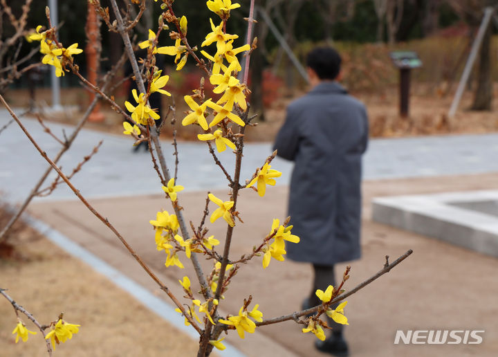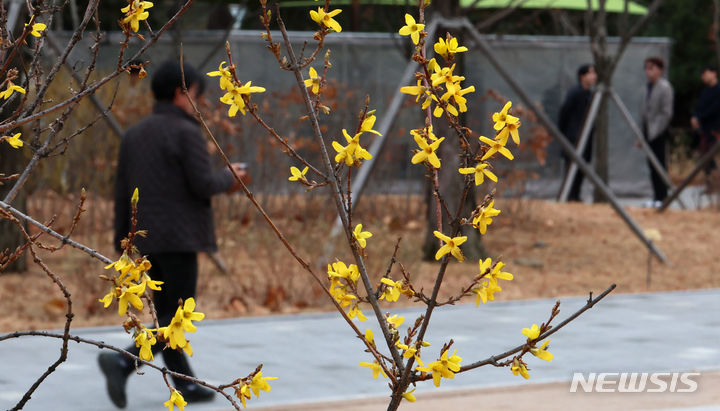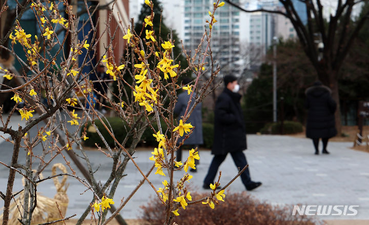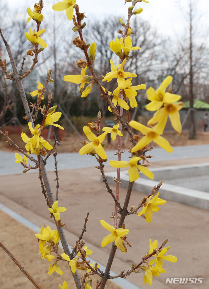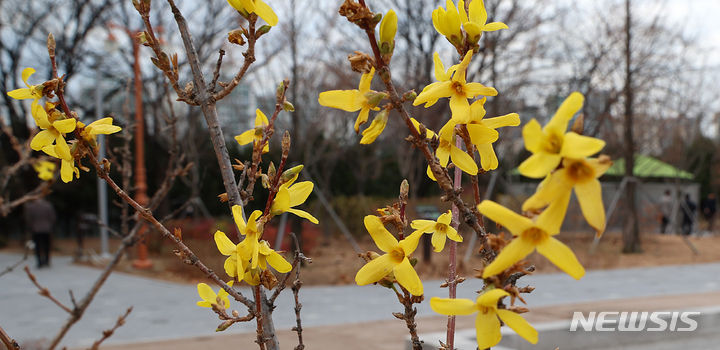 温かい天気が続いている13日、ソウル市汝矣島の韓国国会疎通館近くでは、レンギョウの花が咲いていた。