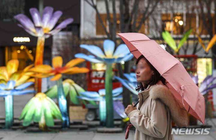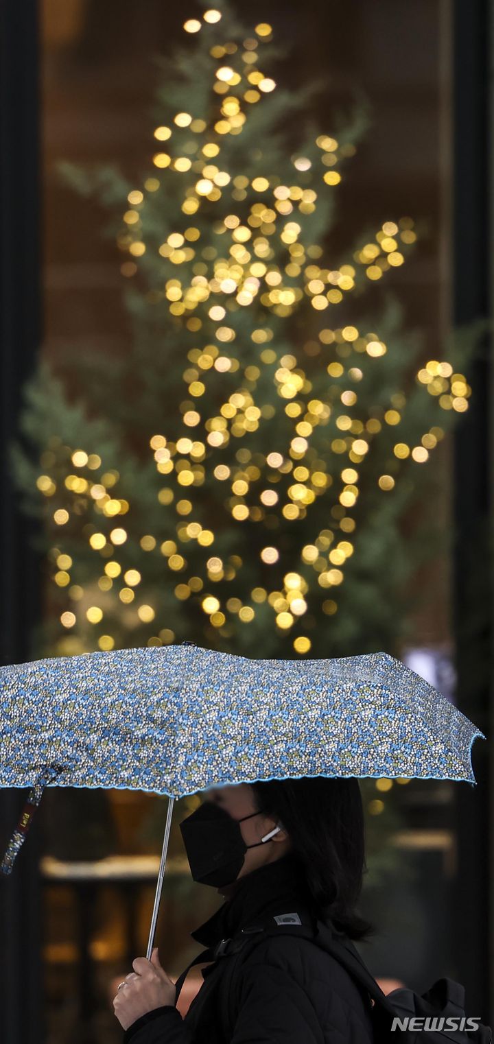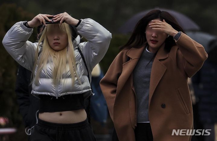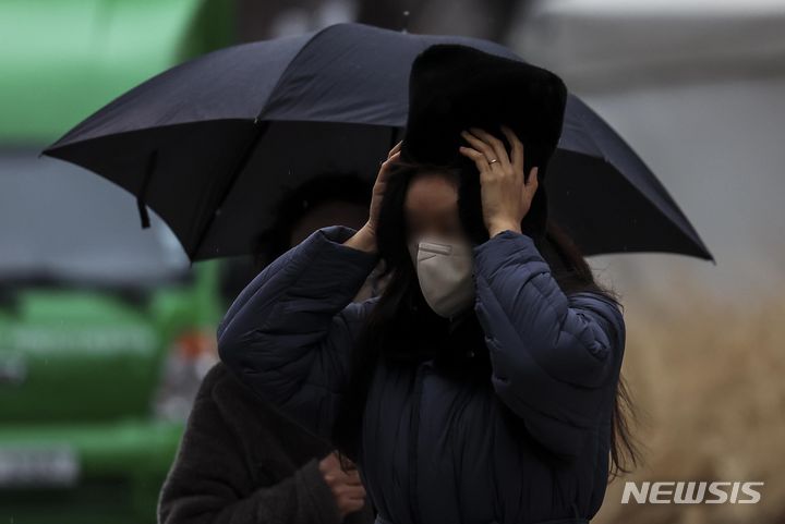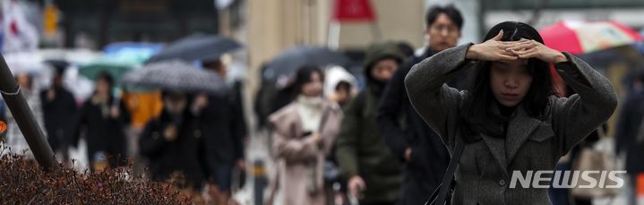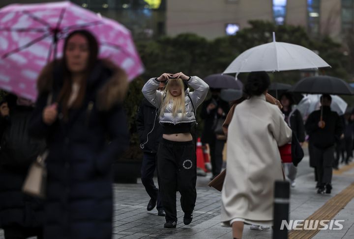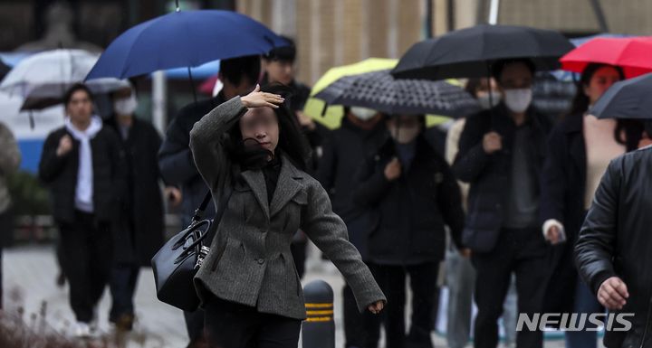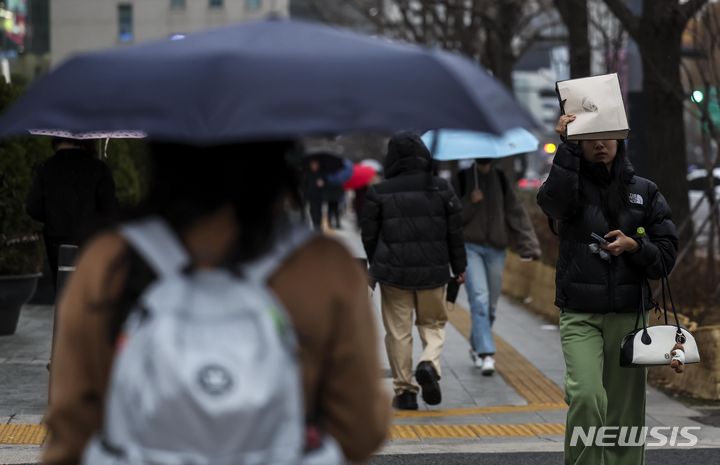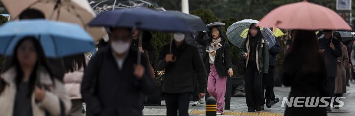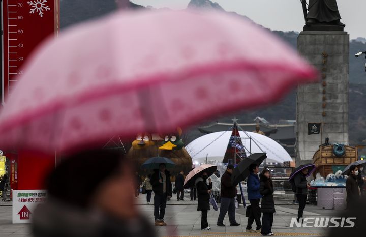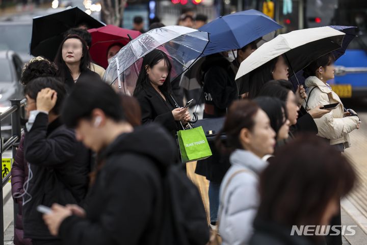 【NEWSIS】雨が降った14日午前、ソウル市鍾路区の光化門交差点で、傘をさして信号待ちをする人々。