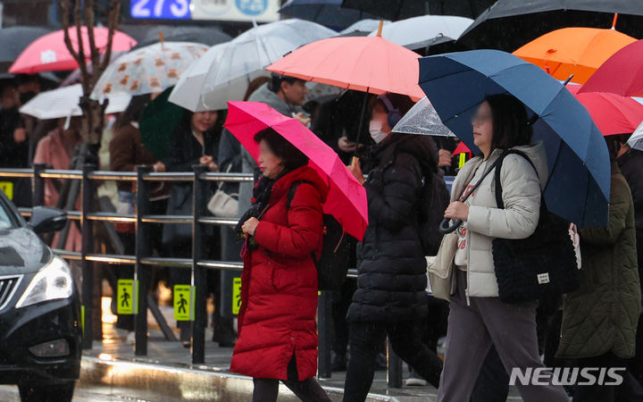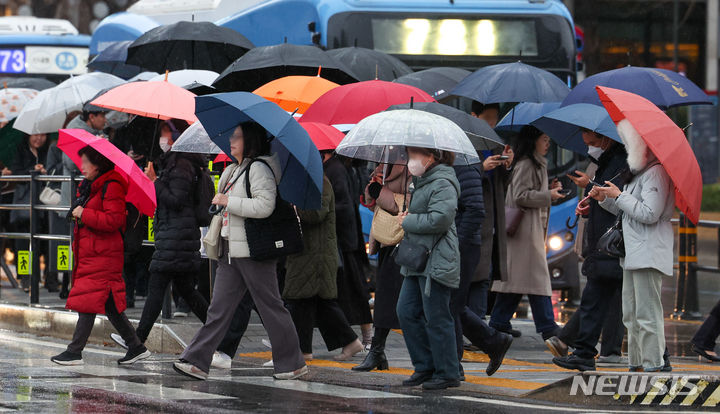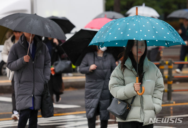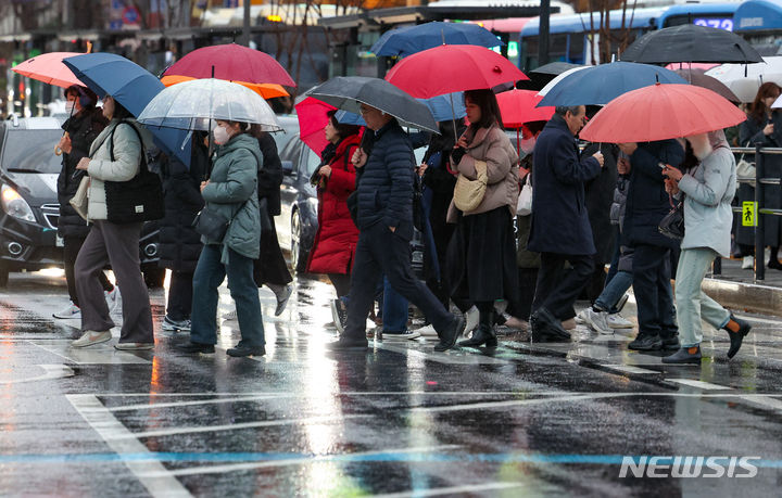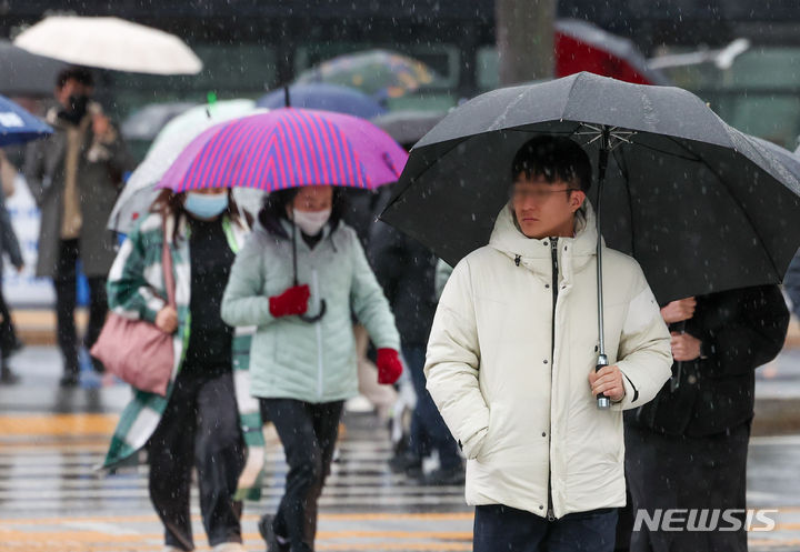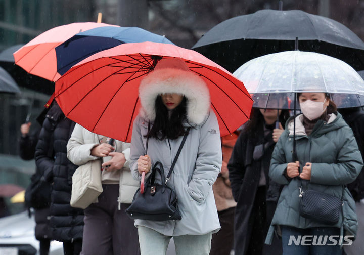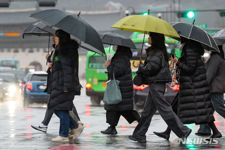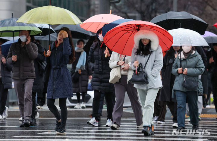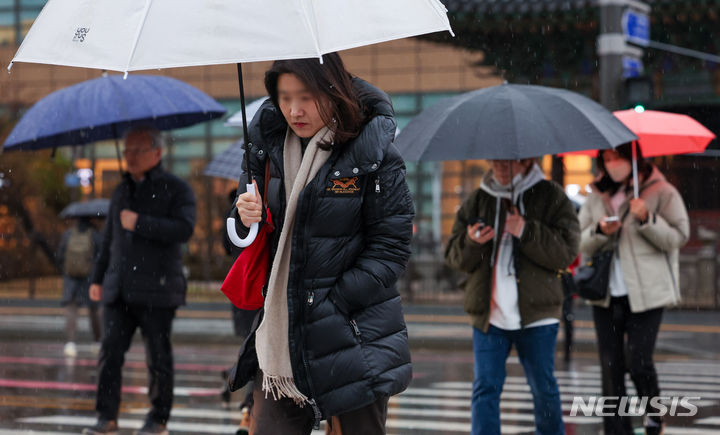 ソウル市鍾路区の世宗路交差点で15日午前、傘を差した市民たちが足早に歩く様子が見られた。気象庁は、冬の雨が今晩から小康状態になり、明日から気温が氷点下となる寒波が訪れるとの予報を発表した。
