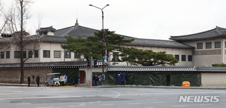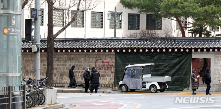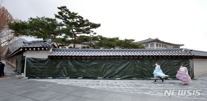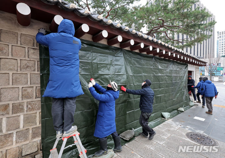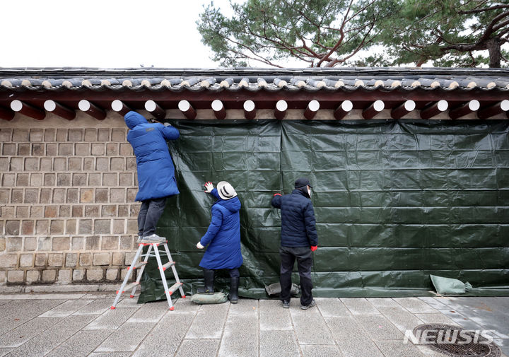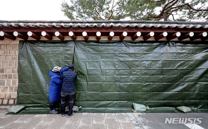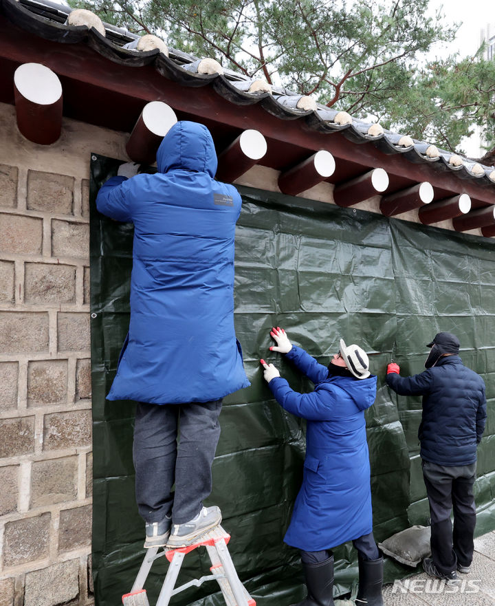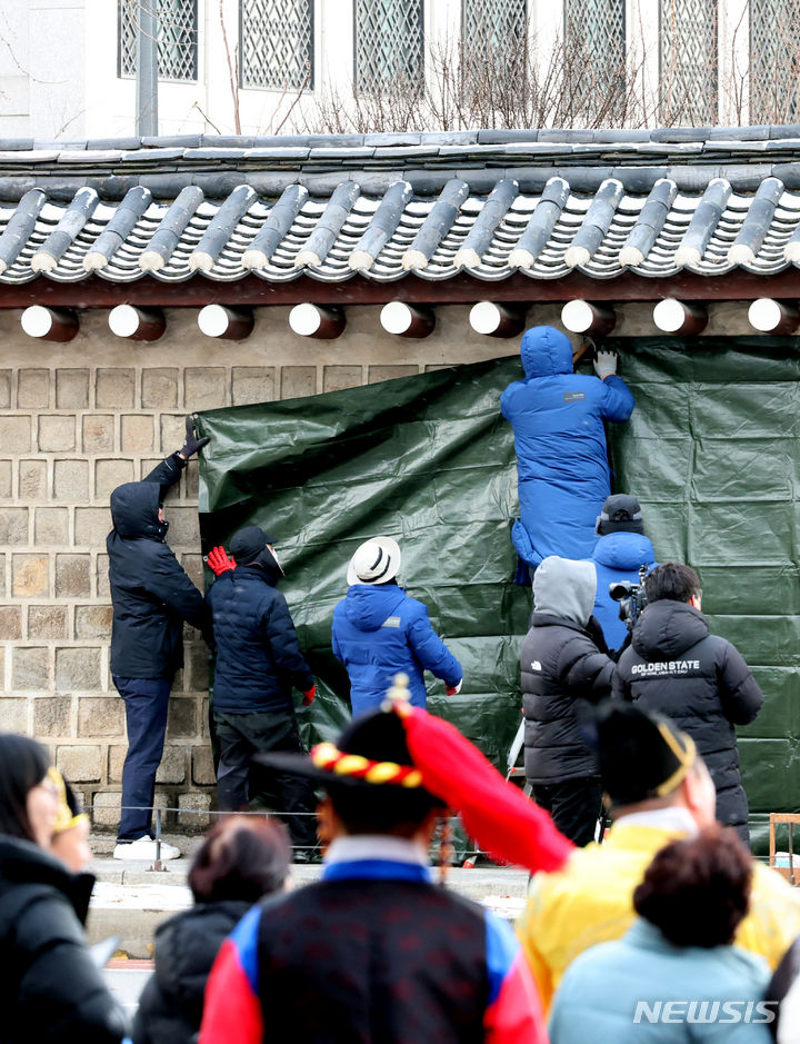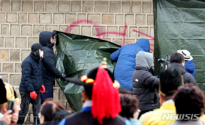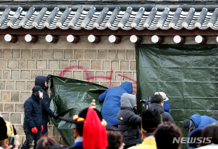 文化財庁宮陵遺跡本部の関係者たちが16日午前、ソウル市鍾路区にある国立古宮博物館近くの景福宮西側の塀がスプレーで落書きされたのを受け、布で覆っている。