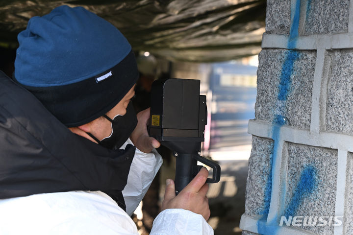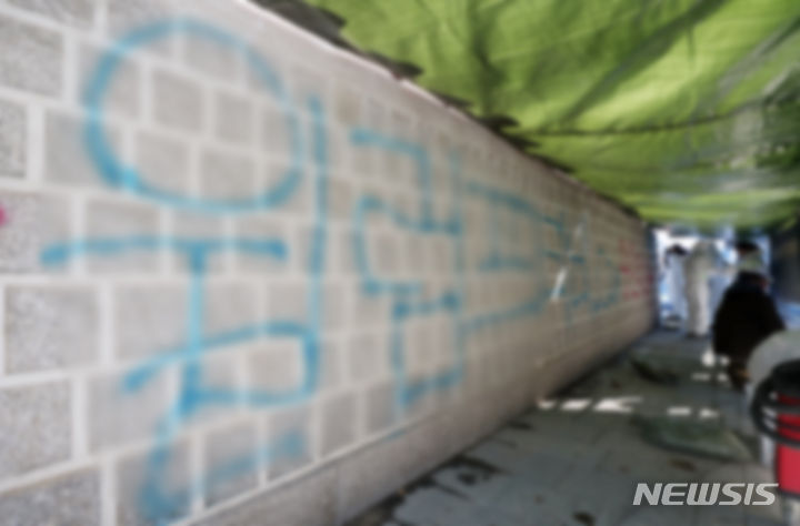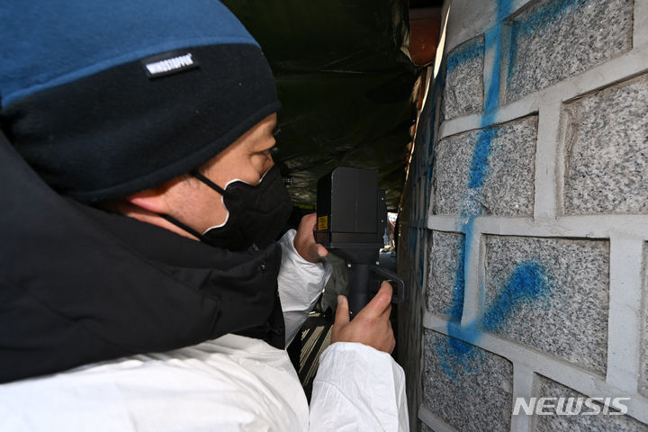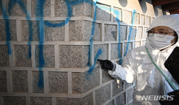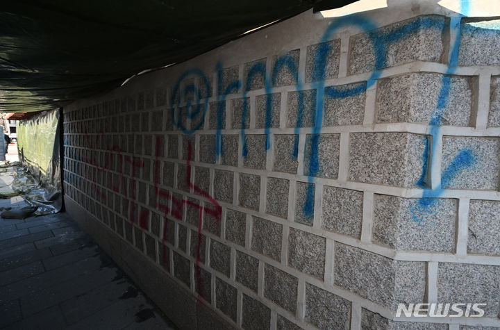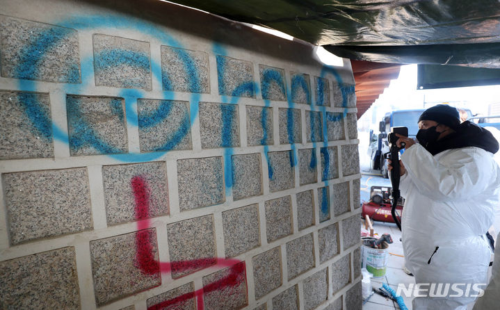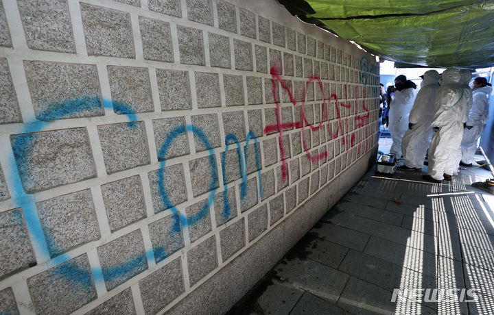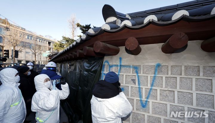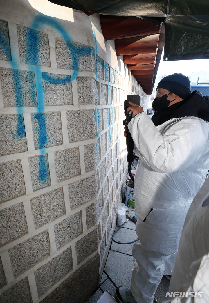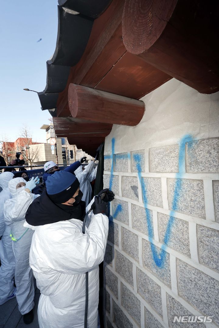 【NEWSIS】17日午前、ソウル市鍾路区の景福宮西側の塀で、落書きを消す韓国文化財庁の作業員たち。