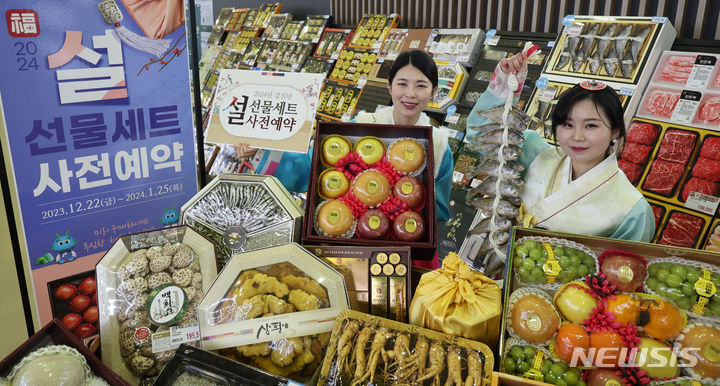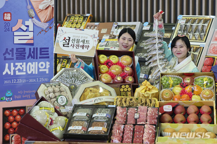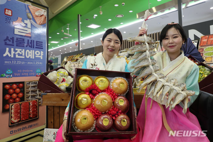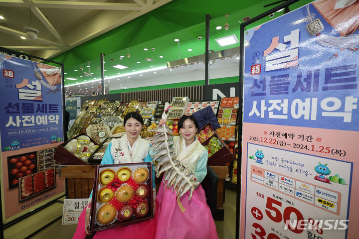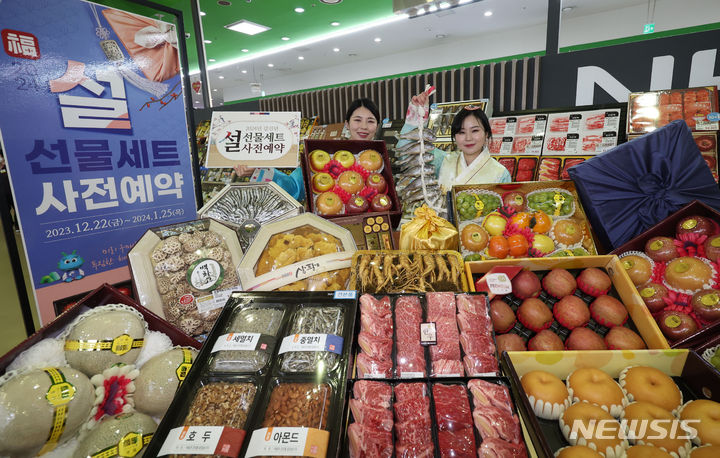 ソウル市瑞草区の大手スーパー「農協ハナロマート良才店」で19日、旧正月のギフトセットの事前予約をPRする従業員の様子。農協流通は今月22日から2024年1月25日まで、行事カードでの購入時に最大50%割引と最大300万ウォン(現在のレートで約33万円)の農村愛商品券がもらえる旧正月ギフトセット事前予約イベントを行う。