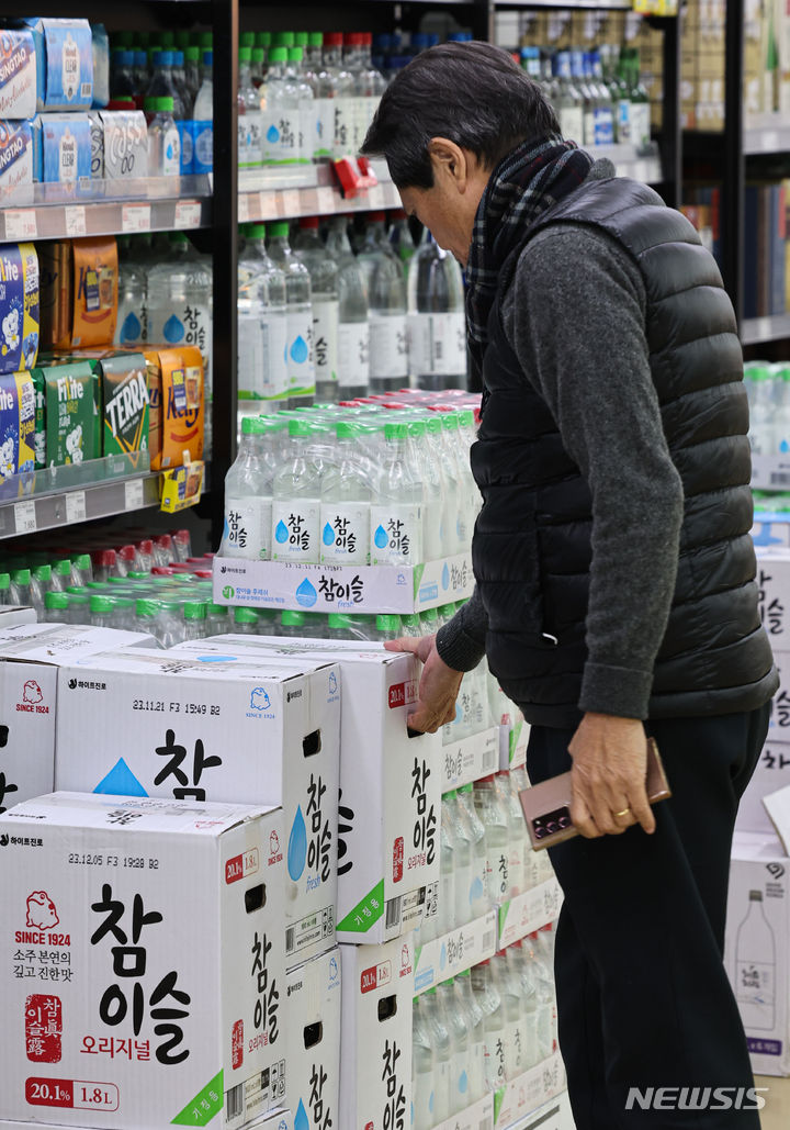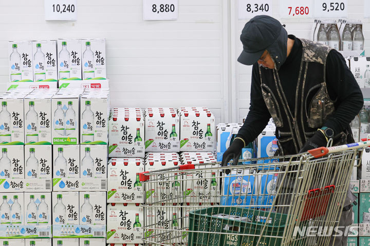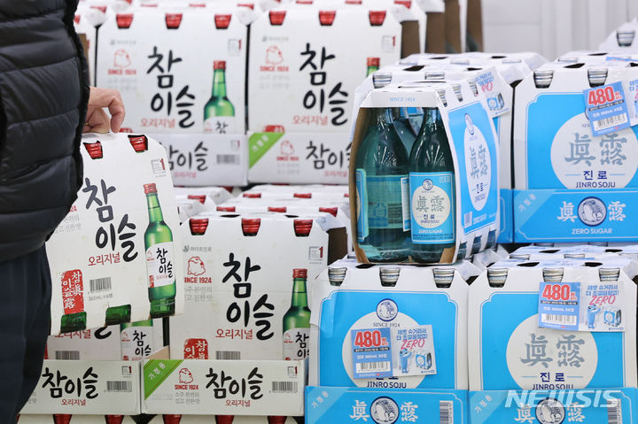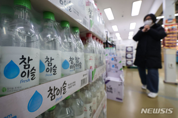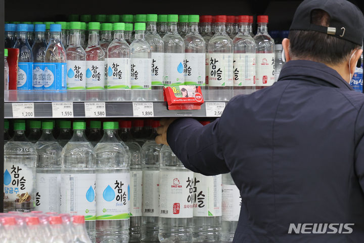 韓国政府が酒税法施行令・同施行規則を改正して基準販売比率制度を導入するのに伴い、ハイト眞露が来年1月1日からチャミスル、眞露など焼酒(韓国焼酎)製品の出庫価格を引き下げる。ハイト眞露が焼酒の出庫価格を下げるのは、チャミスルを発売した1998年以来初めて。写真は19日午後、ソウル市内の大手スーパーに陳列された焼酒の様子。