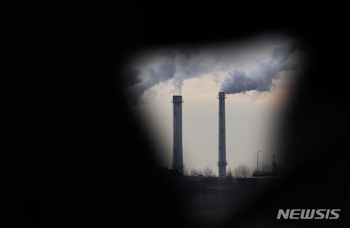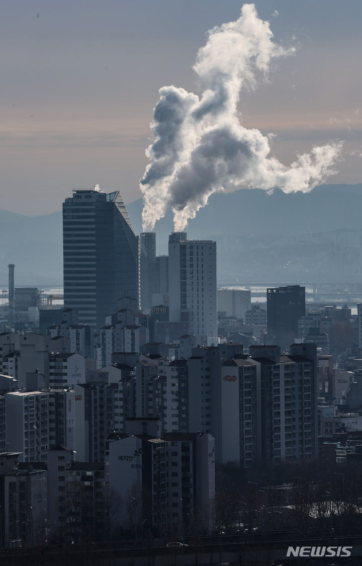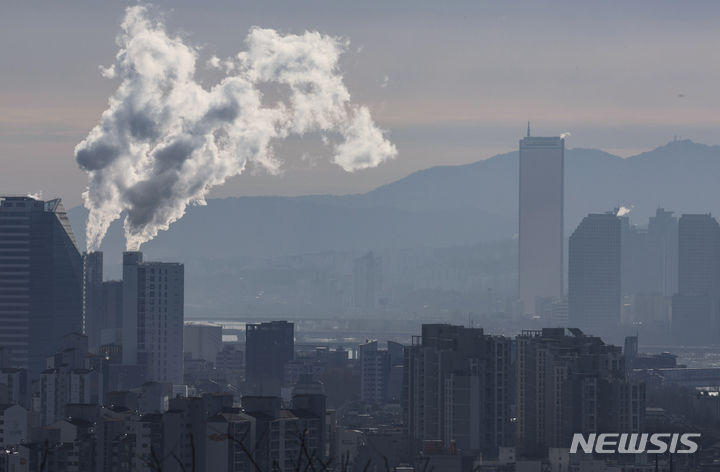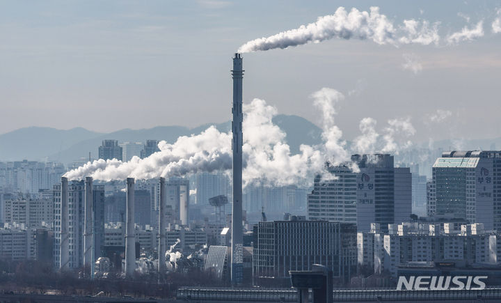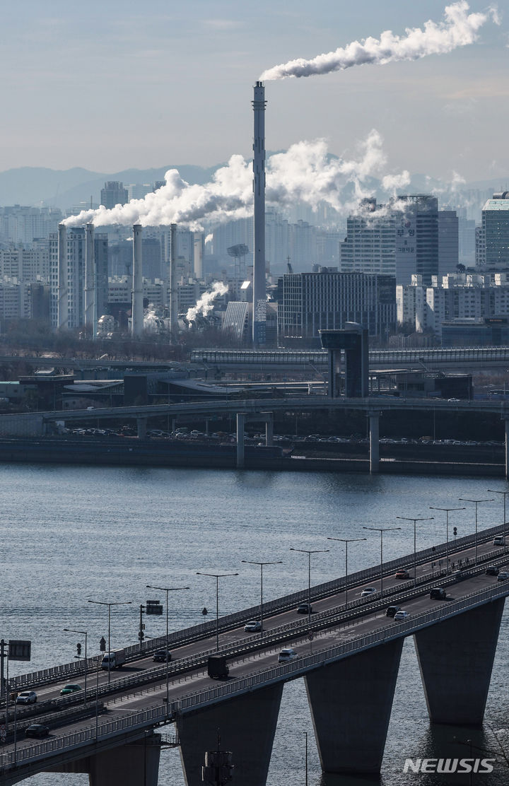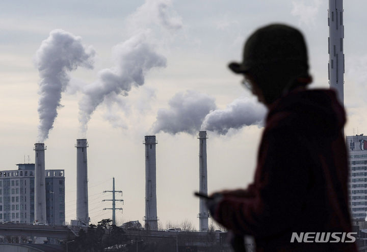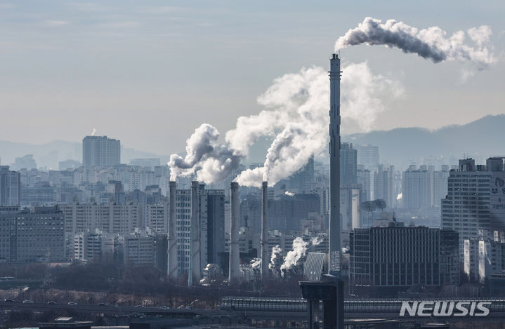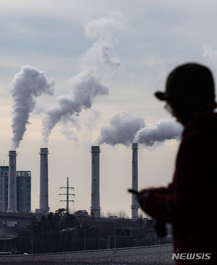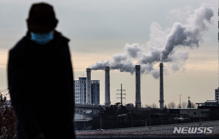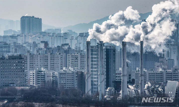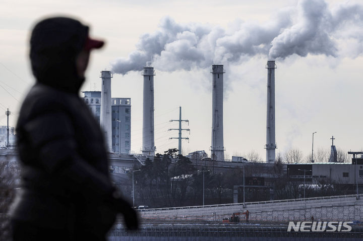 韓国各地で連日強い寒さが続いている19日、ソウル市陽川区にある熱電供給型天然ガス火力発電所の煙突から、水蒸気が立ち上っている様子。
