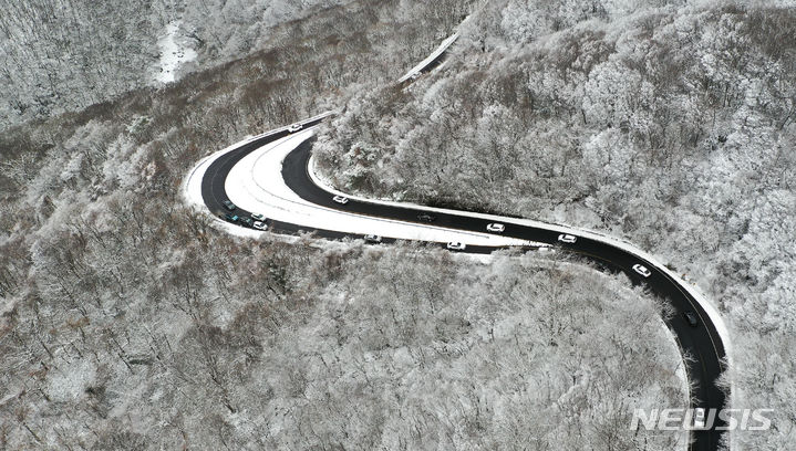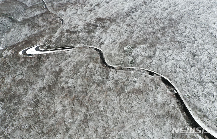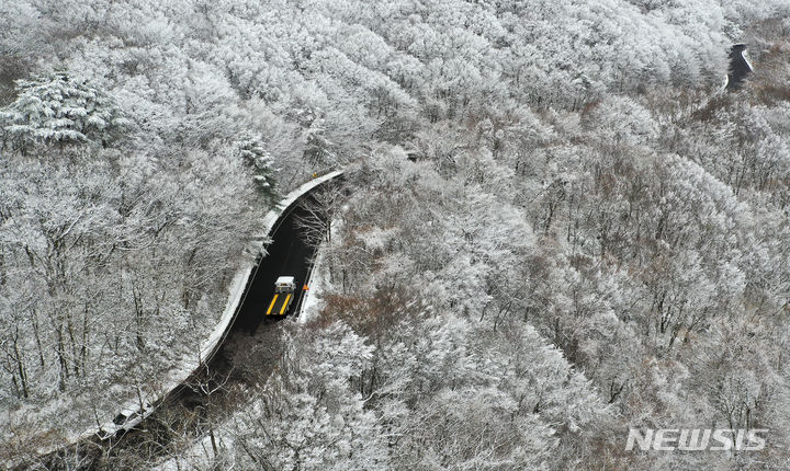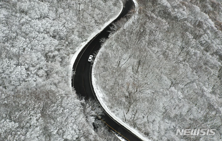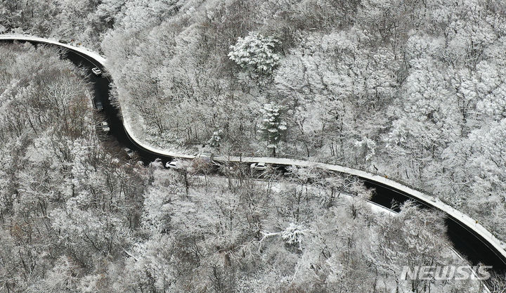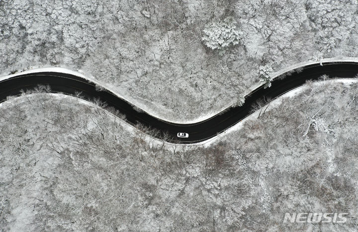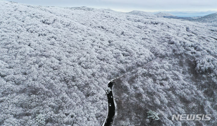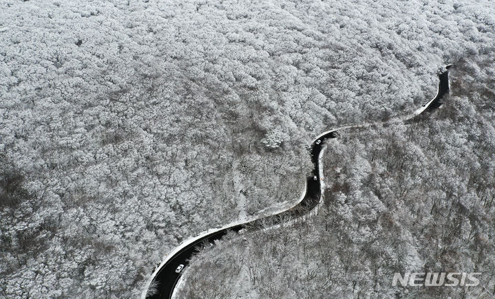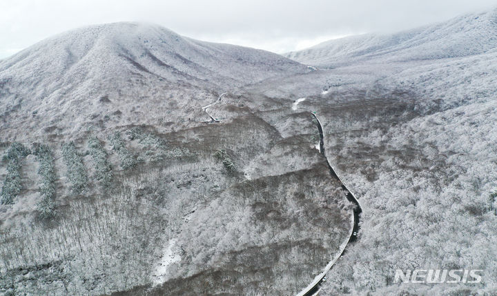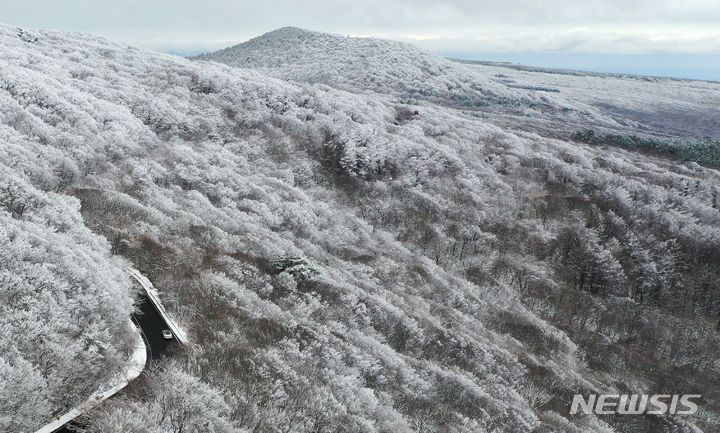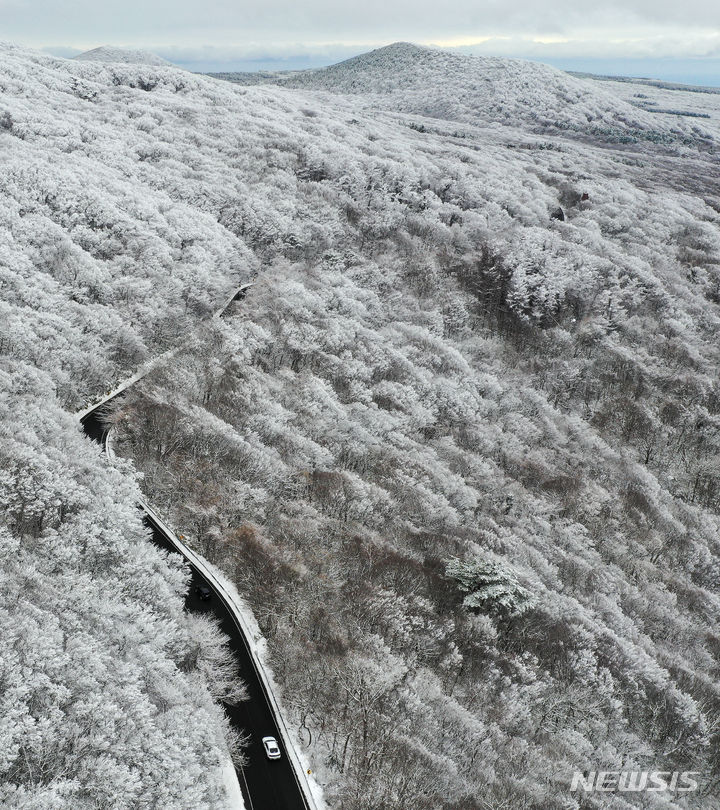 済州島の山間部に大雪が降った19日午後、漢拏山の1100道路周辺の谷は白い雪ですっかり覆われていた。