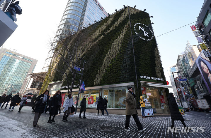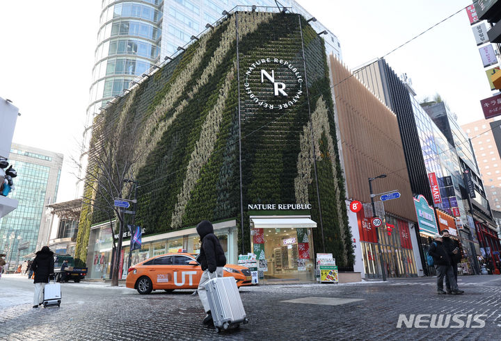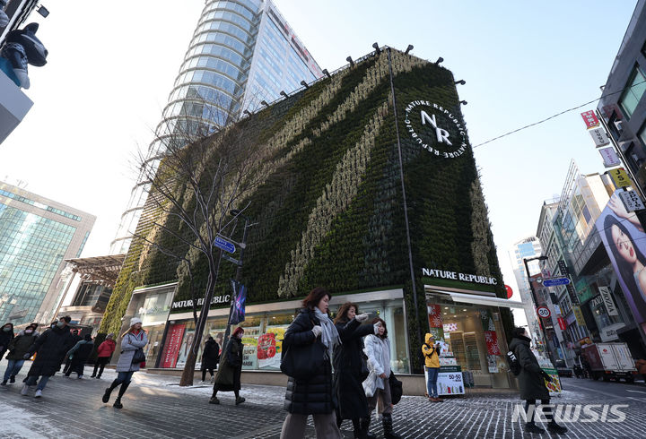ソウル市中区明洞(忠武路1街)に位置するコスメブランド「NATURE REPUBLIC」の敷地が、21年間にわたり地価トップの座を守っている。国土交通部(省に相当)が19日に発表した「2024年全国標準地公示地価」と題する資料によると、ソウル市中区忠武路1街の「NATURE REPUBLIC」の敷地(169.3平方メートル)の1平方メートル当たりの公示地価は1億7540万ウォン(約1943万円)で、全国標準地のうち最も高いことが分かった。写真は、明洞を訪れた観光客が該当の「NATURE REPUBLIC」店舗前を通り過ぎる様子。