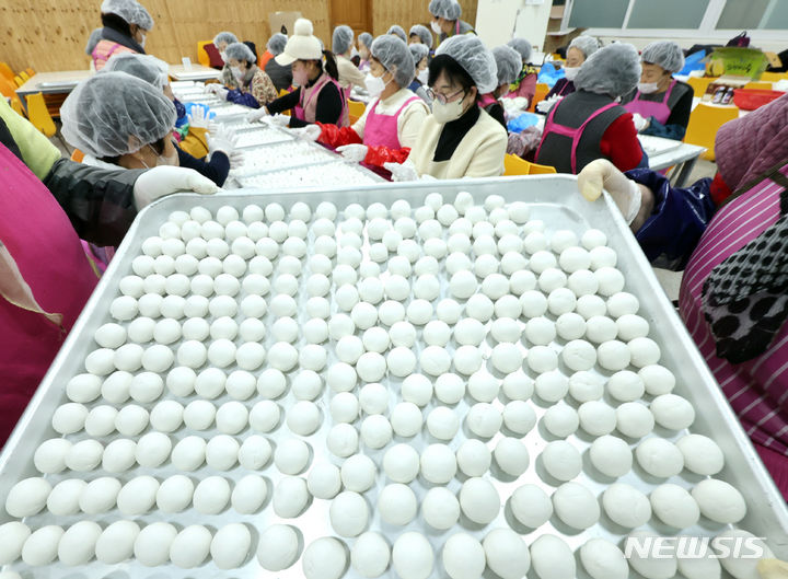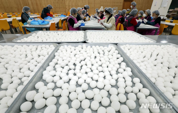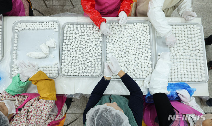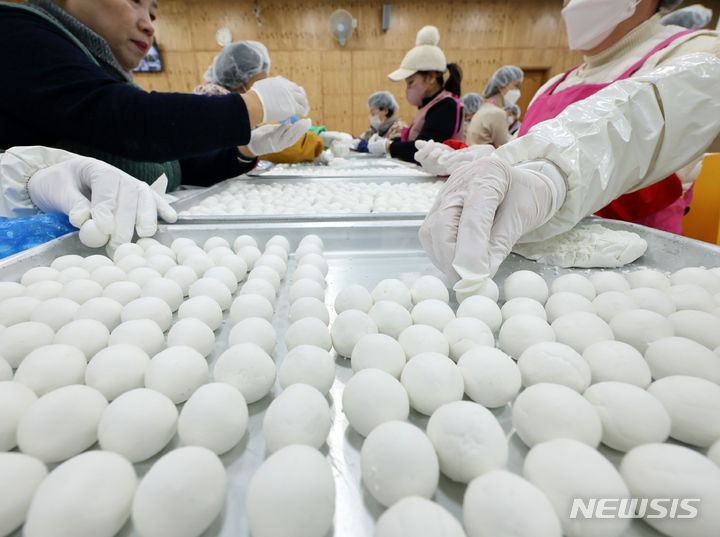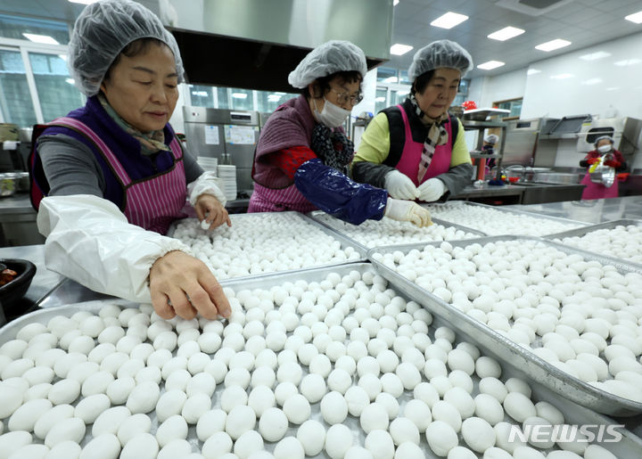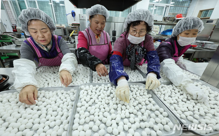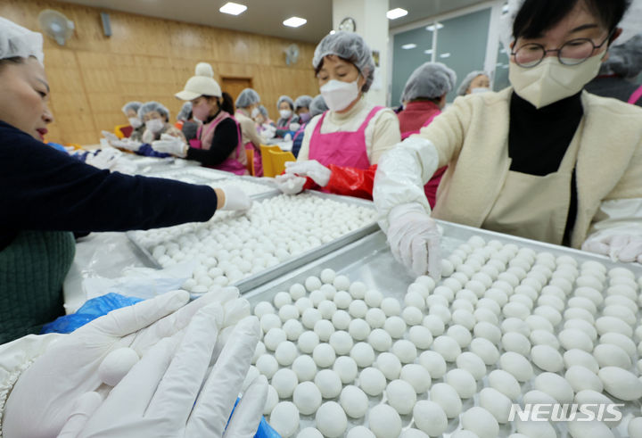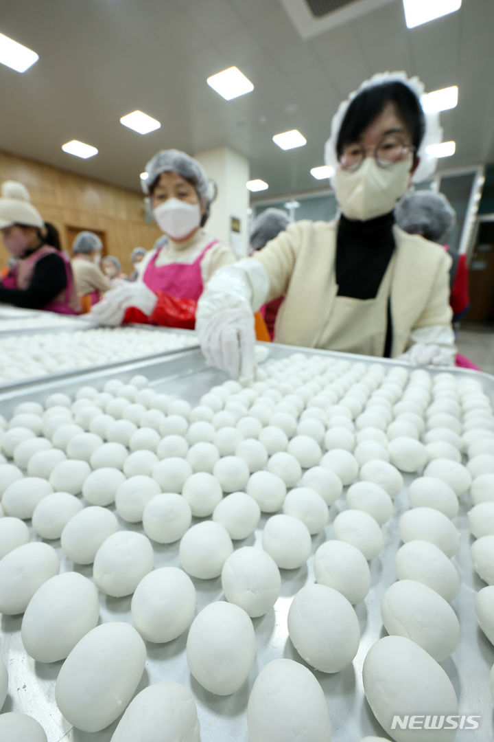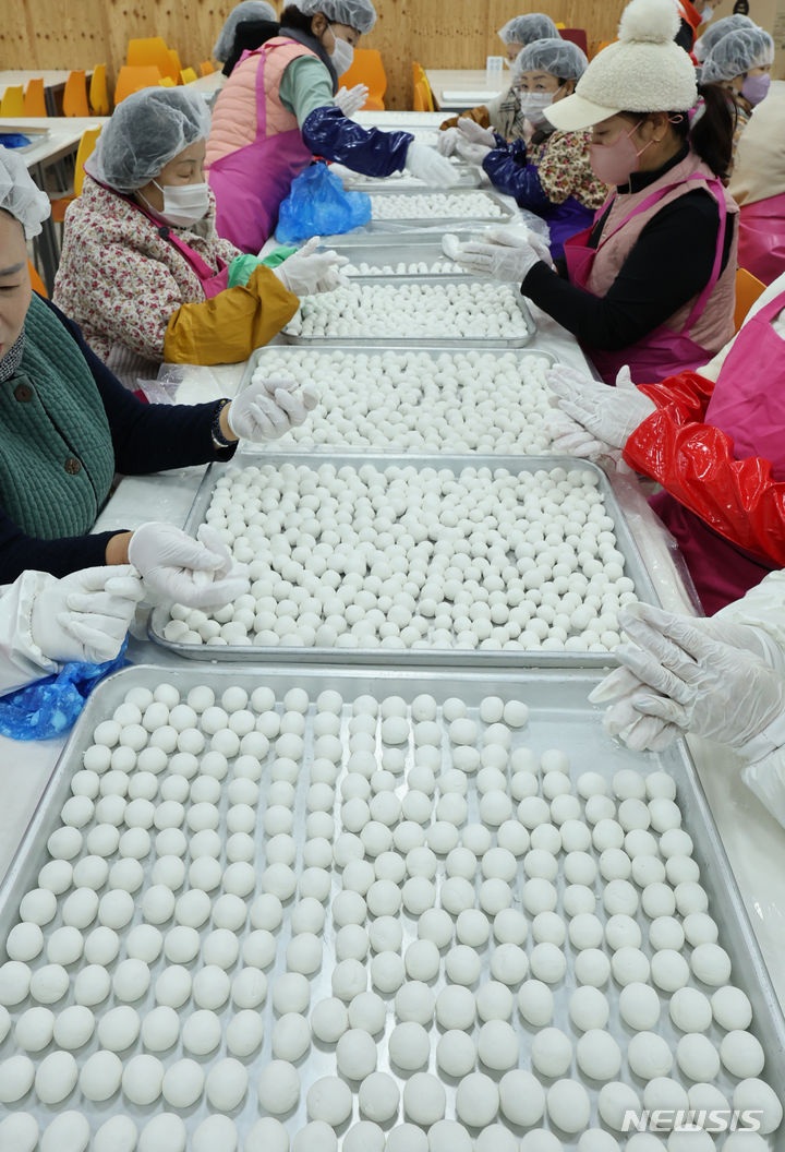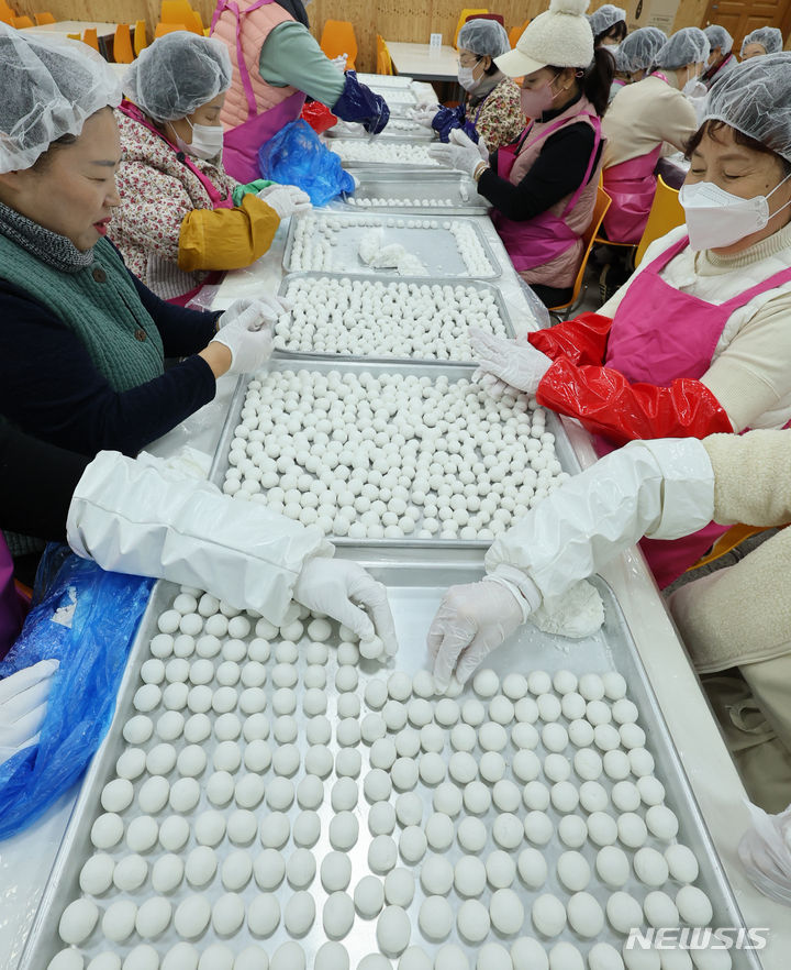 冬至まであと二日と迫った20日午前、仁川市西区の黄竜寺で、小豆がゆに入れるだんご作りが行われている様子。
