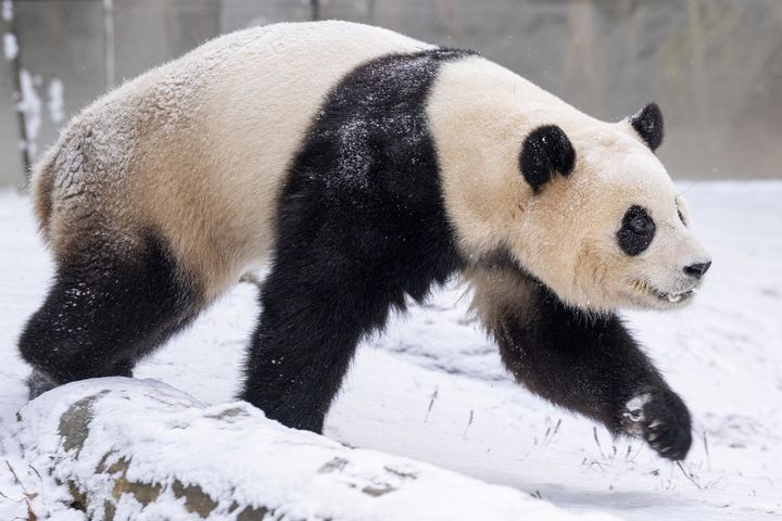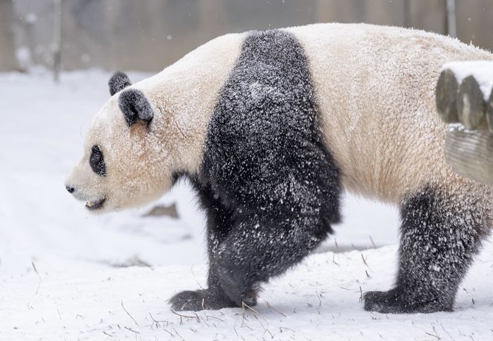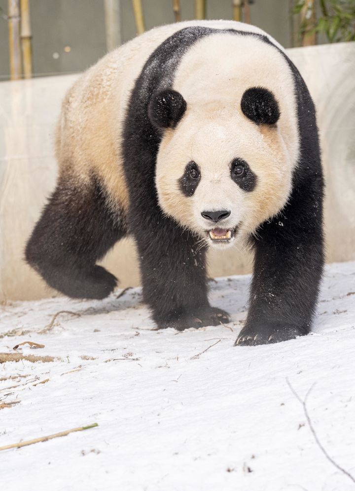 エバーランド(京畿道竜仁市)のパンダワールドで20日、雪原を歩き回って遊ぶパンダの「福宝(フーバオ)」。