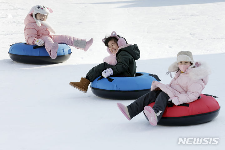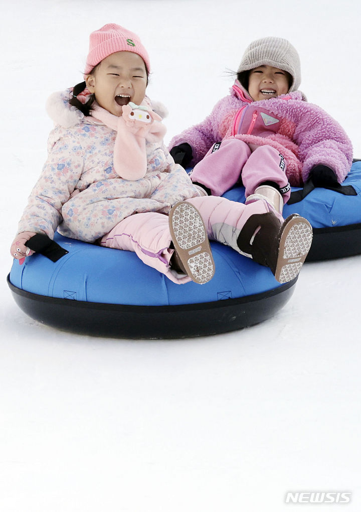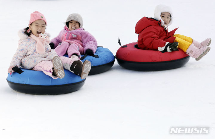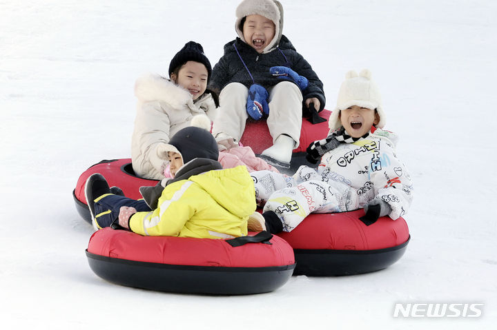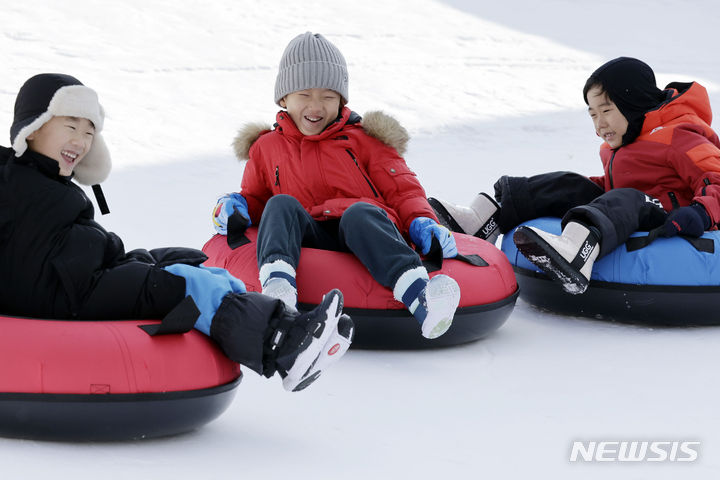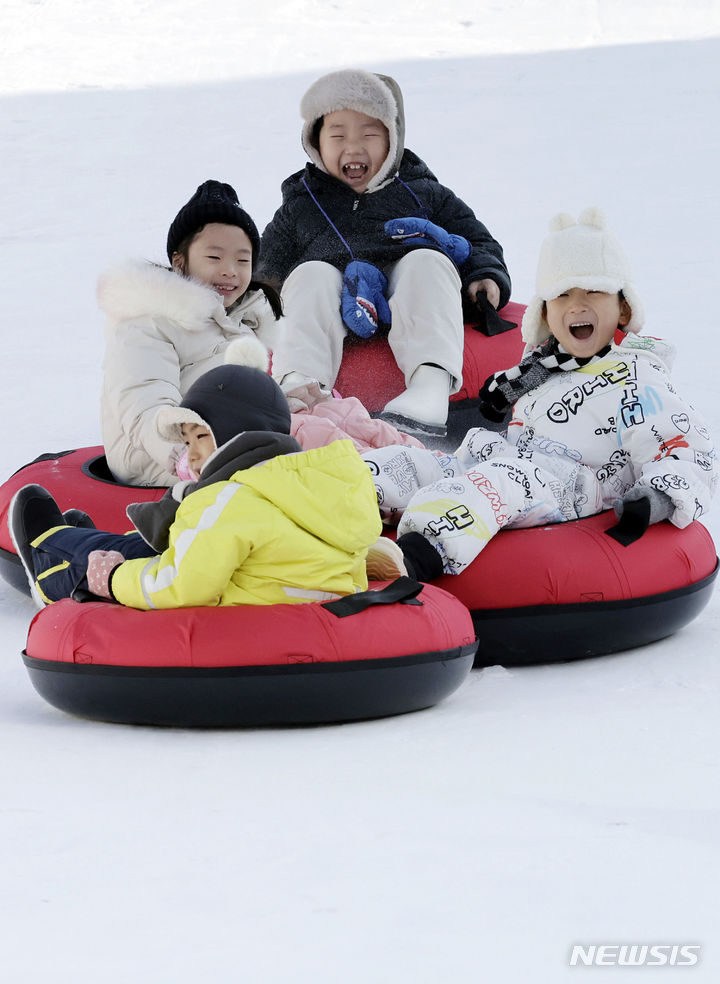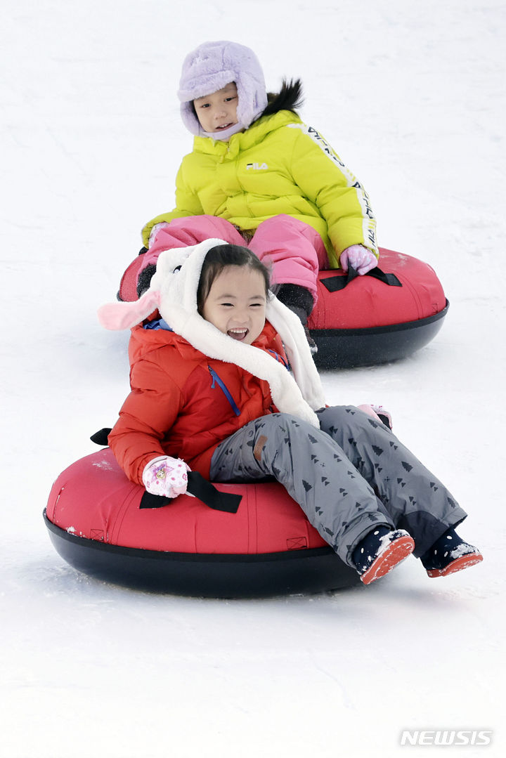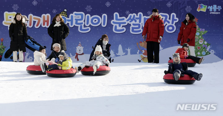 ソウル市城東区の「虹の子ども雪ソリ場」で20日、子どもたちが雪ソリに乗って楽しいひとときを過ごしている様子。雪ソリ場は毎週火曜日から日曜日の午前10時から午後5時まで運営され、およそ500人が先着順で入場できる。