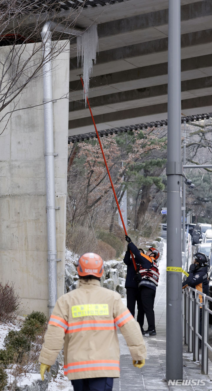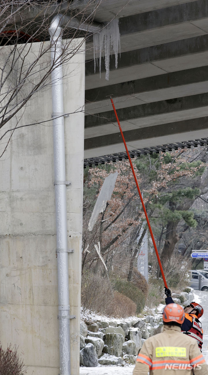 ソウルの退溪路で20日、消防隊員らが人命被害の予防のため、歩道の上に生じた大きな「つらら」を除去しているところ。