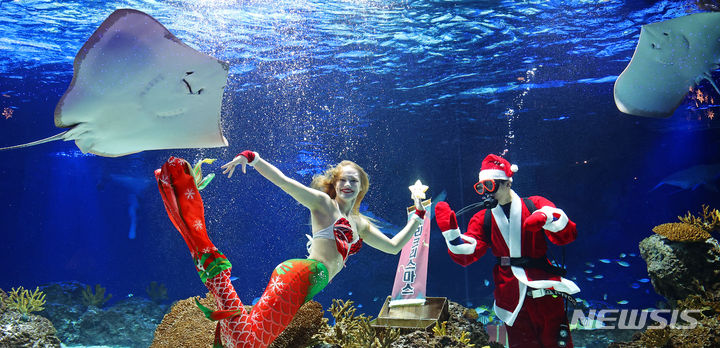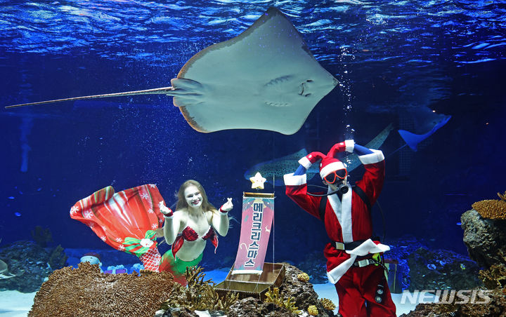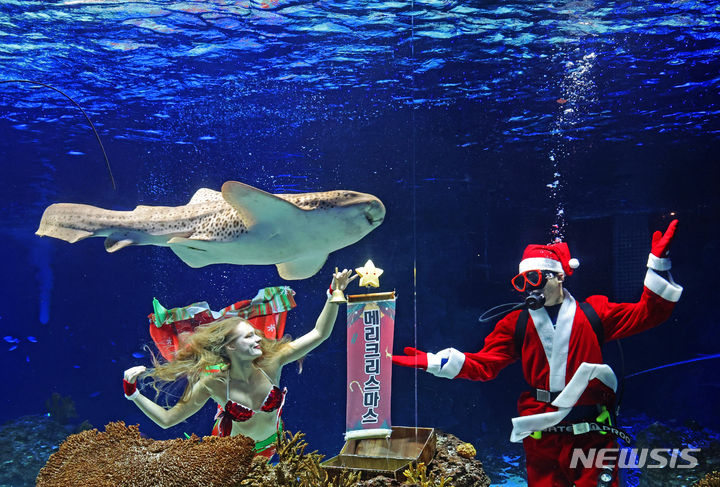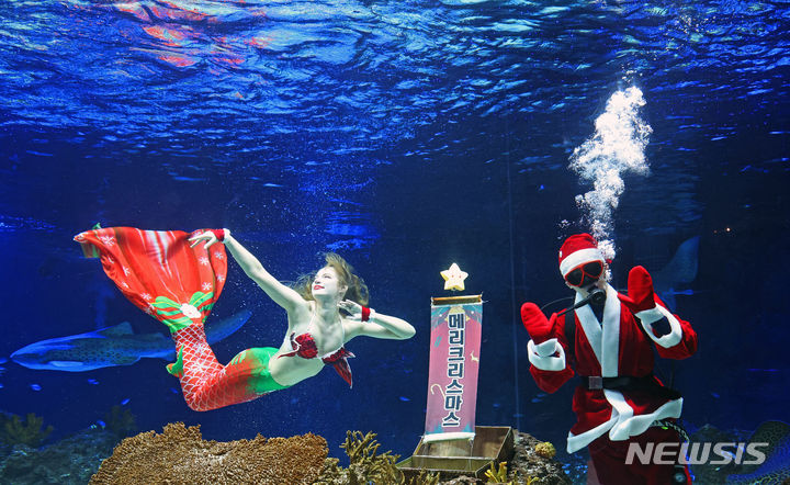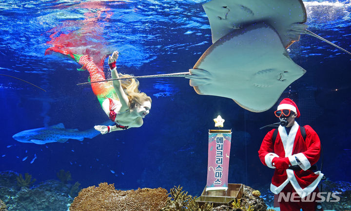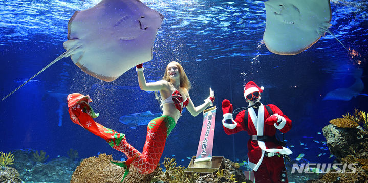 京畿道水原市霊通区のアクアプラネット光教で21日午前、アクアリストがクリスマスのあいさつをしている様子。