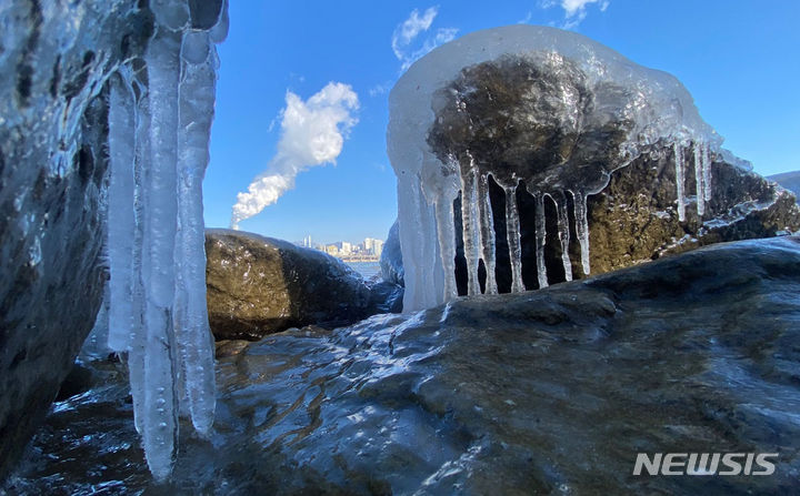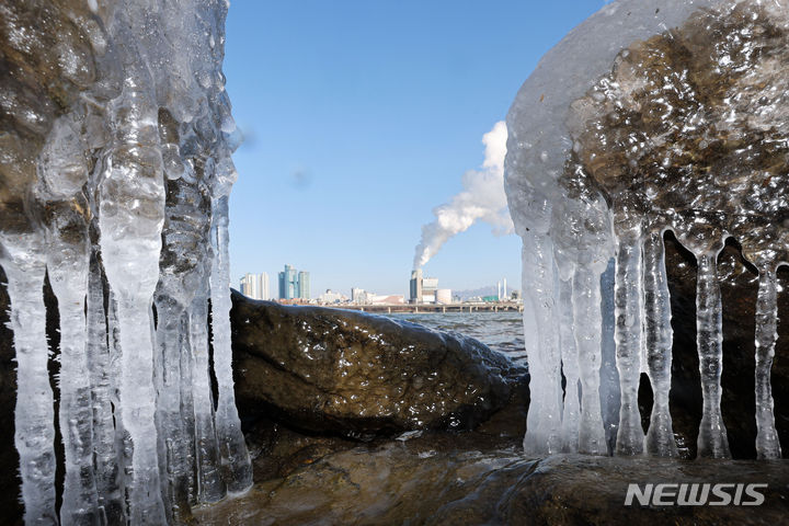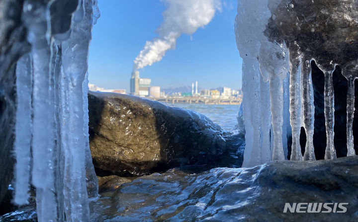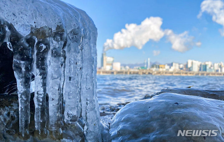 ソウルをはじめ内陸部の大部分で寒波特別警報が発表された21日午前、ソウル市永登浦区汝矣島洞を流れる漢江のほとりにはつららができていた。