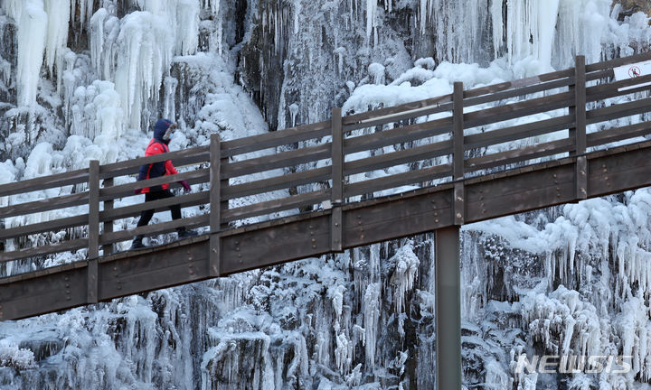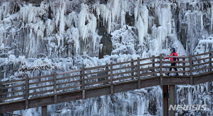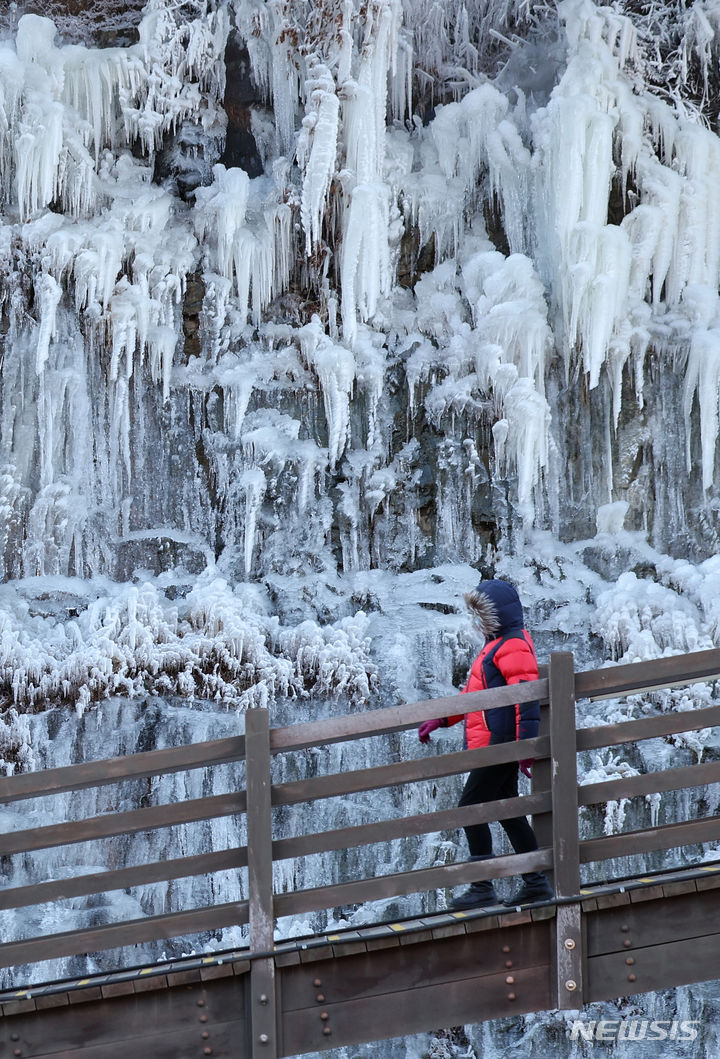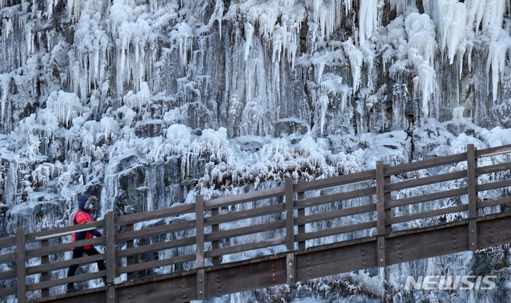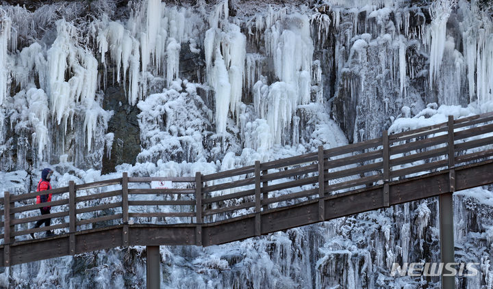 韓国の多くの地域で寒波警報が発令された21日、大邱市達城郡の宋海公園では散策路の傍らに巨大な氷壁が出現し、壮観をなしていた。