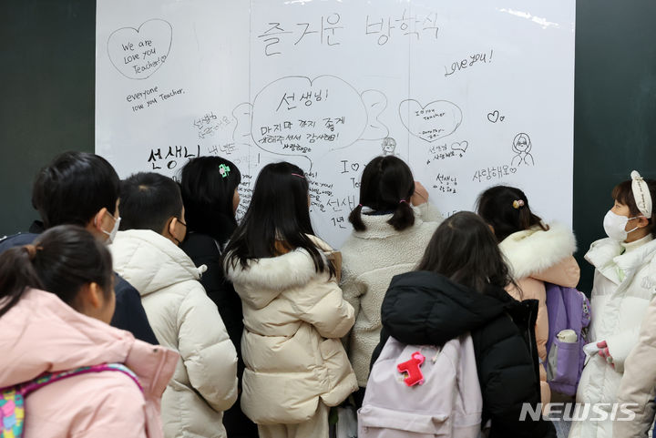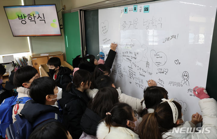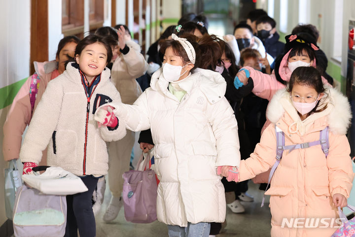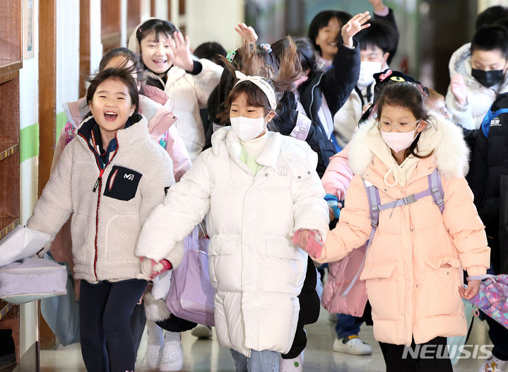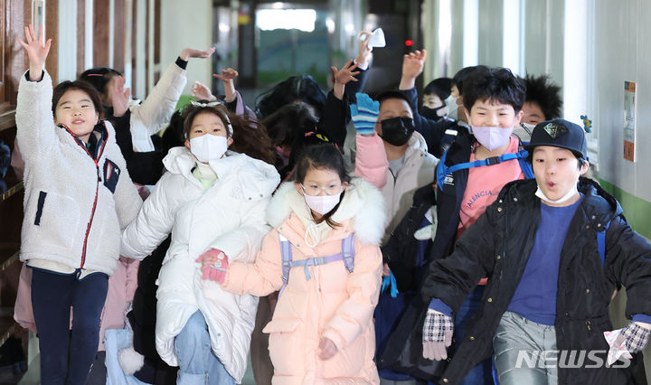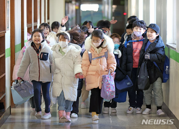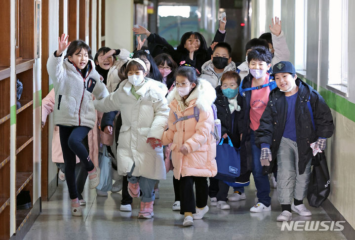 京畿道水原市勧善区の孝正小学校で22日、終業式を終えて下校する児童らの様子。
