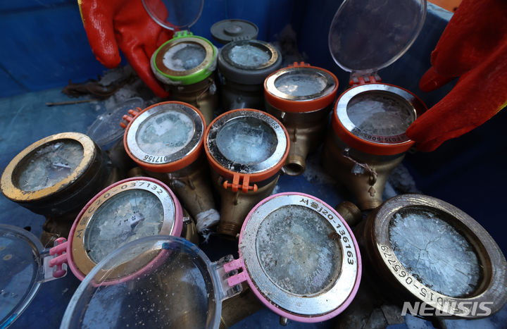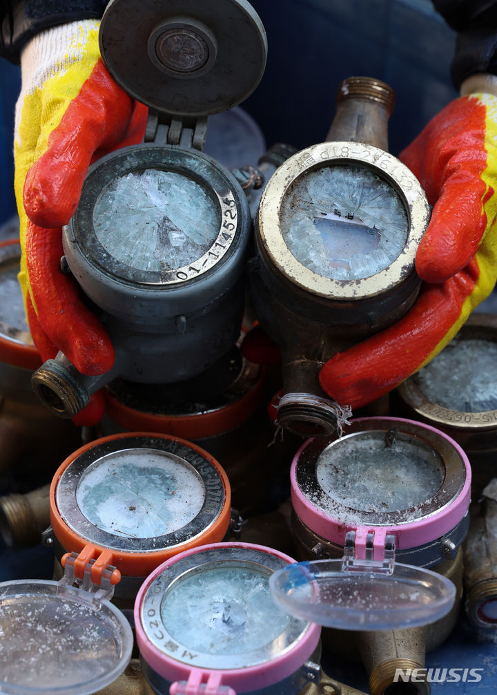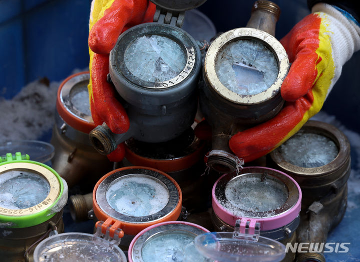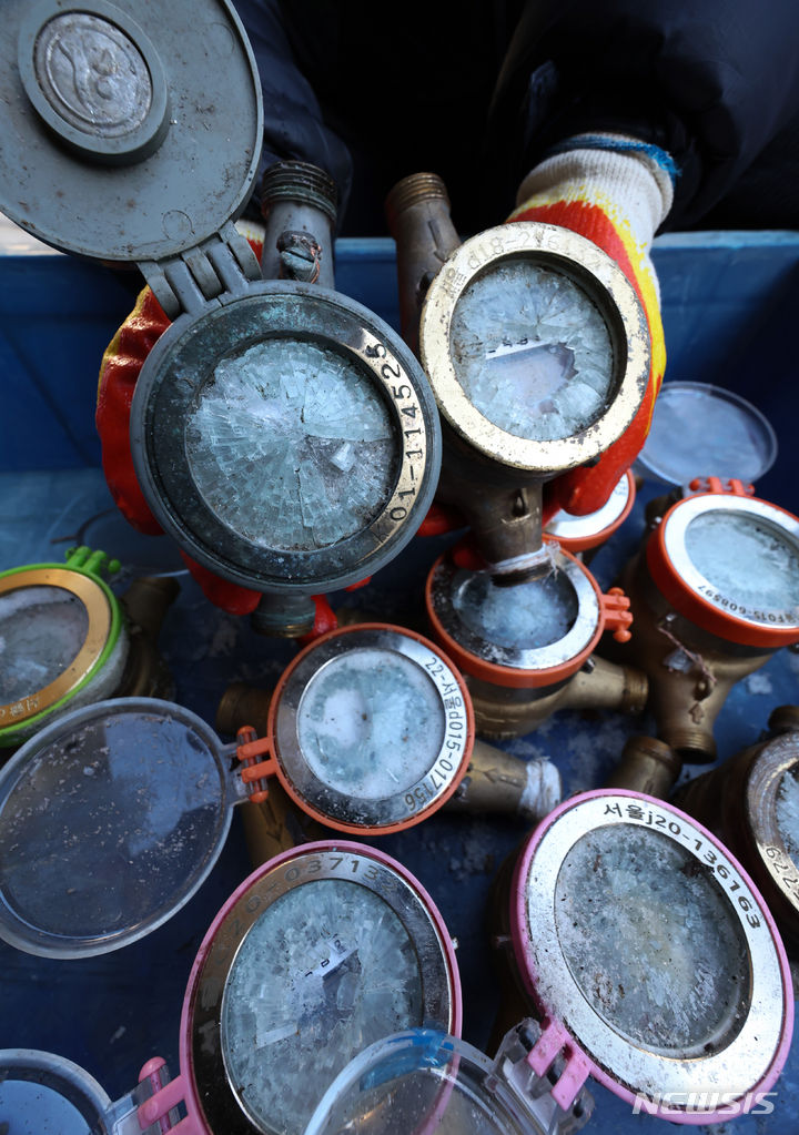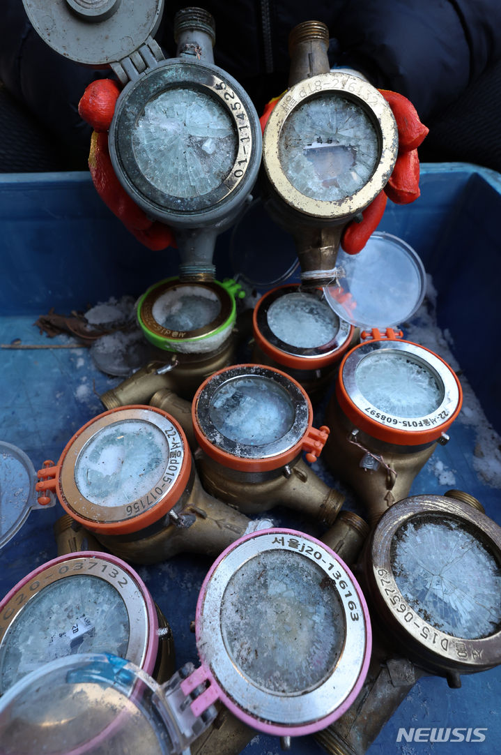 厳しい寒さが続き、水道メーターや水道管の凍結など、全国で被害が相次いでいる中、ソウル市鍾路区の中部水道事業所孝子加圧場では22日午前、職員らが凍結した水道メーターを整理していた。