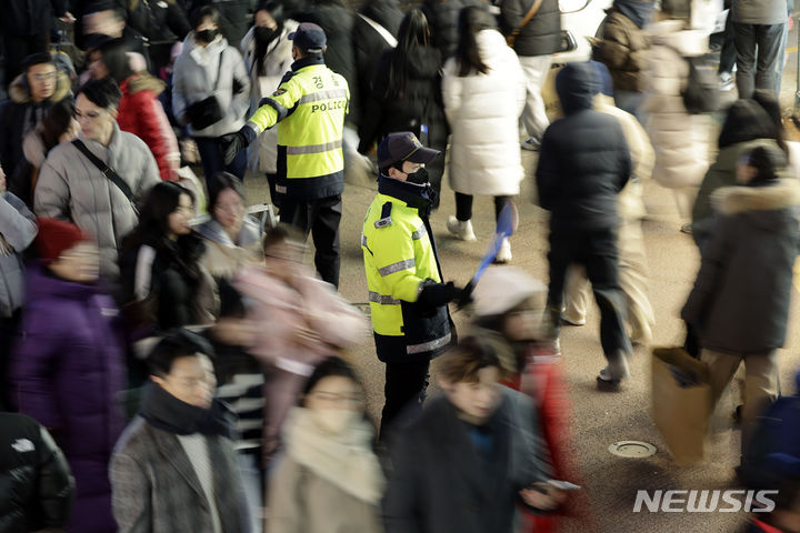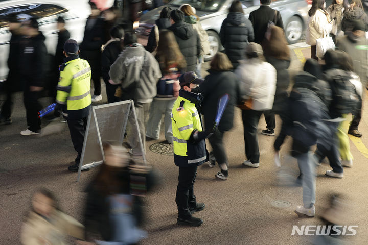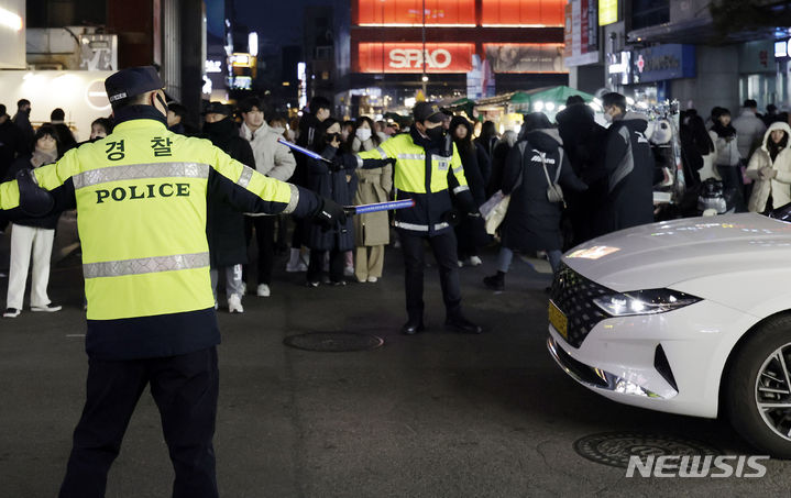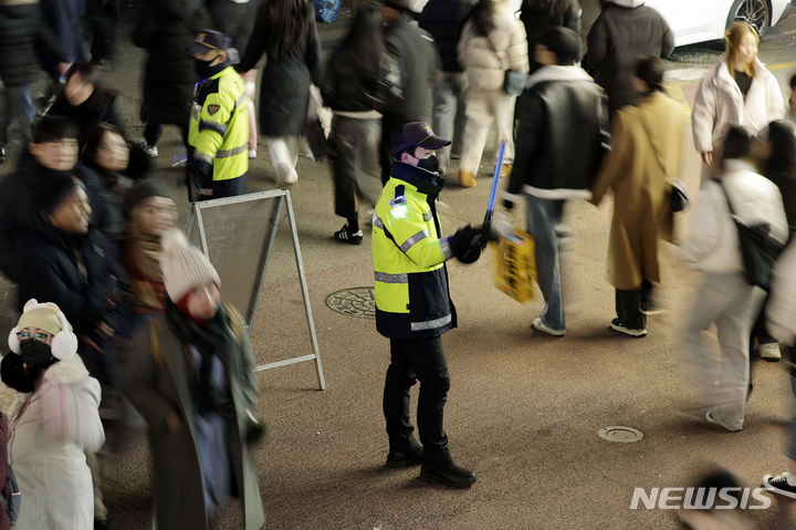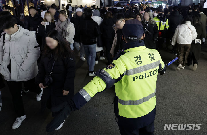 クリスマスの連休が始まった23日、ソウル・弘大通りで、人波密集地域安全管理を行う警察官。