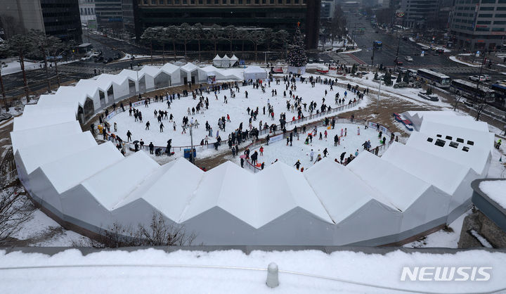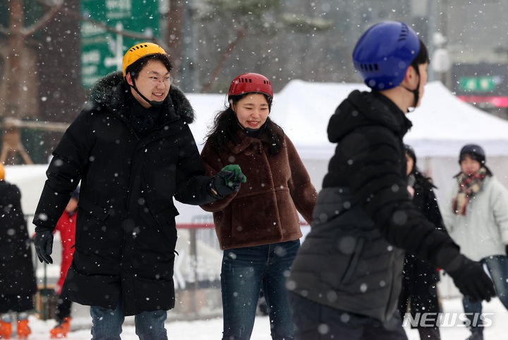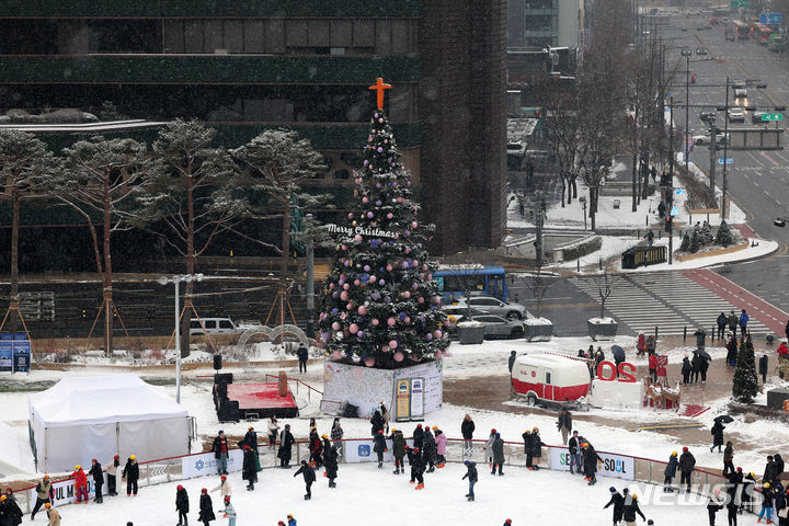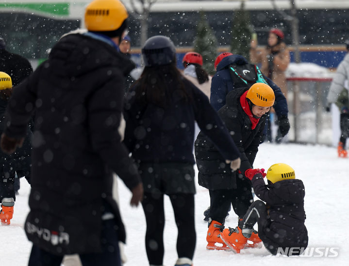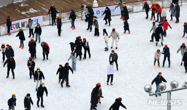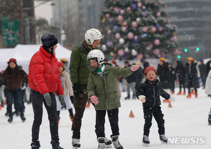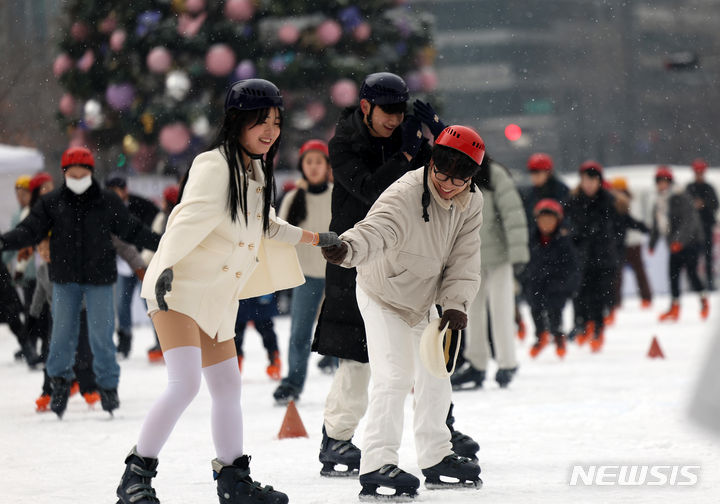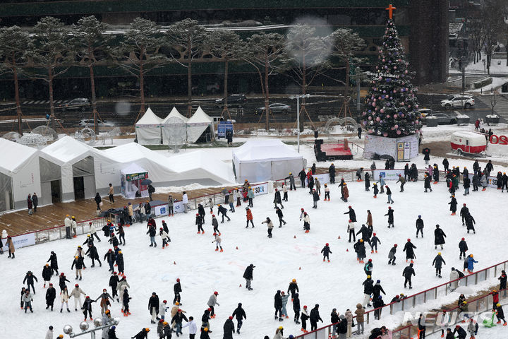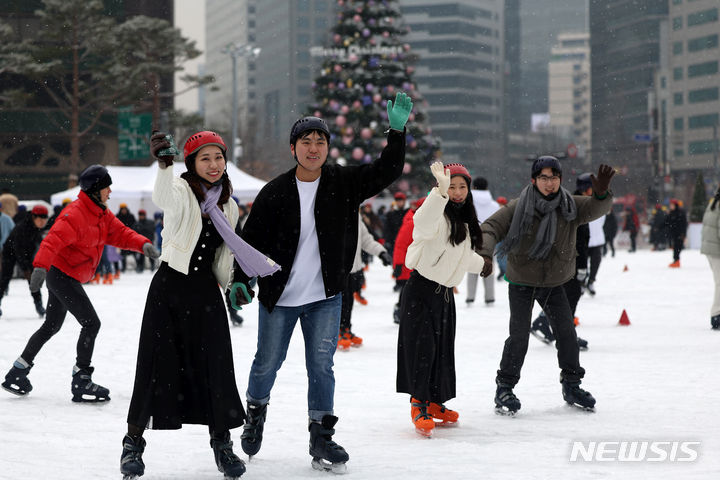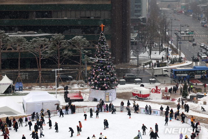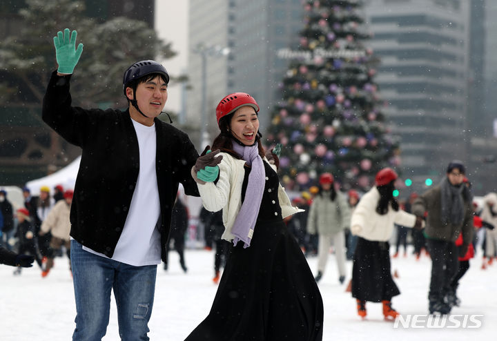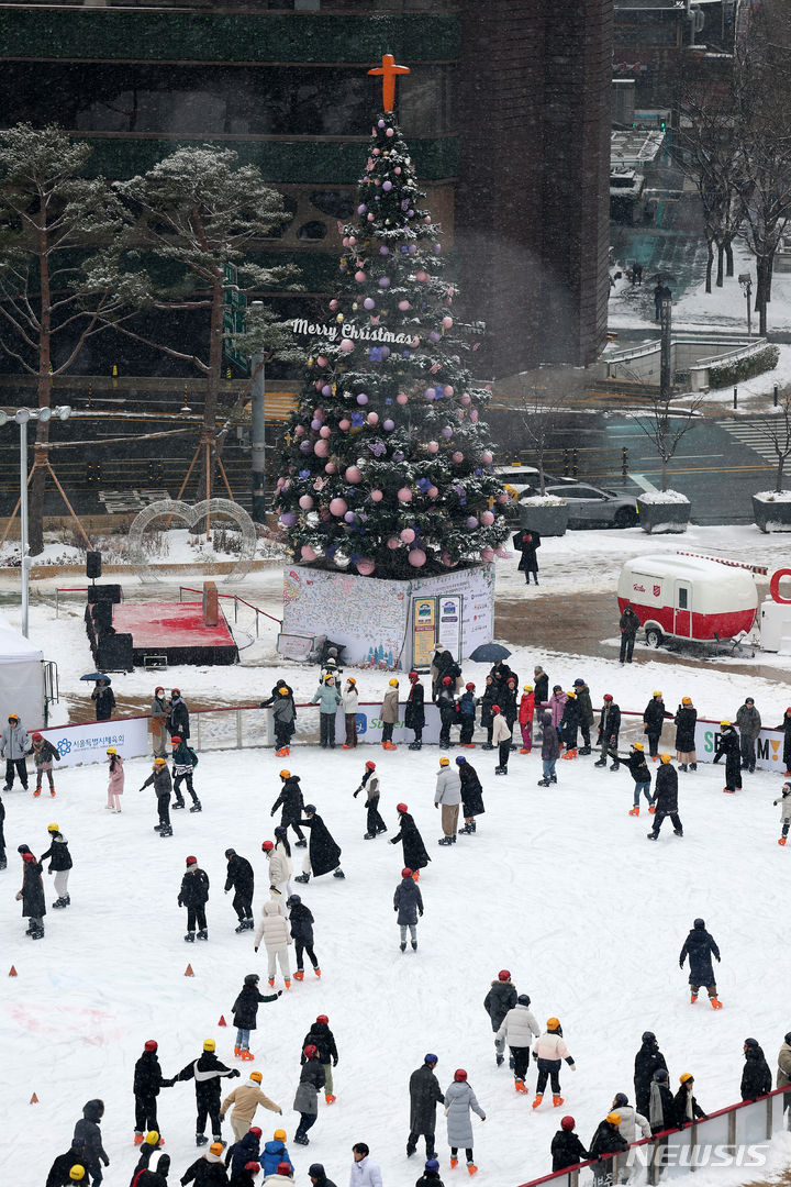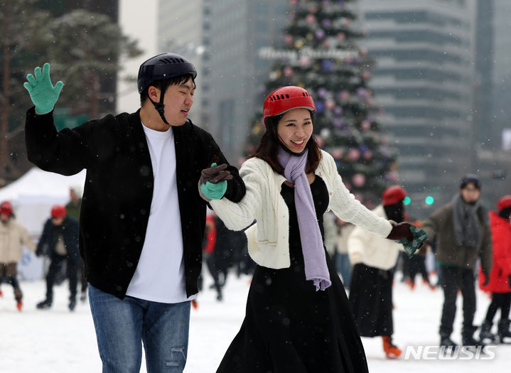 クリスマスを迎えた25日午前、ソウル市中区のソウル広場のスケート場では、雪の中で市民がスケートを楽しんでいた。