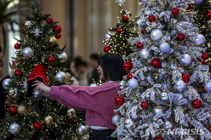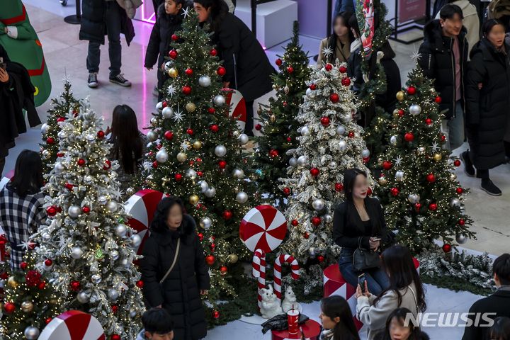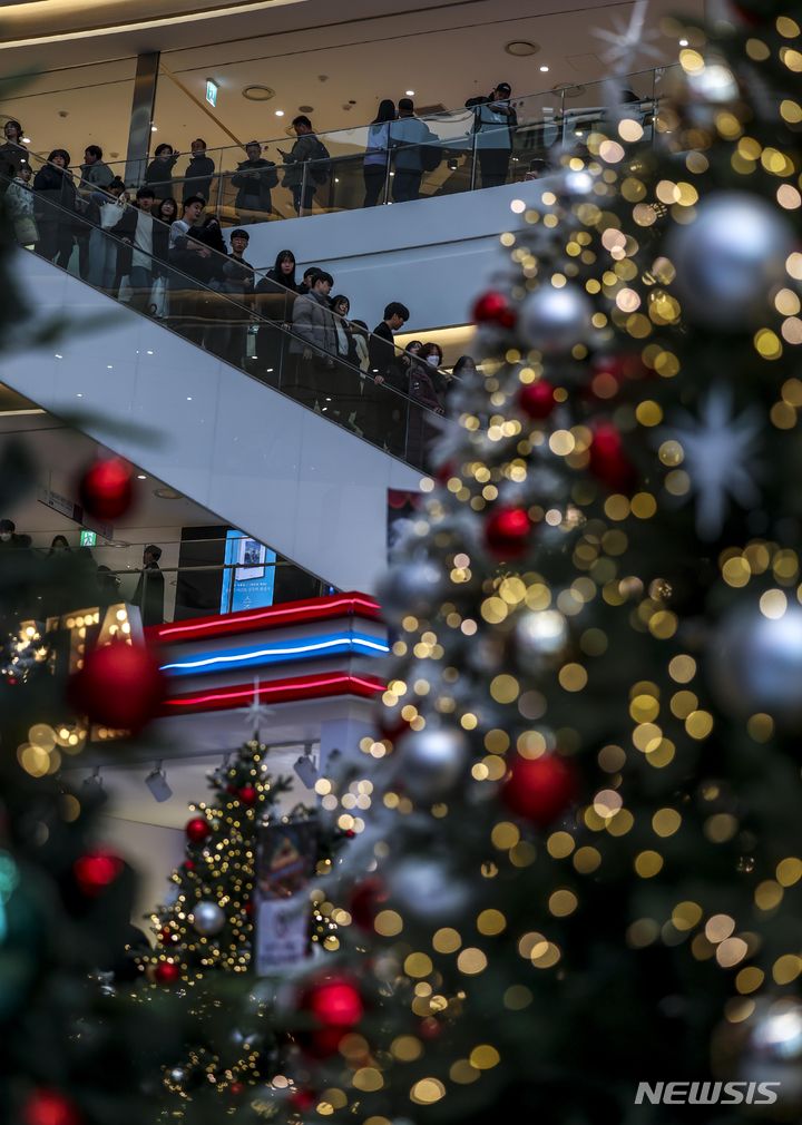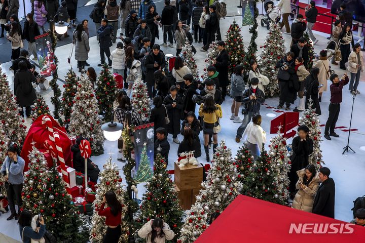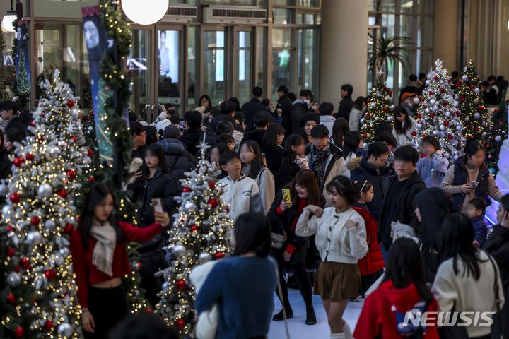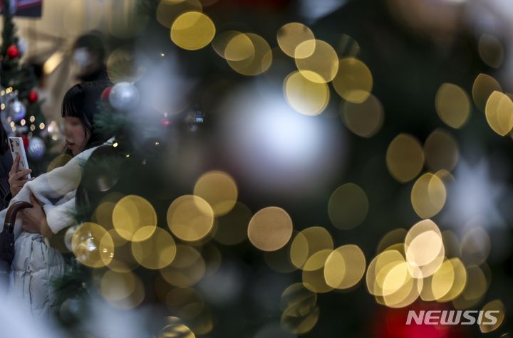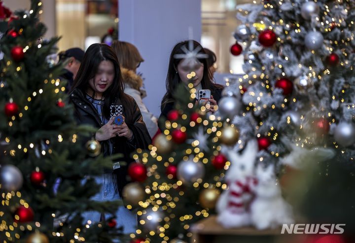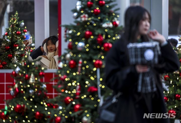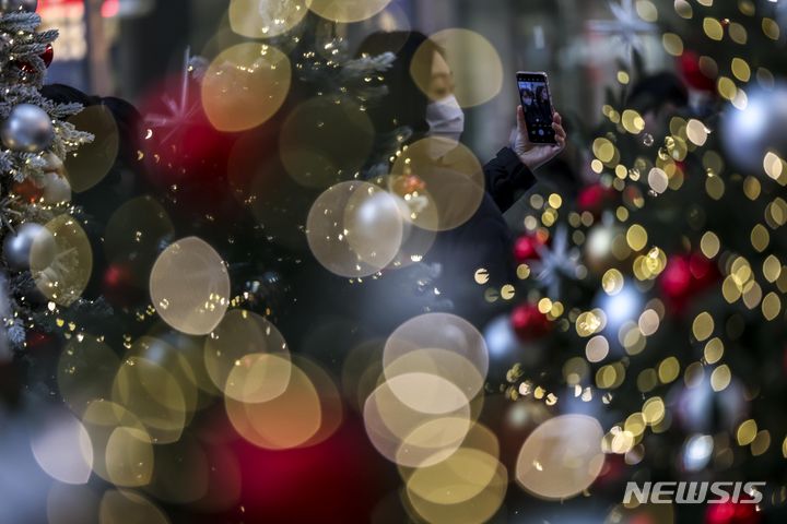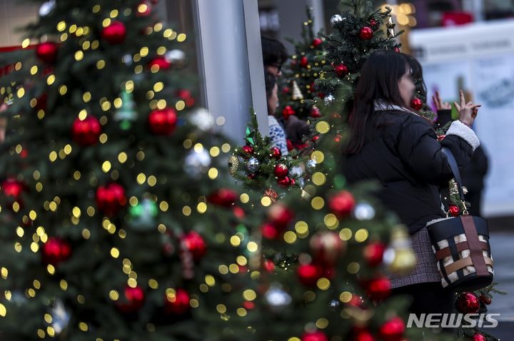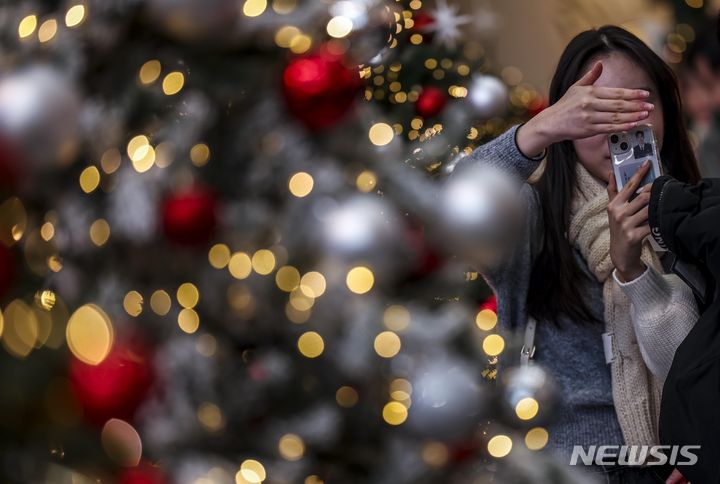 クリスマスを迎えた25日、ソウル市永登浦区のタイムスクエアを訪れた市民が、クリスマスツリーと一緒に写真を撮っている様子。