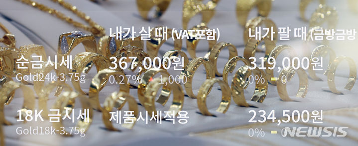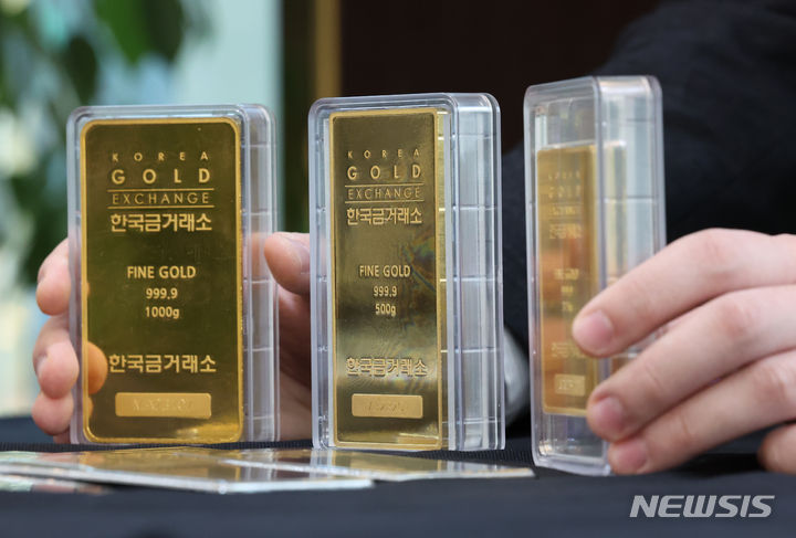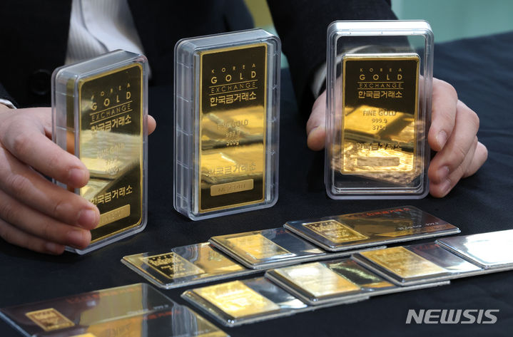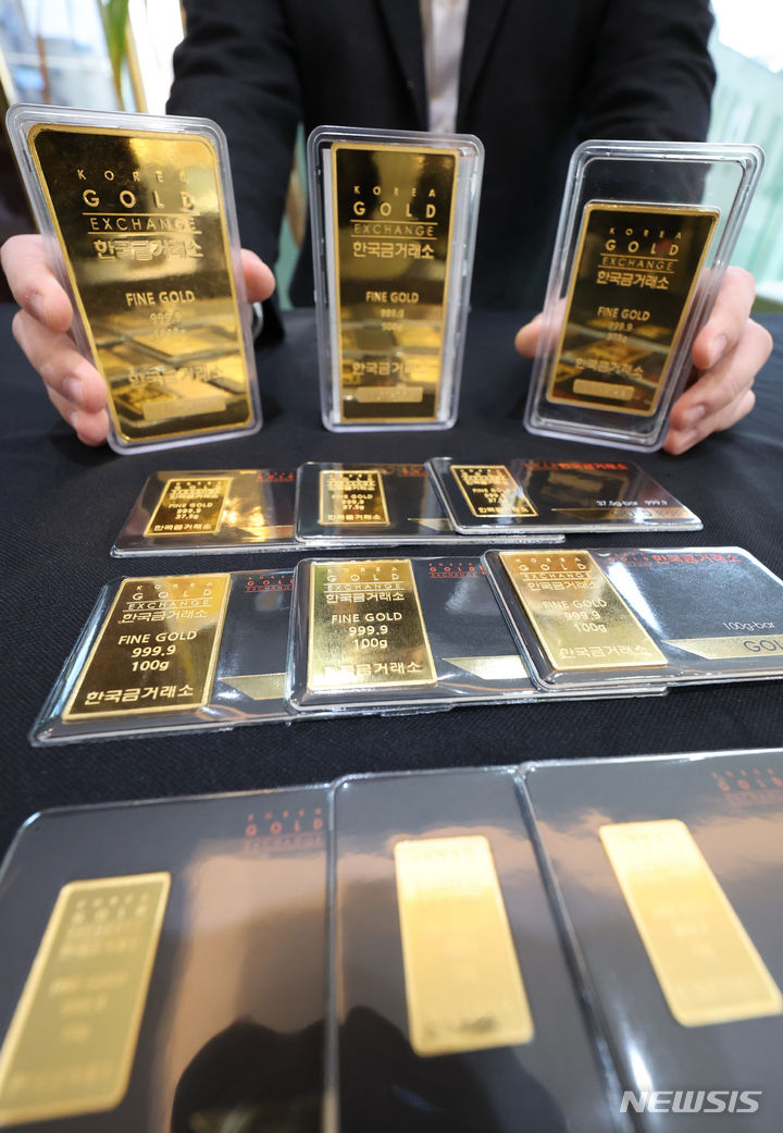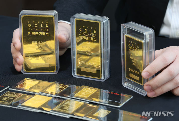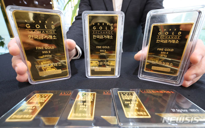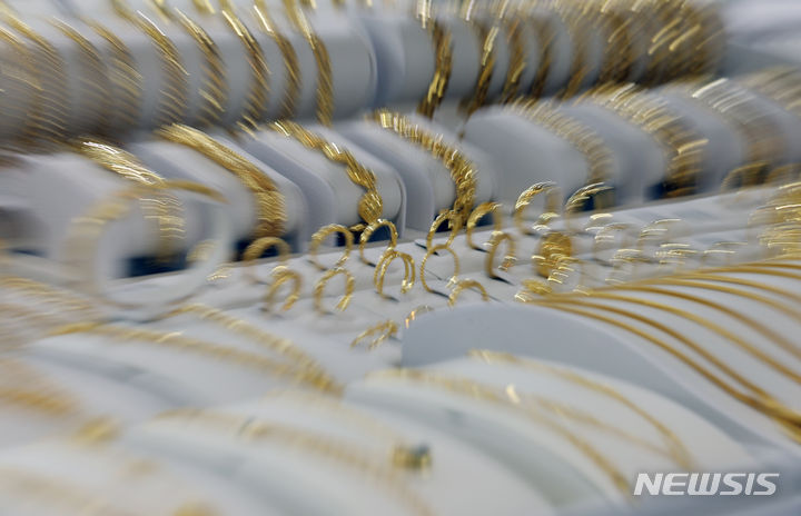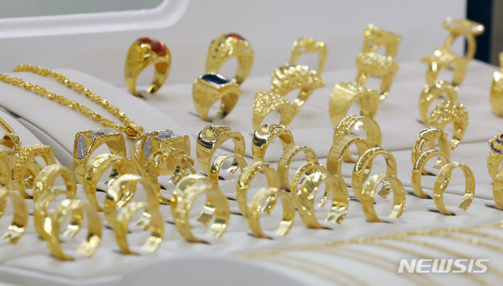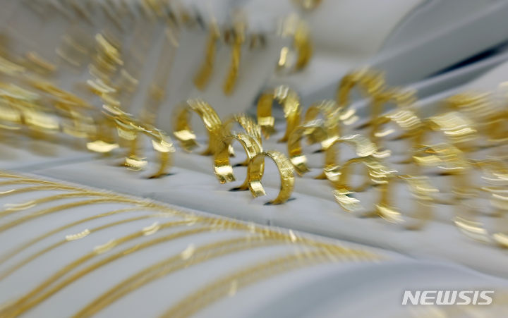 米国の金利引き下げへの期待感が高まる中、金価格が韓国国内および海外で上がっている。韓国国内の小売基準で1匁(3.75グラム)40万ウォン(現在のレートで約4万4000円。以下同じ)を超え、なおも強気の相場が続いている。韓国取引所によると、韓国取引所(KRX)金市場における金現物1キロ物の1グラム当たりの価格は26日に8万5940ウォン(約9464円)を付け、前日より0.21%上昇した。写真は27日、韓国金取引所(ソウル市鍾路区)の金製品の様子。