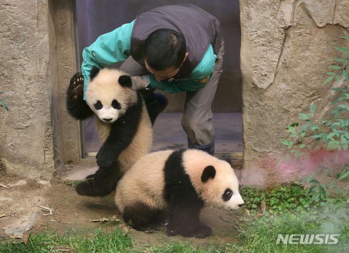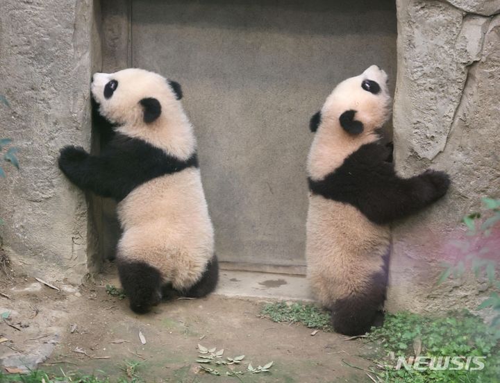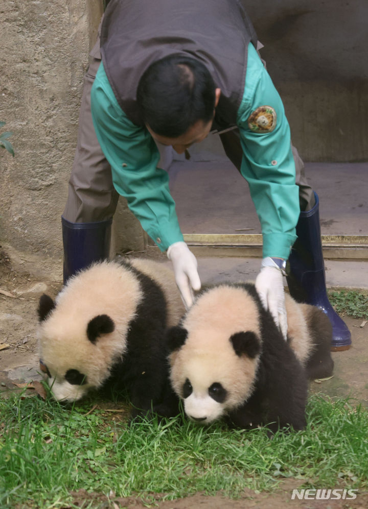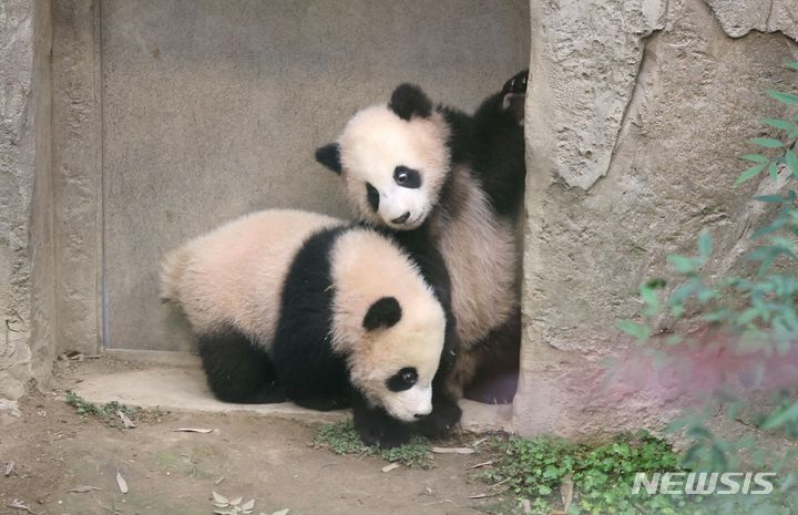 京畿道竜仁市のエバーランドで3日、双子のパンダ睿宝(ルイバオ)と輝宝(フイバオ)がメディアに公開された(共同取材)。