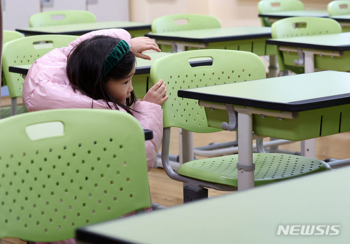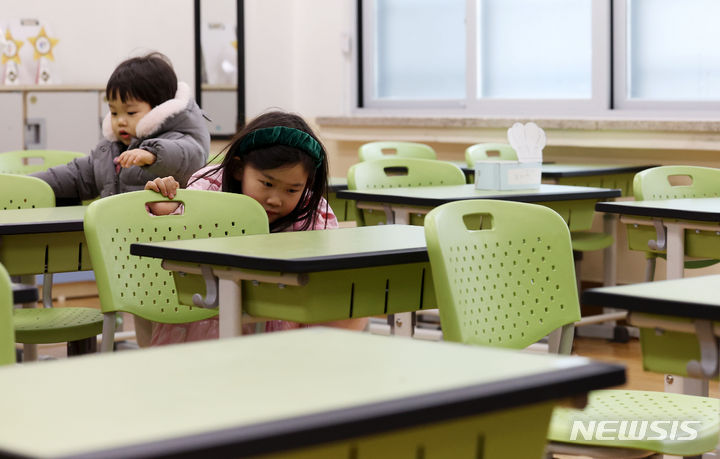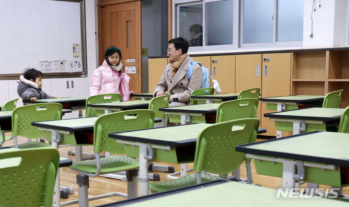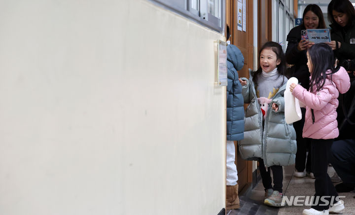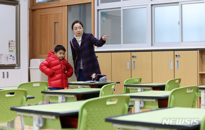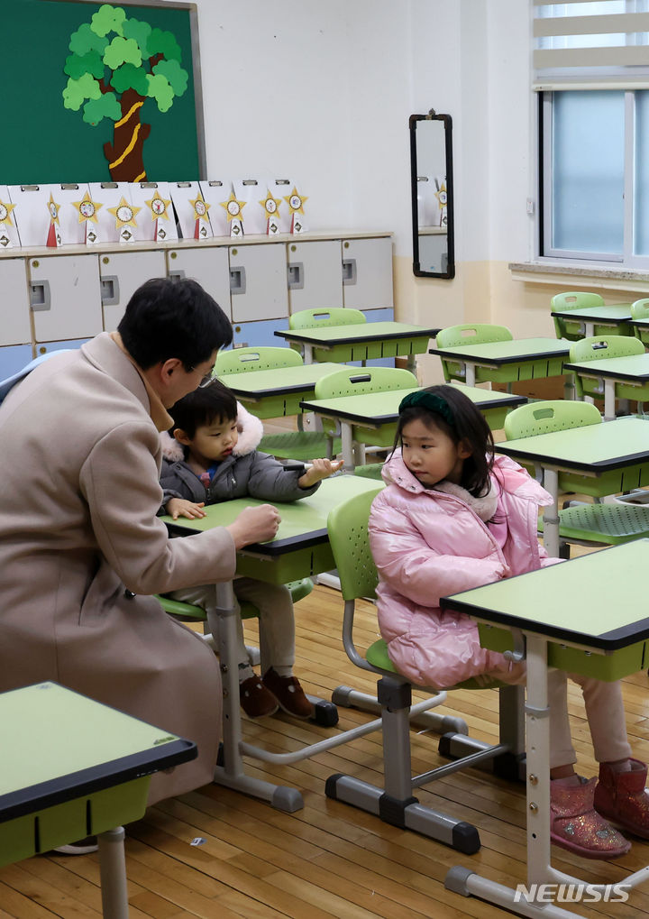 2024年度小学校新入生予備招集日の4日、ソウル市瑞草区の円明小学校では、入学を控えた子どもたちが教室を見て回っていた。
