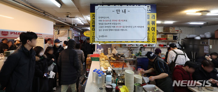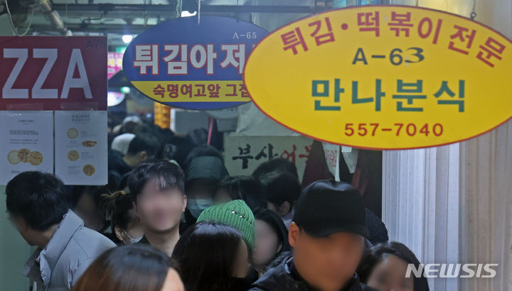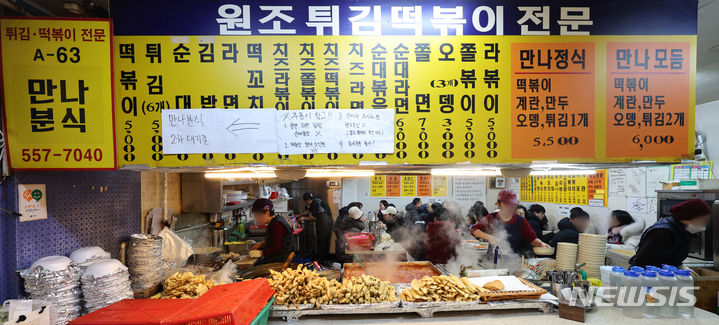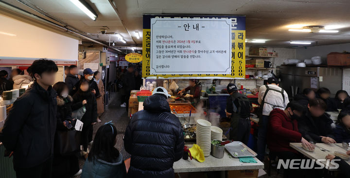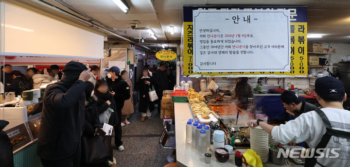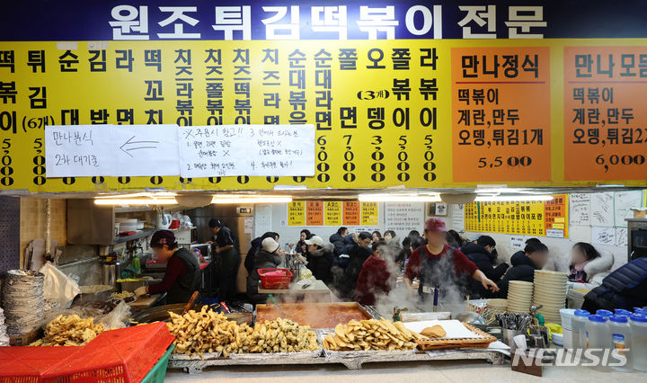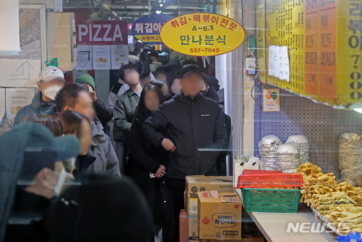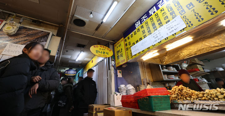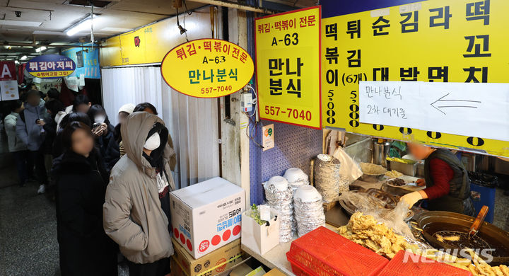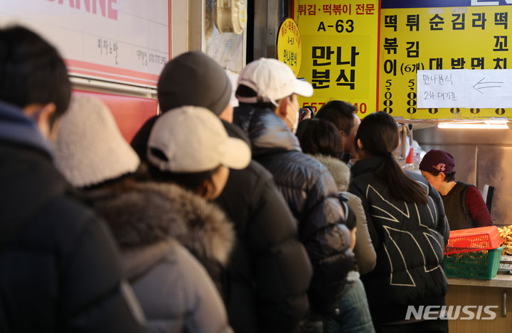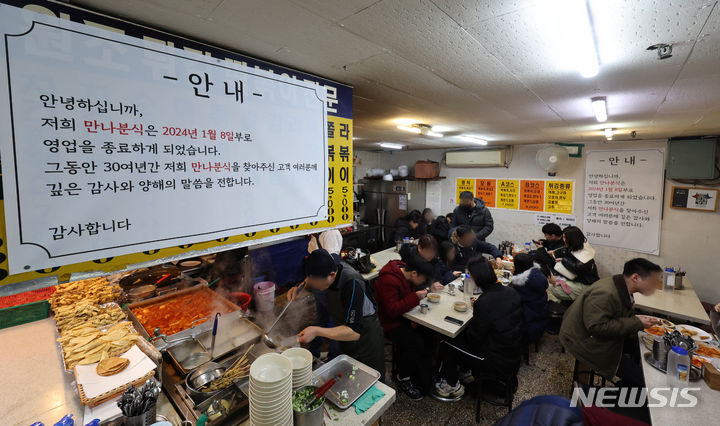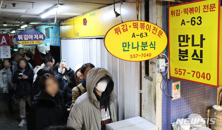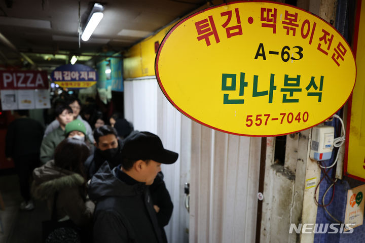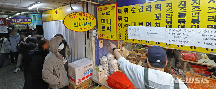 【NEWSIS】7日午前、ソウル市江南区大峙洞の銀馬総合商店街にある「マンナ粉食」の味を懐かしんで行列する人々。約30年間にわたり地域住民らにトッポッキ(もちの唐辛子みそ炒め)などの軽食を提供して親しまれてきた同店は、この日を最後に閉店した。