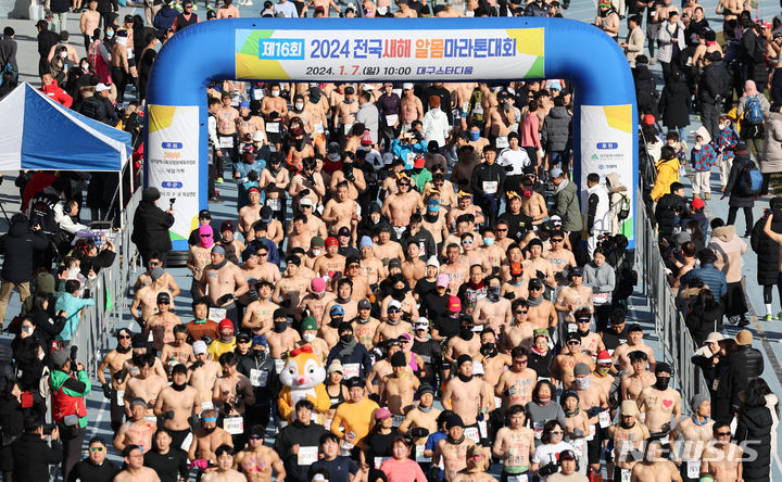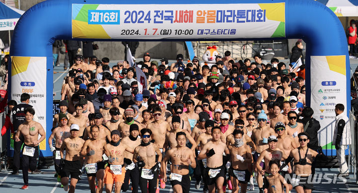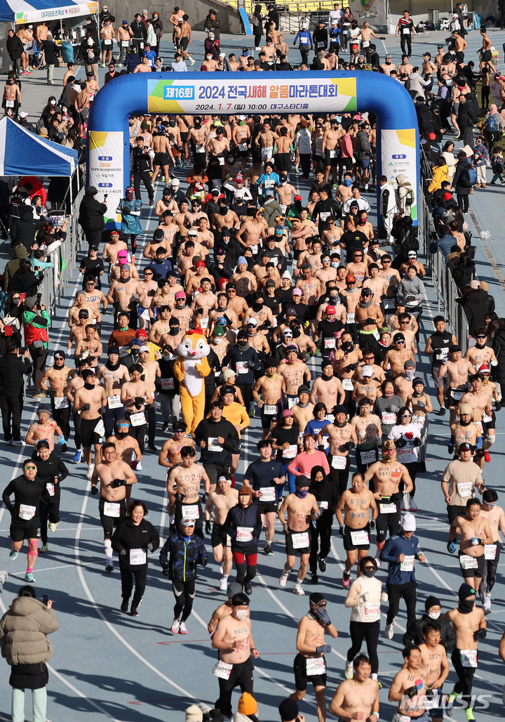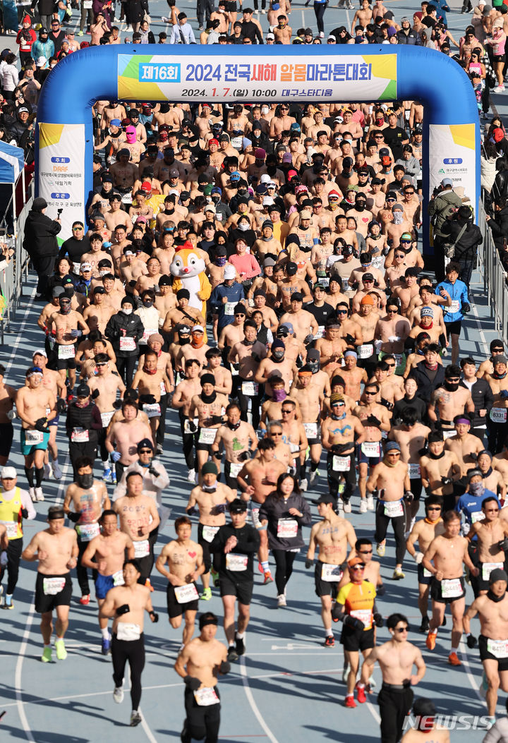 【NEWSIS】7日、大邱市寿城区の大邱スタジアム一帯で、「2024全国新年裸マラソン大会」が開催された。写真は寒さを忘れて力強いスタートを切る参加者たち。