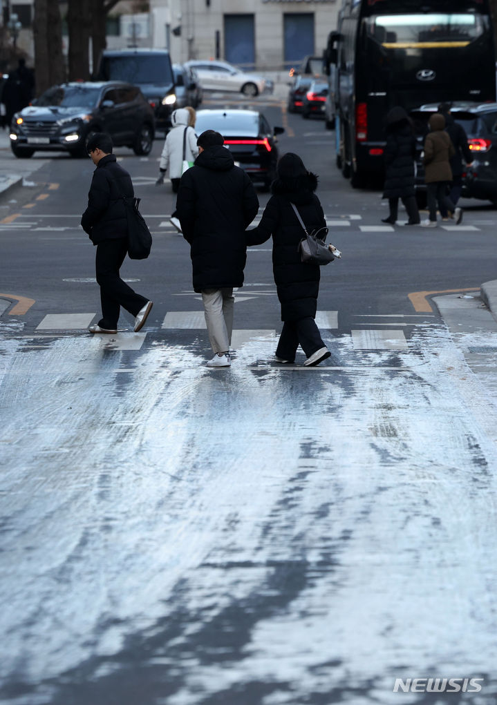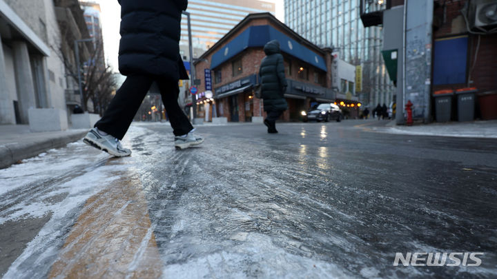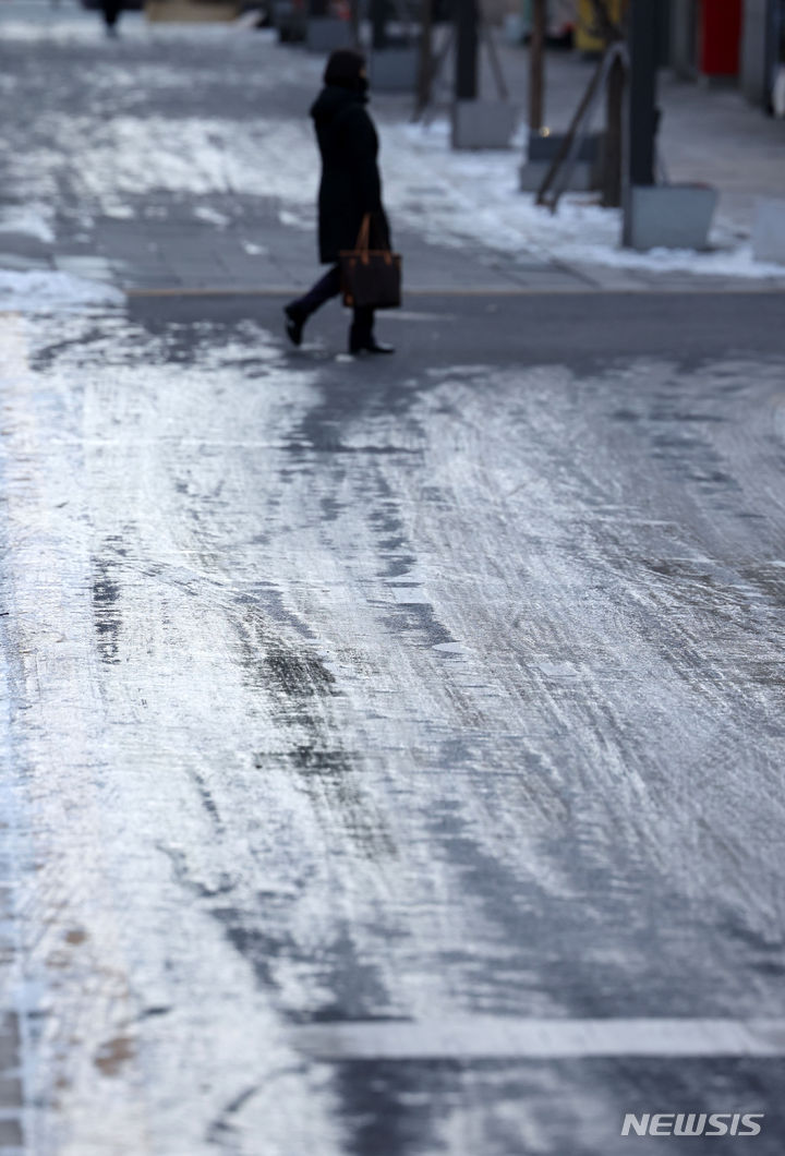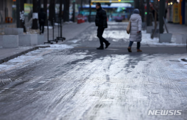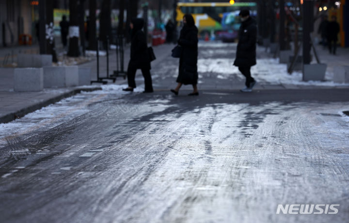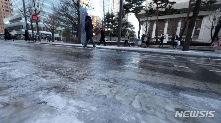 【NEWSIS】ソウル市内の朝の気温が氷点下10℃を下回り、寒波注意報が出された8日、ソウル市鍾路区の世宗路で凍結した道路。