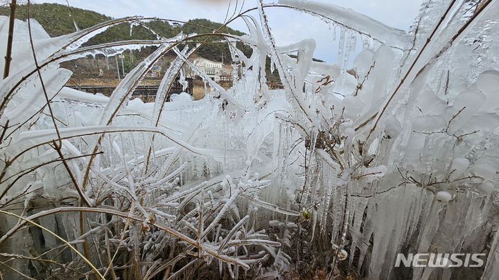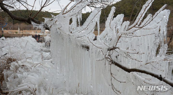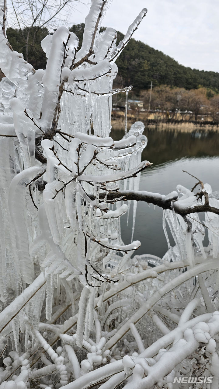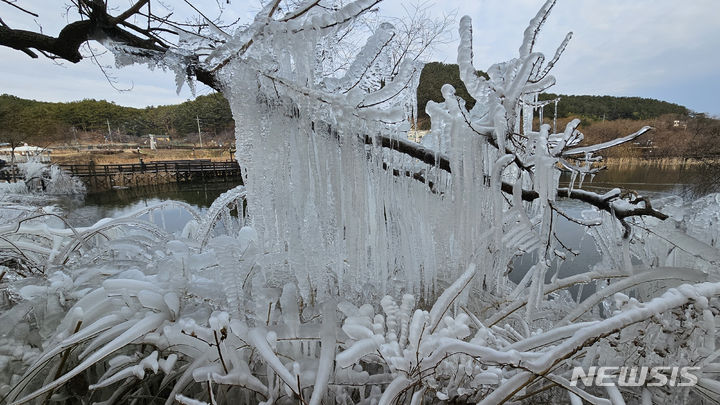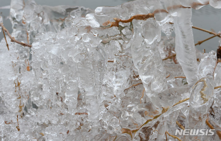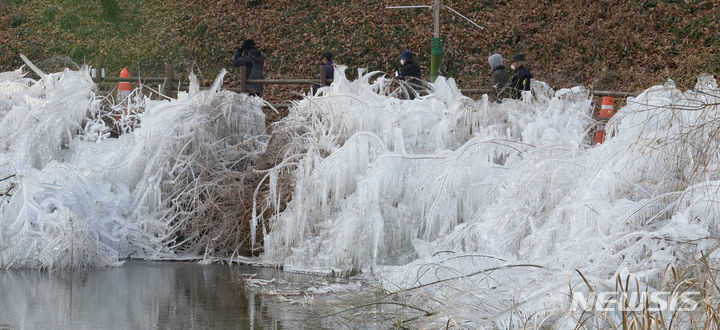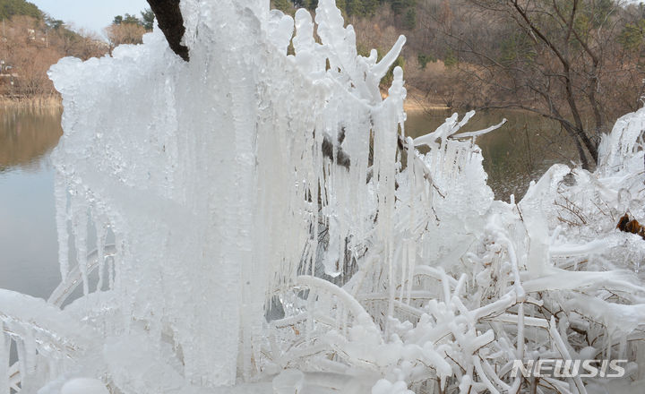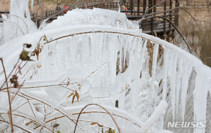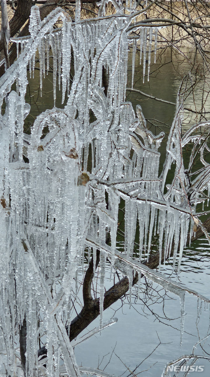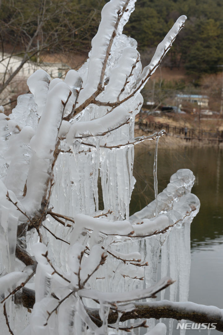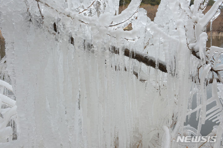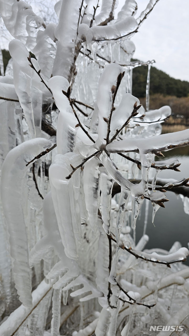 【NEWSIS】気温が氷点下まで下がった9日午前、蔚山市南区の仙岩湖水公園では、木の枝に大きな「つらら」ができていた。