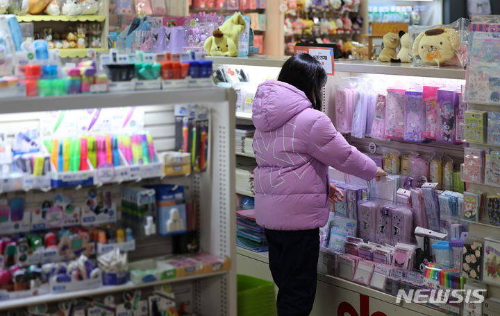 大邱市中区のホットトラックスで10日、子どもと保護者が新学期を前に学用品を選んでいる様子。