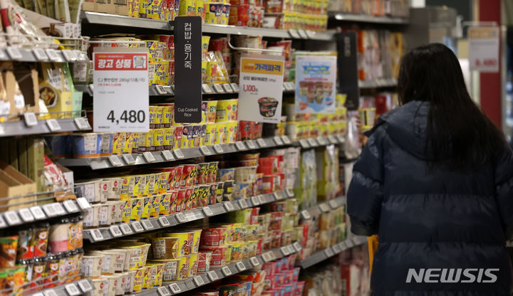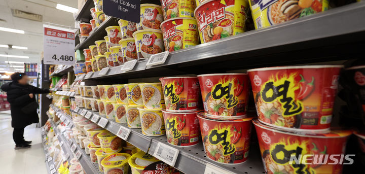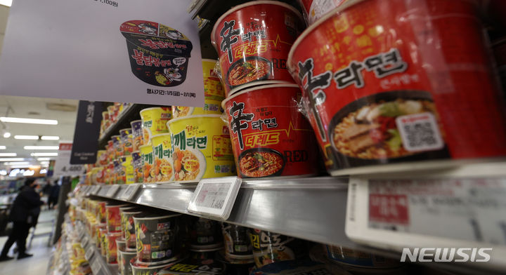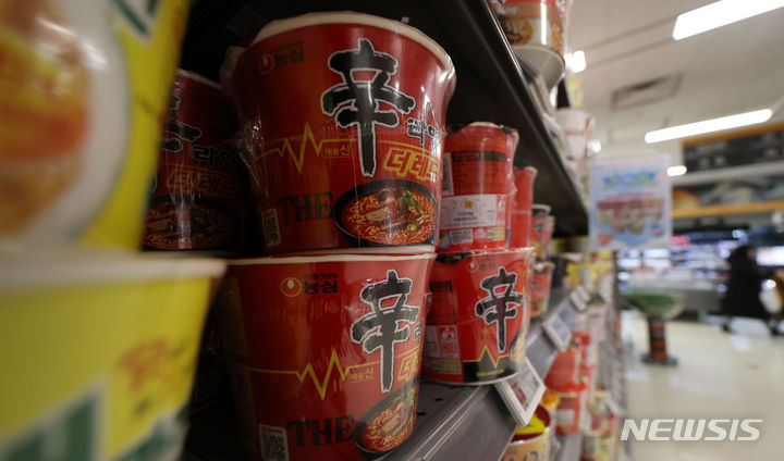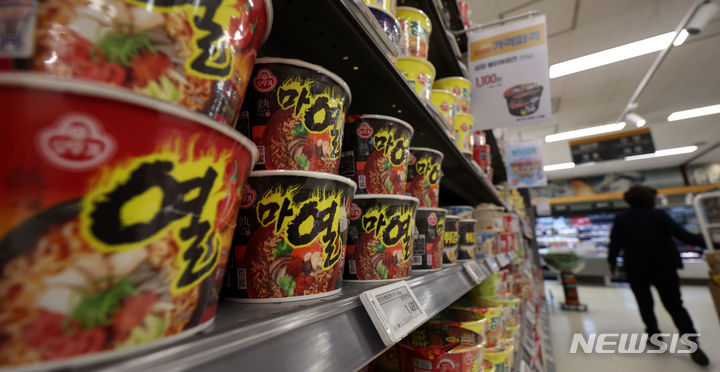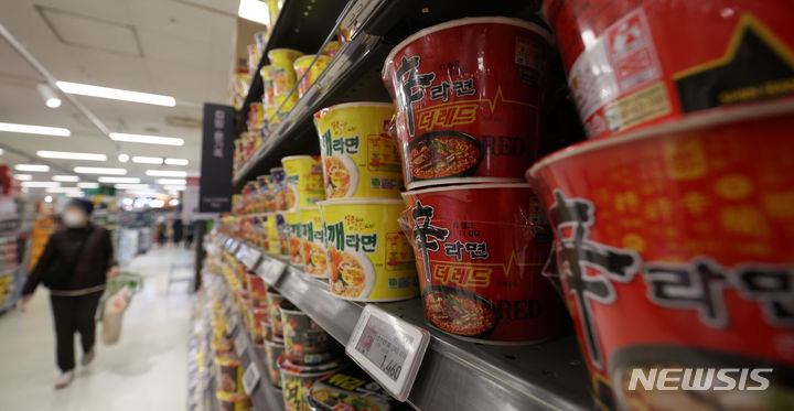 辛いラーメンの需要が増え、これまで袋ラーメンの辛さを競ってきた食品メーカー各社がカップラーメンにまで競争範囲を広げている。Paldo(八道)麻辣味、農心辛ラーメン・ザ・レッド大カップ、三養食品カンチャンポンXカップラーメンなど、主なラーメンメーカーがさまざまな新製品を発売して競っている。写真は11日、ソウル市内の小売店で販売されているカップラーメンの様子。