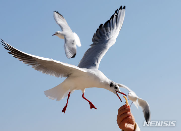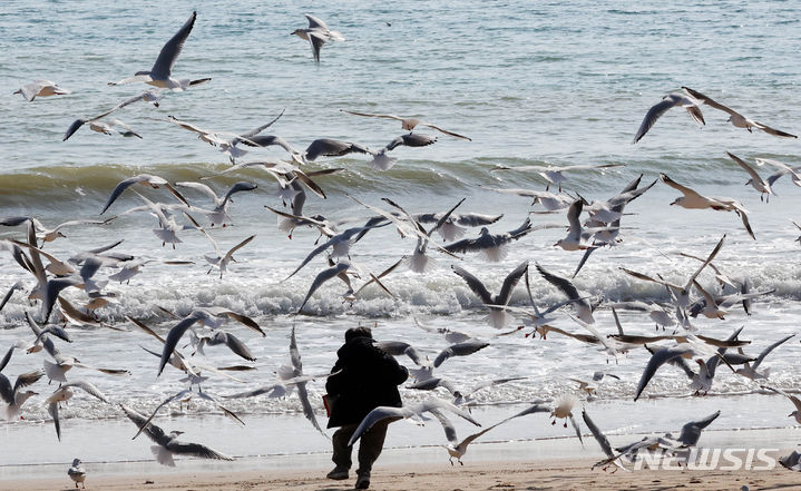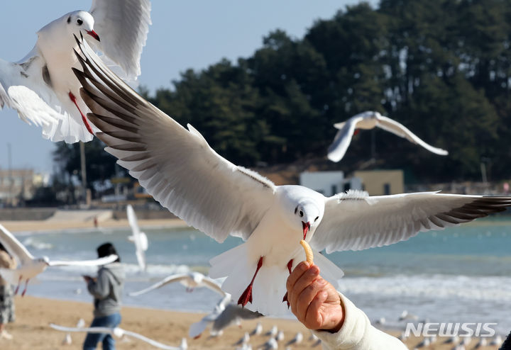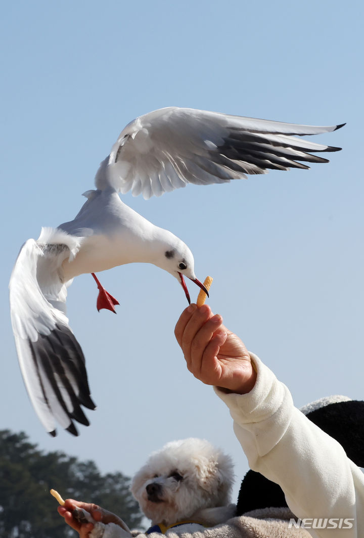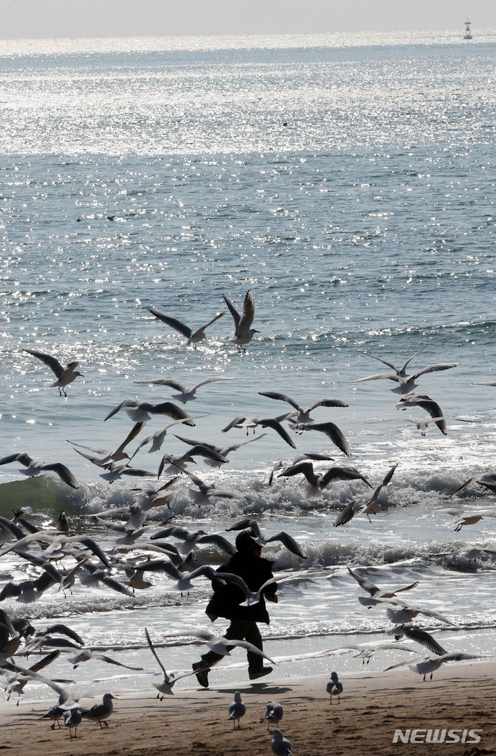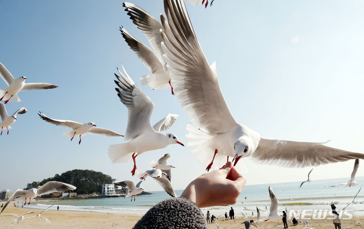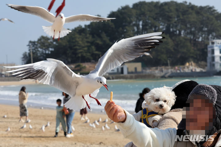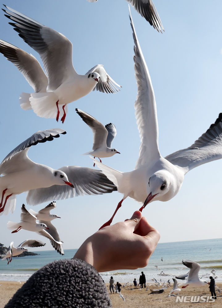 暖かな天気となった12日、釜山市海雲台区の松亭海水浴場では、観光客の与えるエビの菓子にカモメが群がっていた。
