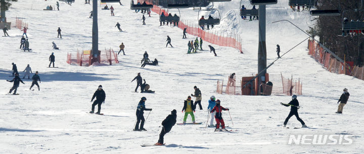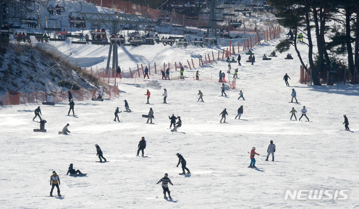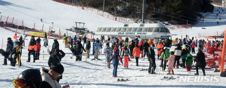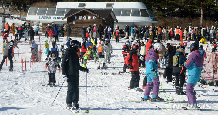 冬らしい寒い天気が続いている13日、全羅北道茂朱郡の茂朱德裕山リゾートは、スキーをするため集まった市民で混雑していた。