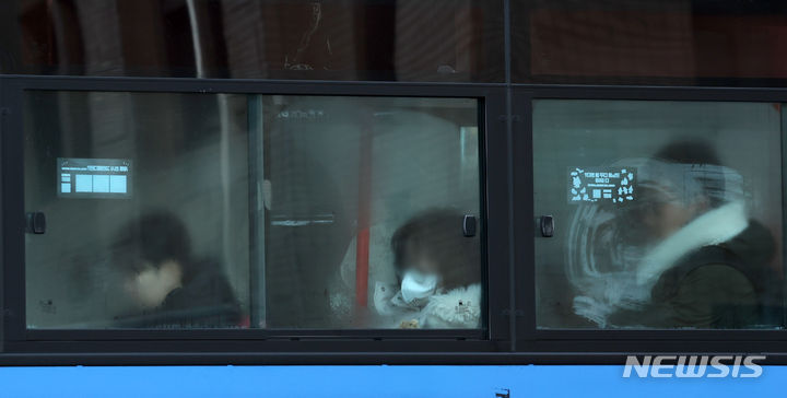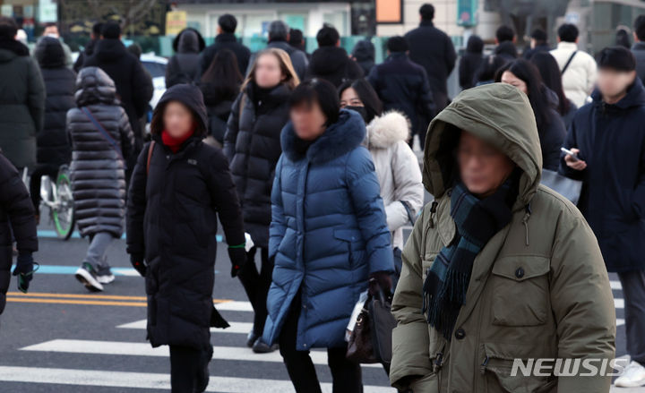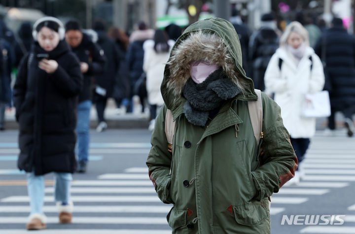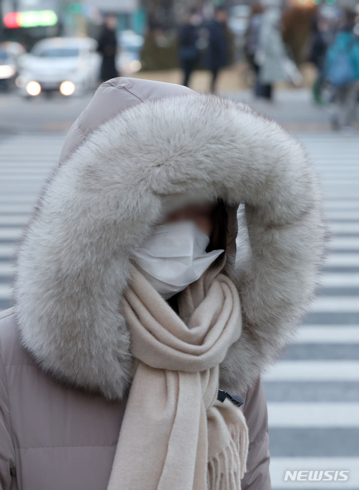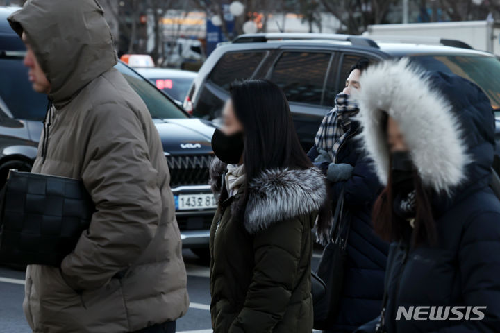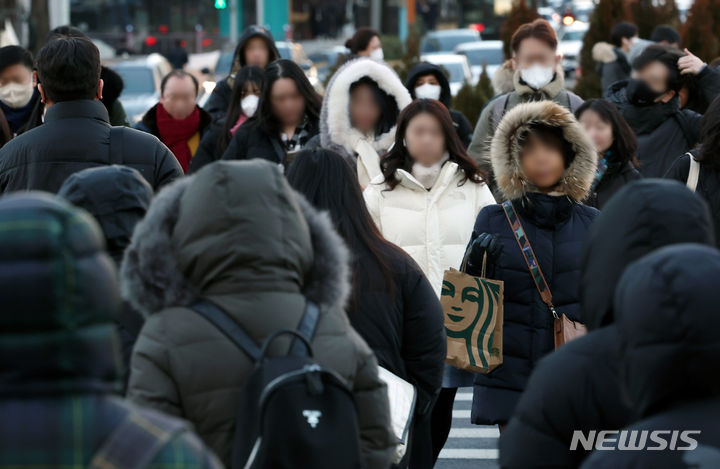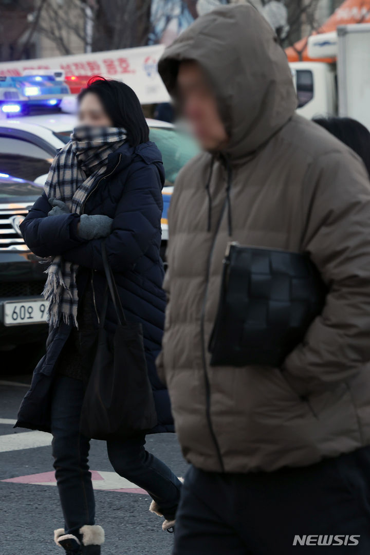 【NEWSIS】氷点下の寒さとなった15日午前、ソウル市鍾路区の世宗大路近くを歩く人々。ダウンジャケットのフードをかぶっている人が目立つ。
