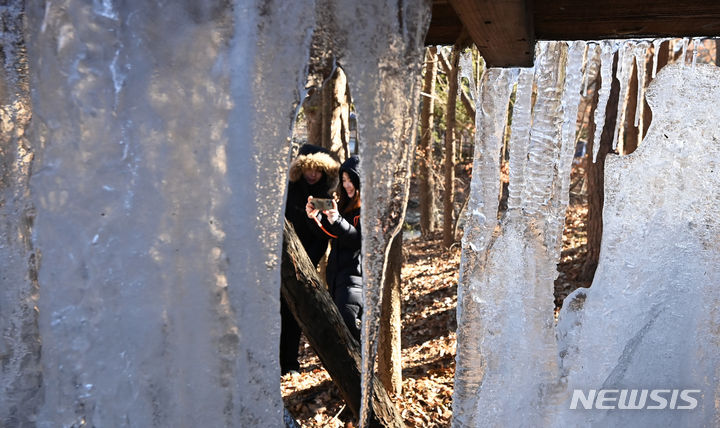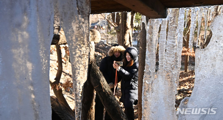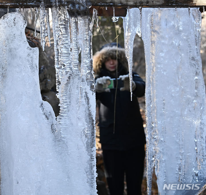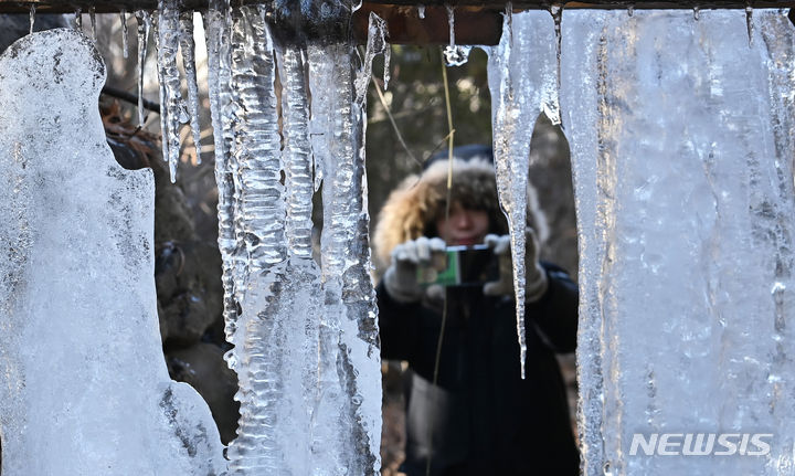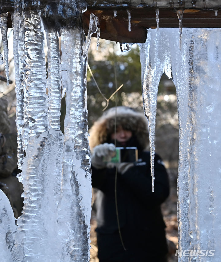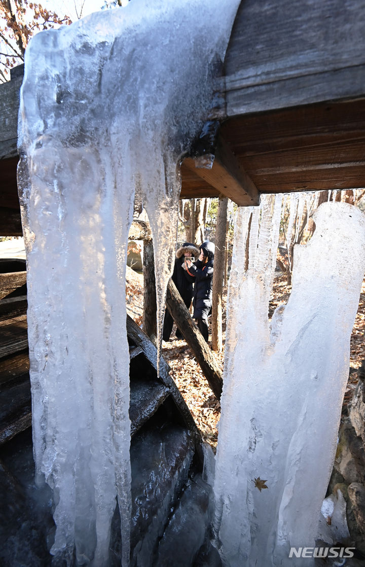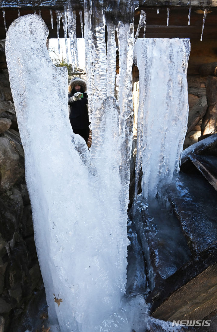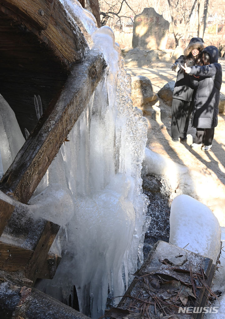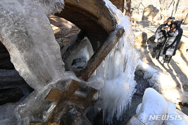 韓国首都圏一帯で零下の寒さとなった15日、京畿道竜仁市の韓国民俗村に設置された水車から「つらら」が垂れ下がっている様子。