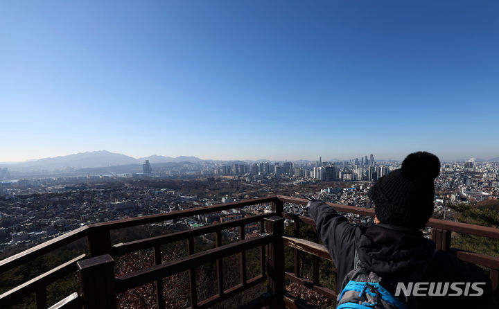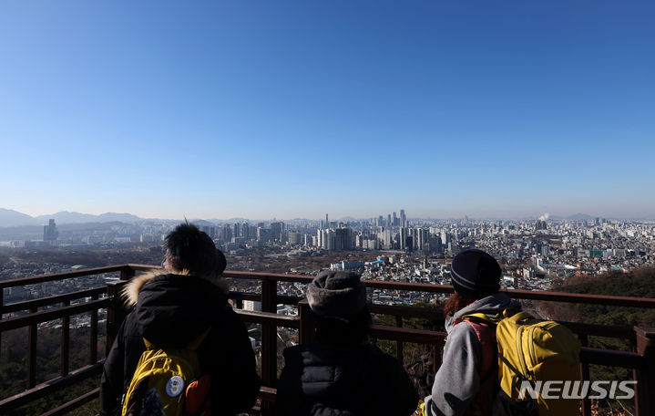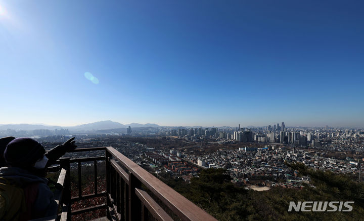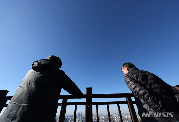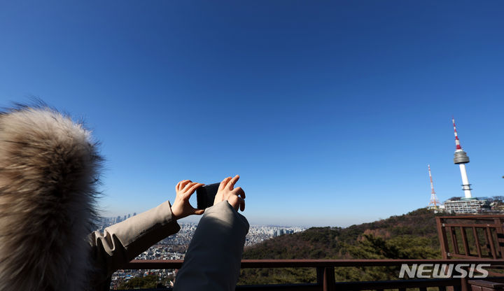 全国的におおむね晴れとなった15日、ソウル市中区の南山を訪れた市民たちが、青空とソウル都心を眺めている。