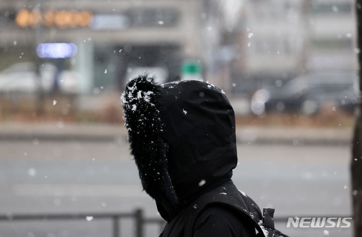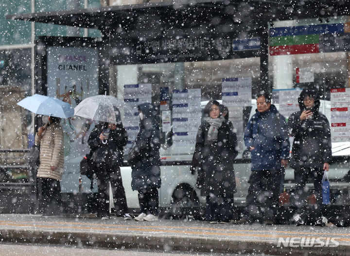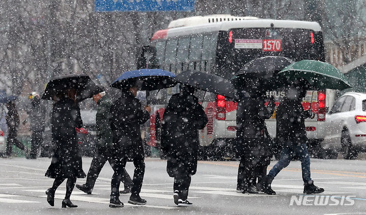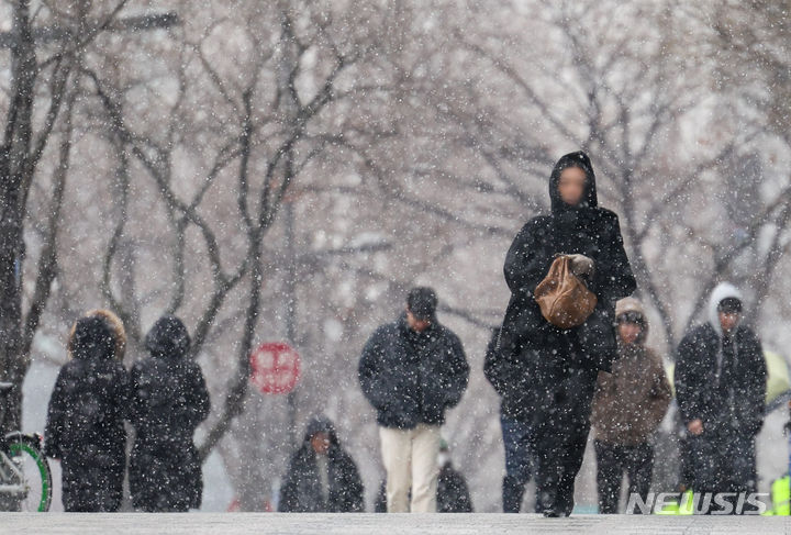 17日午後、雪の降る中、ソウル市鍾路区の街頭を行き交う市民の様子。