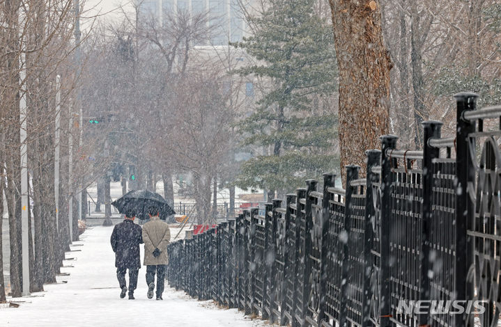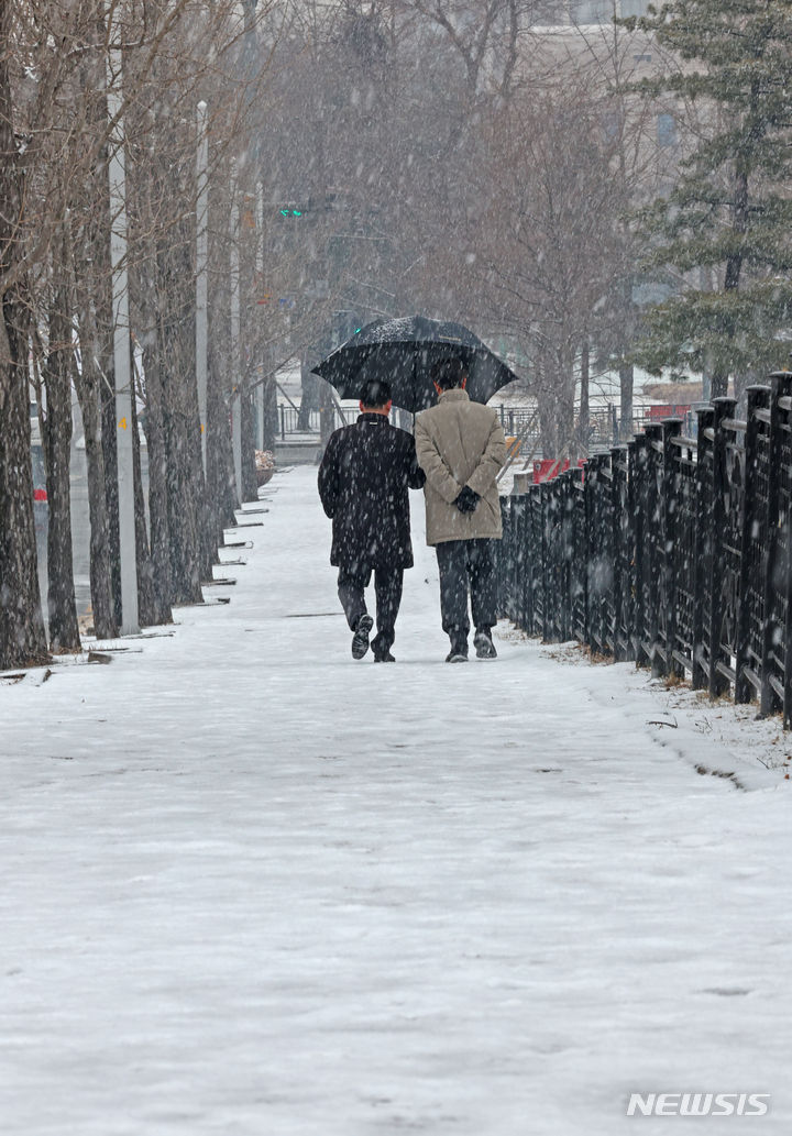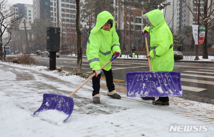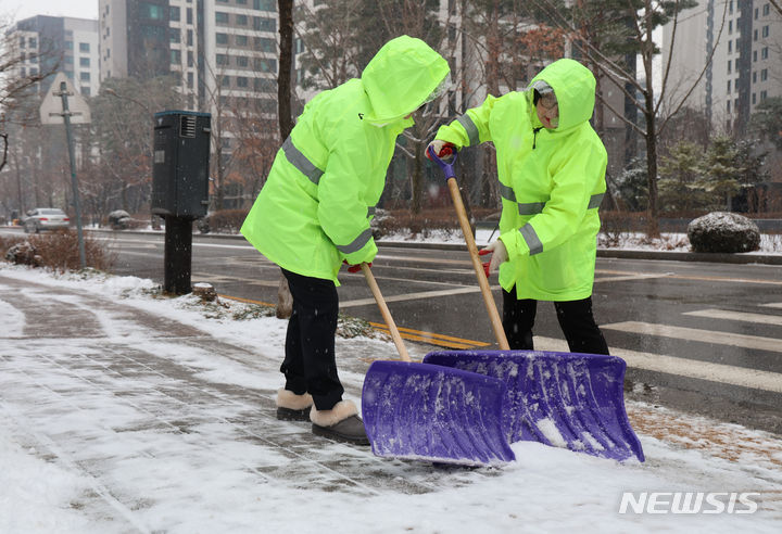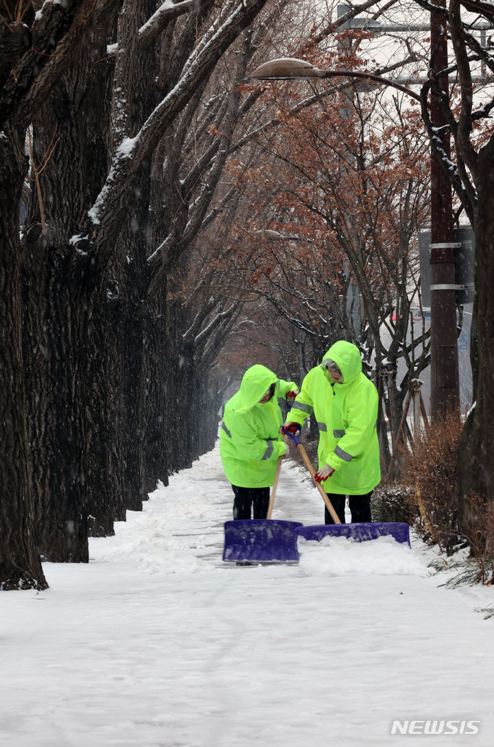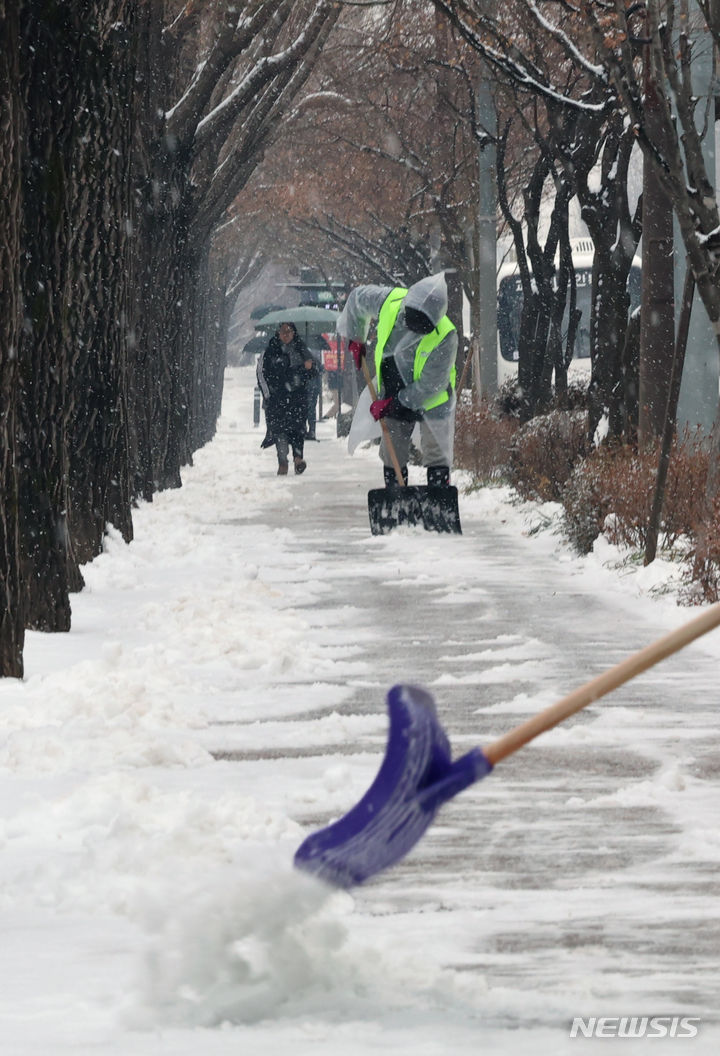 雪が降った17日午後、京畿道果川市の街角では、市民が除雪作業を行っていた。