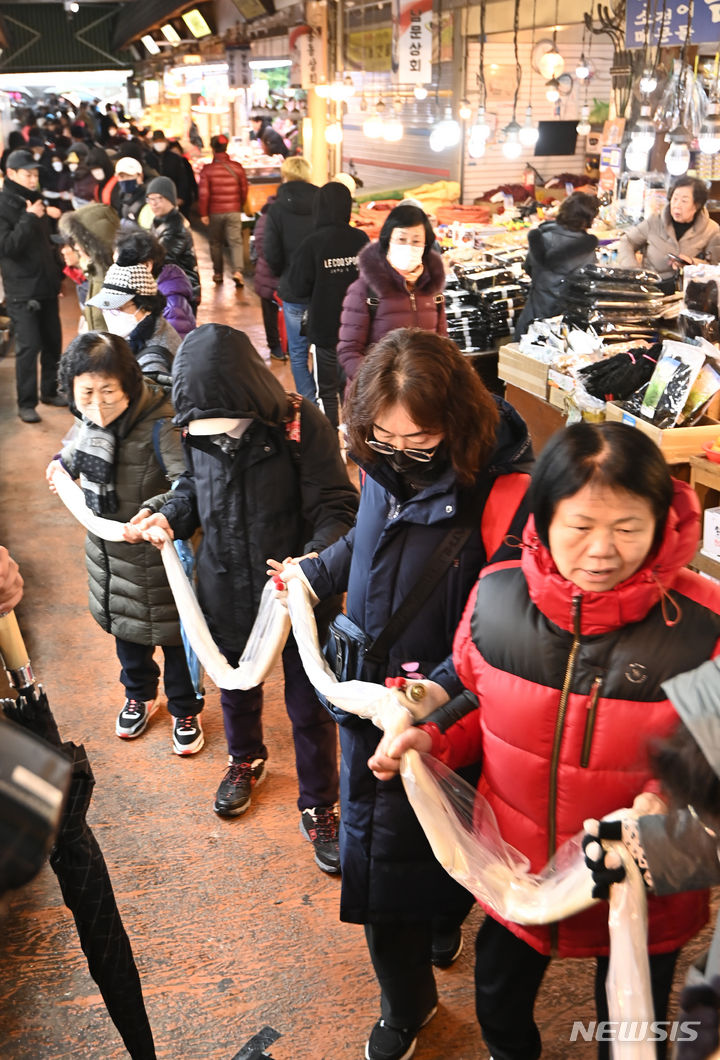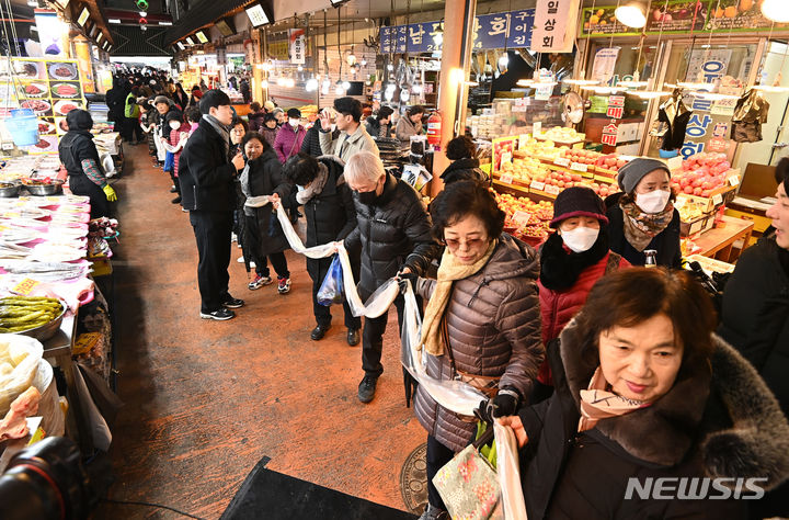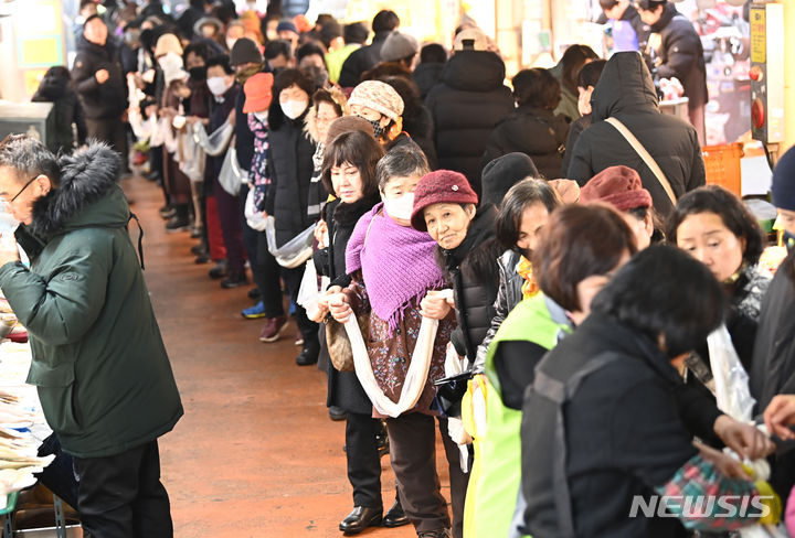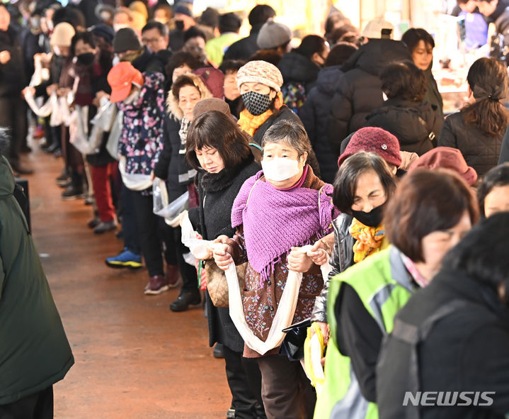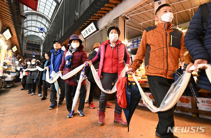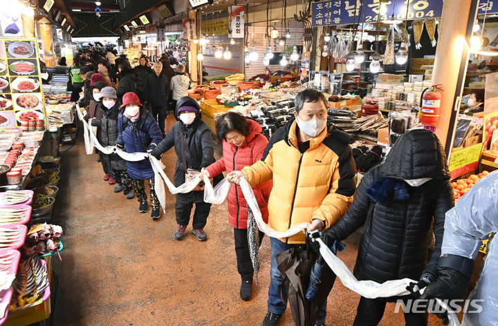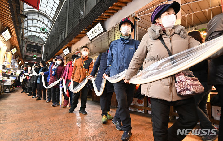 京畿道水原市八達区の「モッコル市場」で17日、「モッコル市場と一緒のカレトック分かち合い行事」が開かれ、参加した市場関係者や市民などが、長さ180メートルのカレトック(細長い棒状の餅)を並んで手に持つパフォーマンスをしているところ。新年を迎えて無病長寿を祈りつつ長いカレトックを伸ばしていく「カレトック分かち合い」は、モッコル市場の代表的な行事だ。