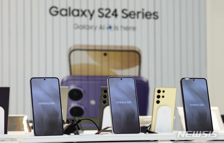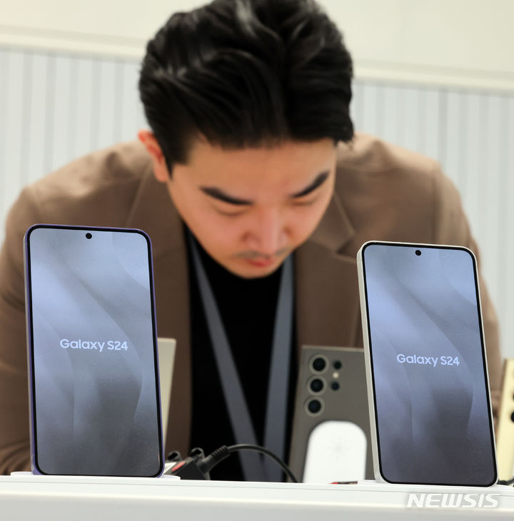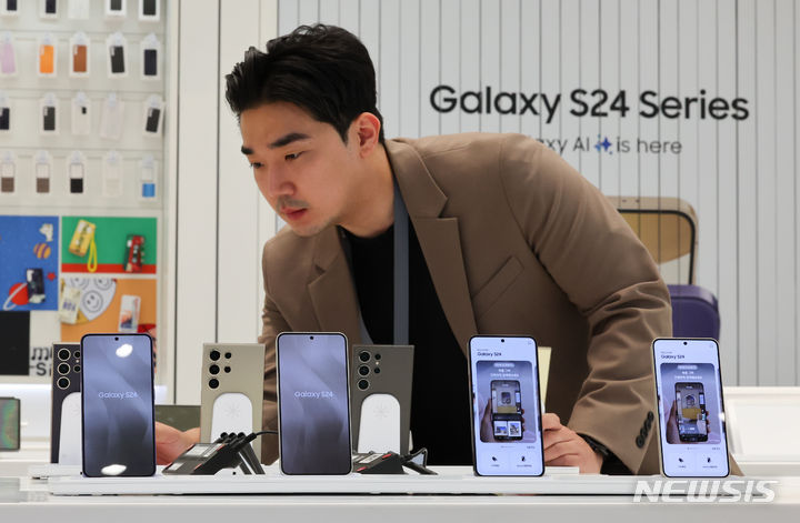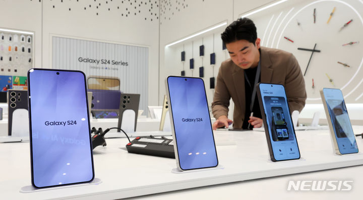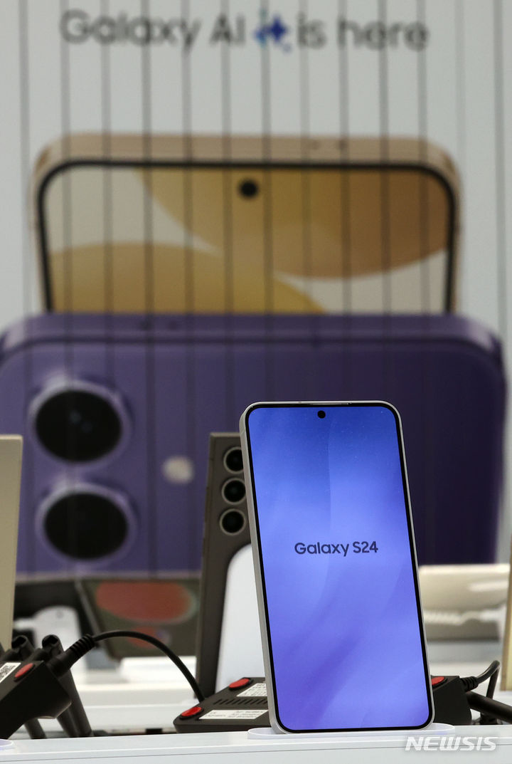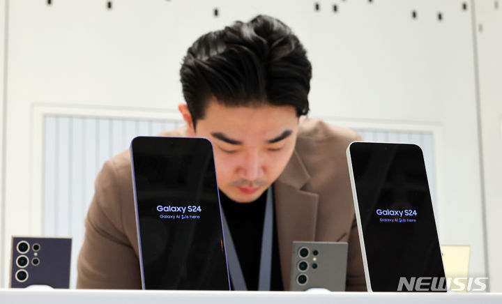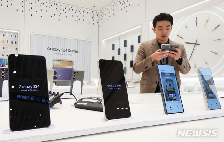 サムスン電子初のAIスマホ「Galaxy S24」シリーズが公開された18日、ソウル市麻浦区のサムスンストア弘大に展示されている「Galaxy S24」の様子。